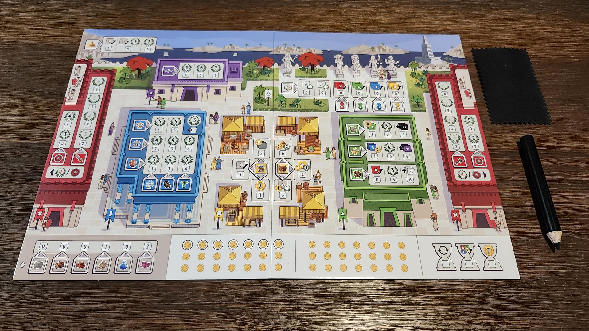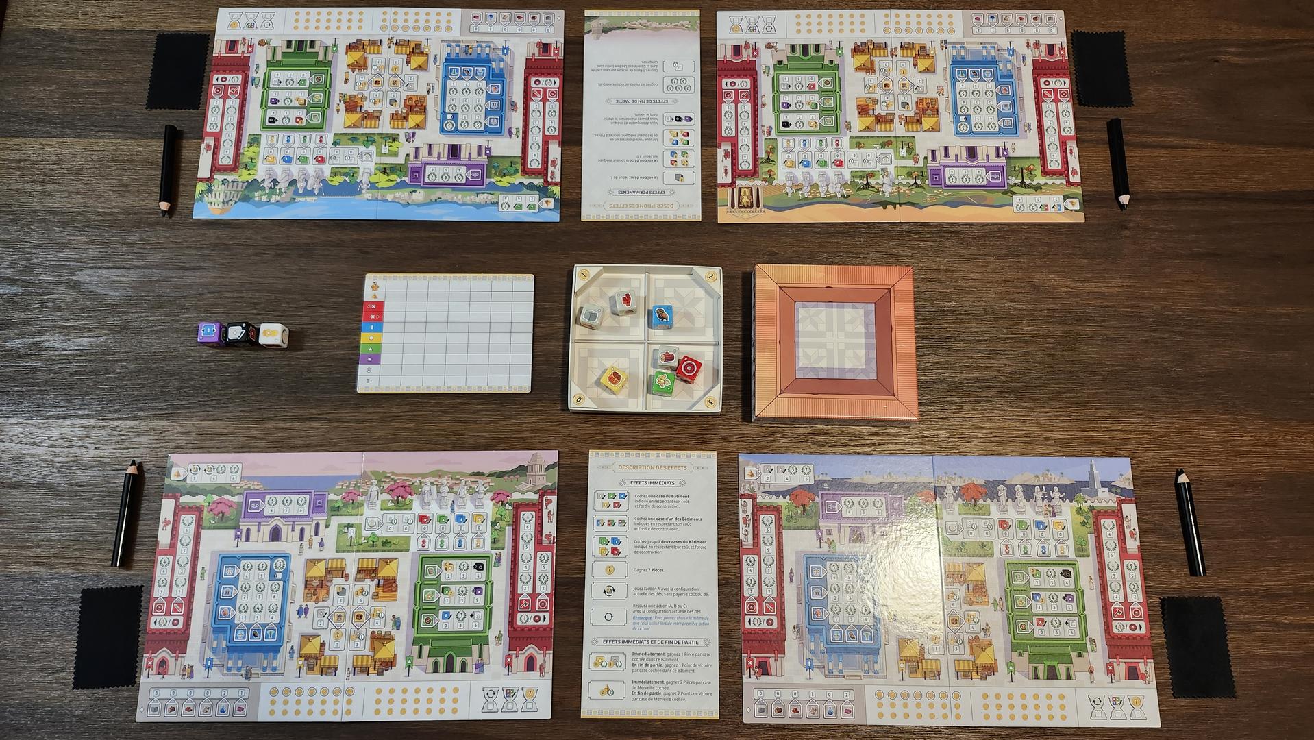 7 Wonders Dice est réellement très simple. Au début de la partie, chaque joueur reçoit un plateau de joueur sur lequel il pourra marquer des cases. Les plateaux sont tous légèrement différents, ce qui empêche deux joueurs de choisir exactement les mêmes dés au court de la partie et d’obtenir le même résultat. Toutefois, ces différences sont minimes, ce qui fait en sorte qu’aucun plateau n’est avantageux et que tous les joueurs ont les mêmes chances de gagner la partie. Une fois les plateaux distribués, chaque joueur reçoit un crayon et un chiffon pour effacer. Ensuite, les sept dés de base et le forum sont placés au centre de la table et le dé noir, le dé blanc et le dé mauve sont mis de côté pour plus tard. Vous êtes maintenant prêt à jouer! La mise en place ne prend qu’une minute et c’est l’un des points forts de 7 Wonders Dice!