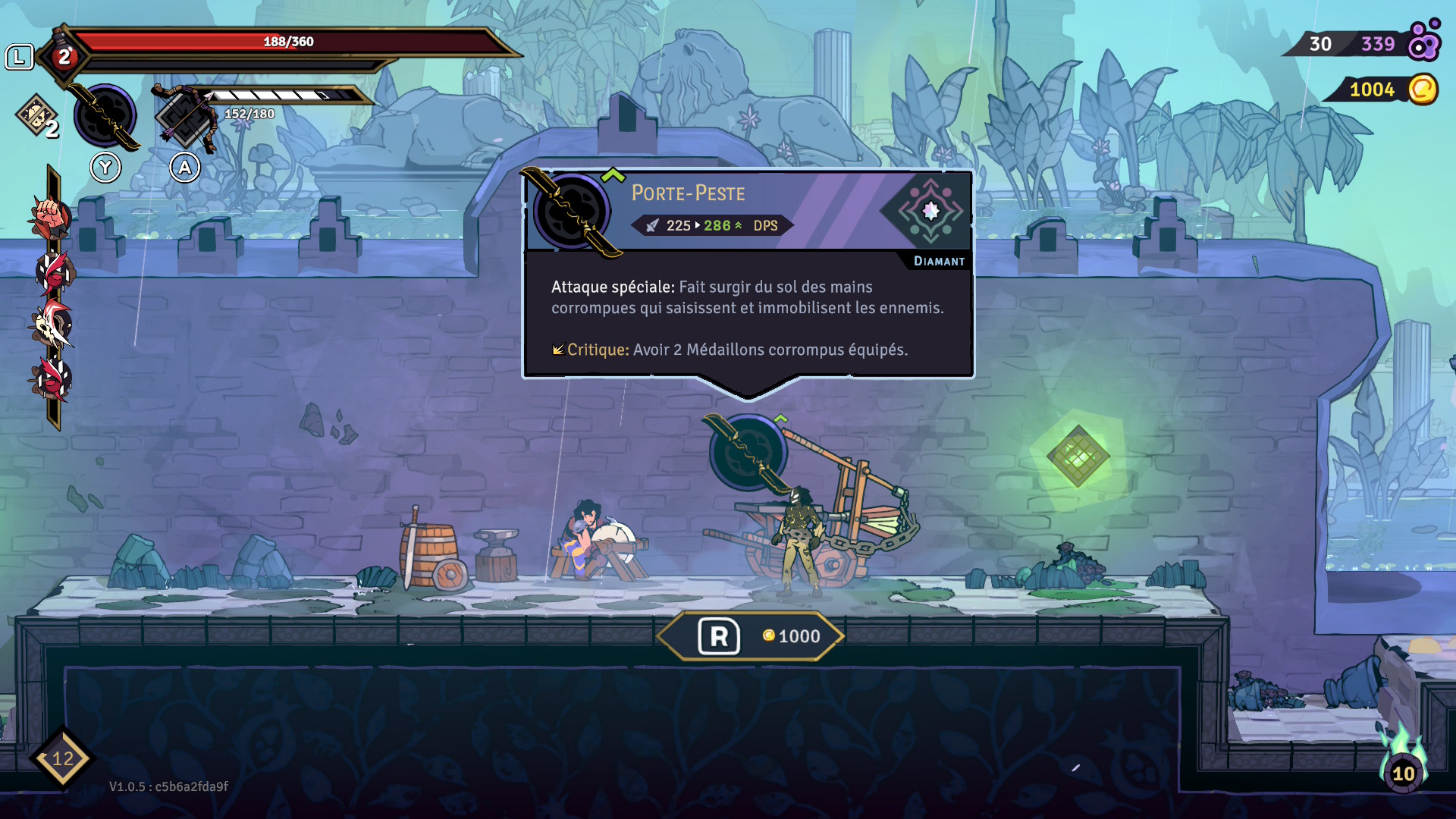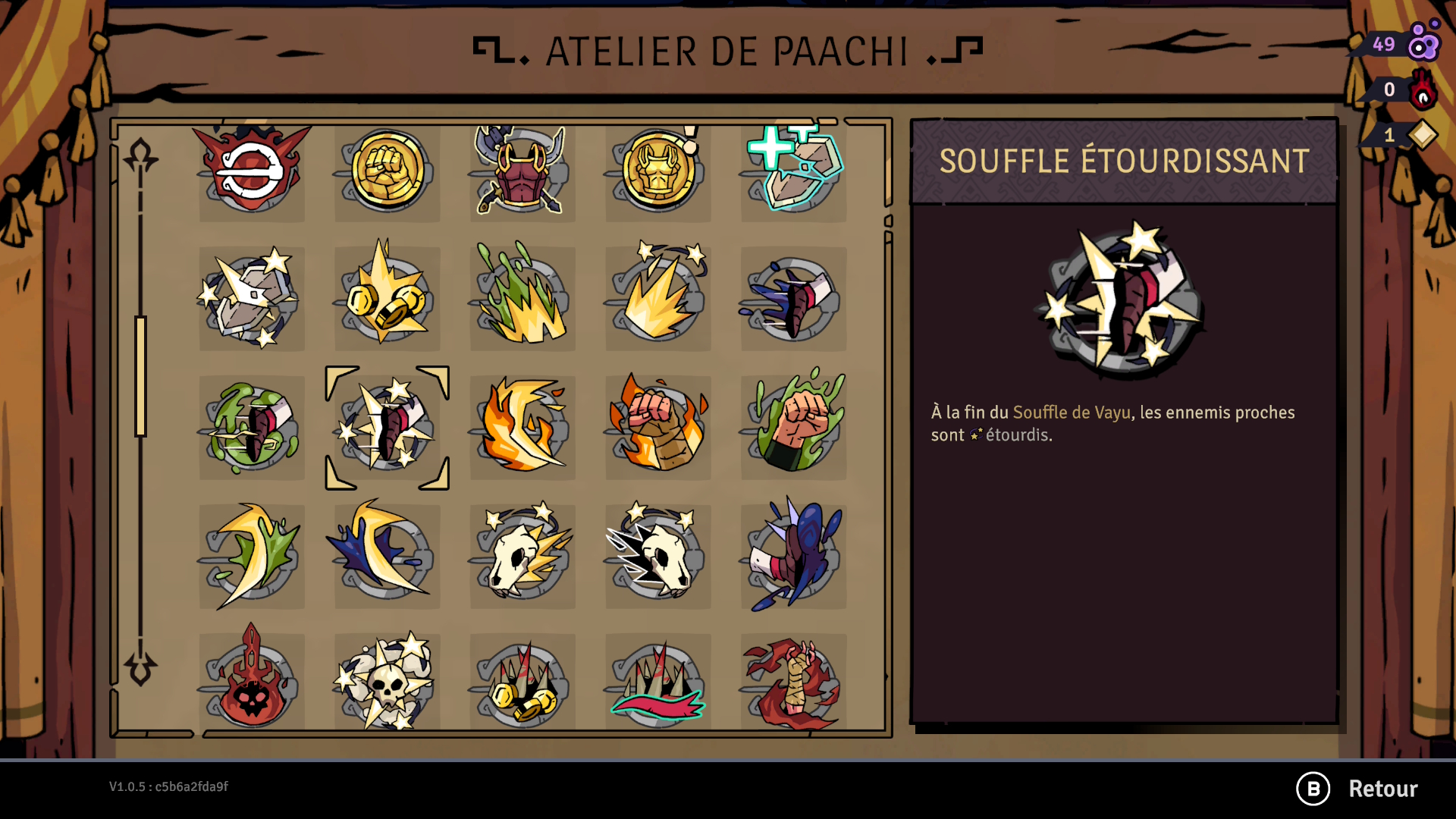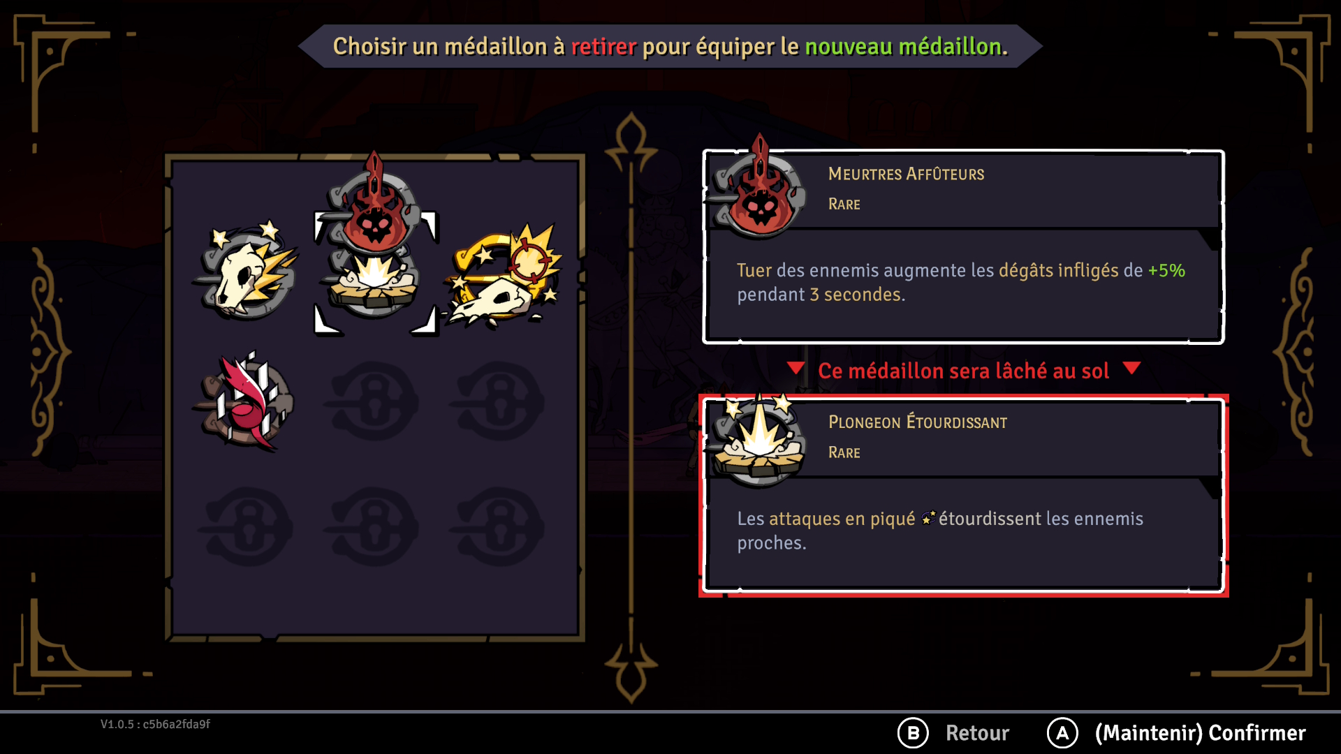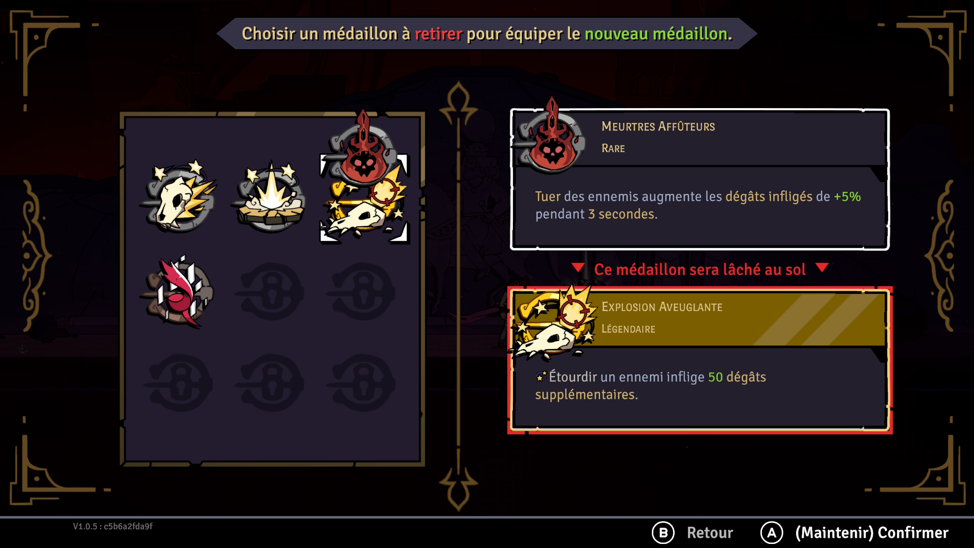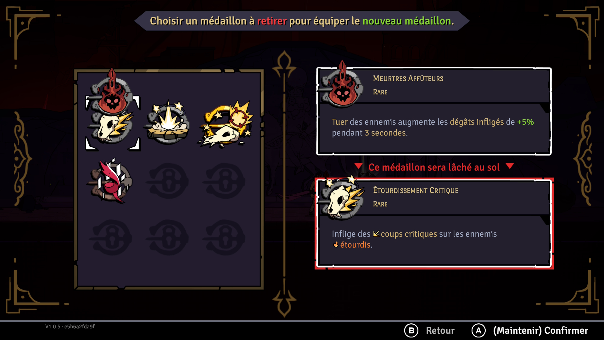 Les médaillons sont les objets qui ont le plus d’importance dans vos runs. Vous commencerez avec trois emplacements disponibles pour les équiper, mais vous pourrez en obtenir plus en cours de partie ou en utilisant des points d’aptitude. Chaque médaillon procure des effets bonus non négligeables et certains peuvent même être jumelés pour des effets améliorés. Par exemple, l’affûteur gauche, comme celui de droite, augmente le dégât des armes de 10%. Cependant, lorsque vous avez les deux en votre possession, ce bonus passe à 20%, et ce, pour chacun des médaillons. Ces combinaisons sont puissantes et plusieurs médaillons peuvent être combinés de la sorte. Il est aussi possible de créer des synergies qui s’adapteront à votre style de jeu, comme dans l’exemple que vous pourrez voir un peu plus bas. Au total, c’est 69 médaillons qui peuvent être déverrouillés!