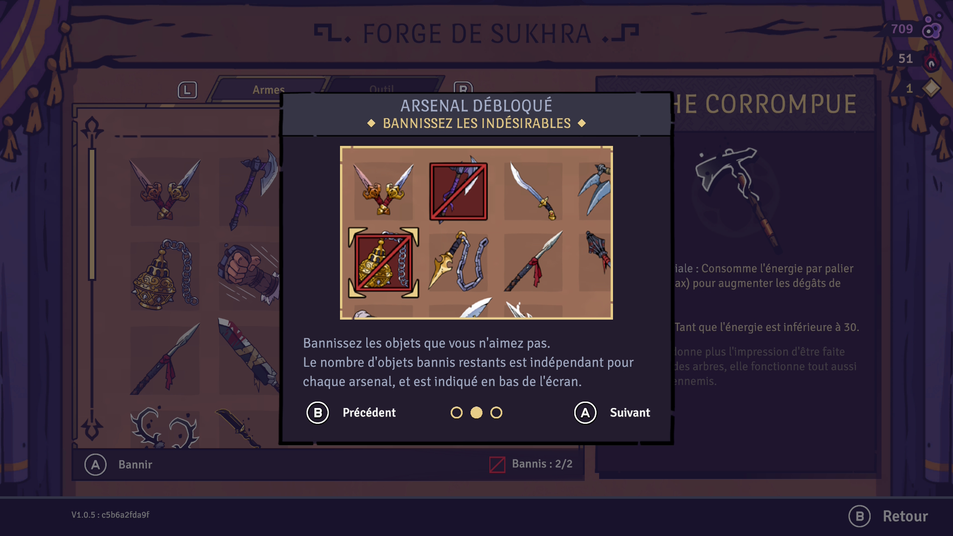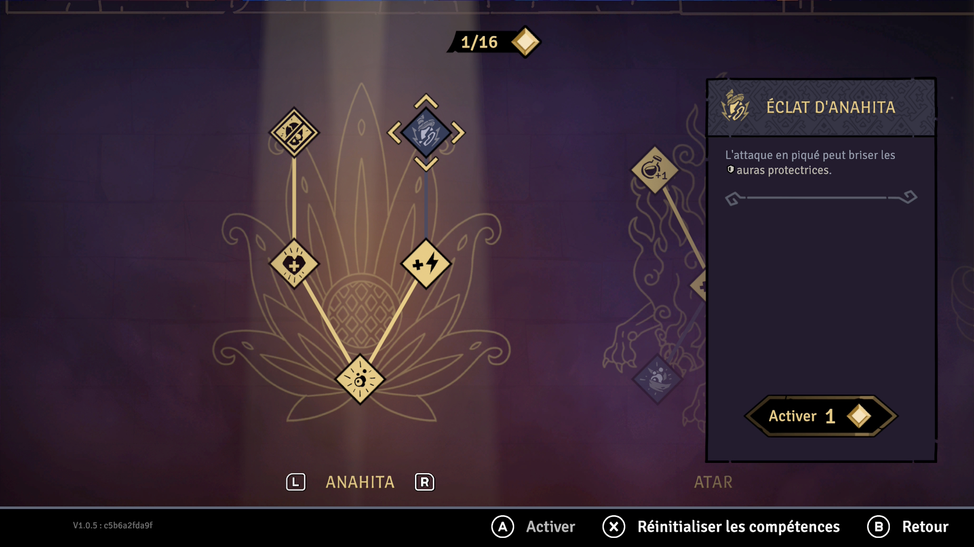 Lorsque vous aurez terminé le jeu pour la première fois, c’est-à-dire lorsque vous aurez vaincu le boss final, vous pourrez choisir entre trois modificateurs de difficulté qui vous permettront de rendre le jeu plus corsé, mais aussi d’obtenir plus de récompenses. Chaque modificateur à un niveau de difficulté déterminé par un nombre qui lui est assigné. Un modificateur de niveau 3 rendra la partie plus difficile et son effet sera appliqué à votre prochaine tentative. Plus vous choisissez de modificateurs, plus vos tentatives deviendront difficiles, mais plus elles seront lucratives. Par exemple, en combinant plusieurs modificateurs pour obtenir un niveau de difficulté 10, vous obtiendrez de nouvelles tenues et toutes les récompenses précédentes, soit trois points d’aptitude, si vous parvenez à compléter la tentative avec succès. J’ai beaucoup aimé le fait qu’il ne s’agisse pas simplement d’augmenter la difficulté. Vous choisissez vous-même les modificateurs, alors vous pouvez personnaliser l’expérience et la rendre plus difficile, mais en choisissant chacun des aspects.