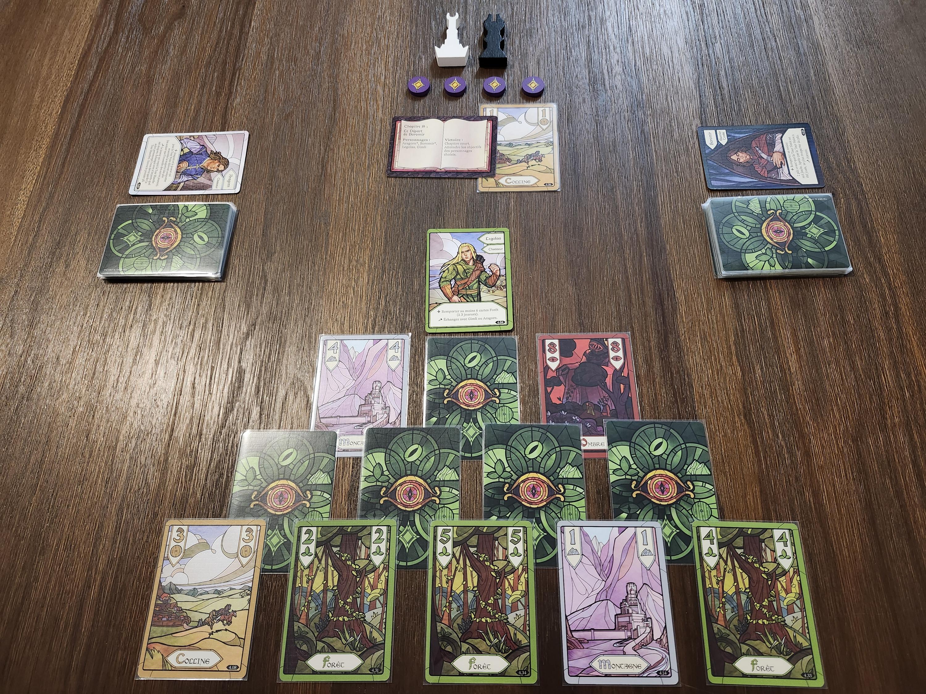 Bien que Les Deux Tours soit principalement conçu pour être joué avec trois ou quatre joueurs, un mode deux joueurs est aussi inclus. Heureusement, il ne s’agit pas que d’une simple variante deux joueurs qui ne colle pas avec le jeu comme nous le voyons souvent dans d’autres productions. Ici, le mode deux joueurs est parfaitement intégré et il ajoute même une couche de casse-tête très agréable au système en place. Je vous explique; lors des parties à deux joueurs, trois paquets seront distribués et l’un des trois paquets sera utilisé pour le joueur fantôme. Les cartes du joueur fantôme seront placées en forme de pyramide avec certaines cartes visibles et d’autres faces cachées (voir les images ci-dessous). Lors de la partie, un des joueurs sera responsable du choix des cartes qui seront jouées. Lors de chaque pli, n’importe laquelle des cartes visibles dans la pyramide peut être choisie en respectant les règles de jeu habituelles. Les cartes visibles permettent aux deux joueurs de prévoir la carte qui sera choisie et de jouer des cartes en conséquence. Lorsqu’une carte face cachée sera libérée, elle sera retournée face visible et pourra désormais être choisie lors des futurs tours.