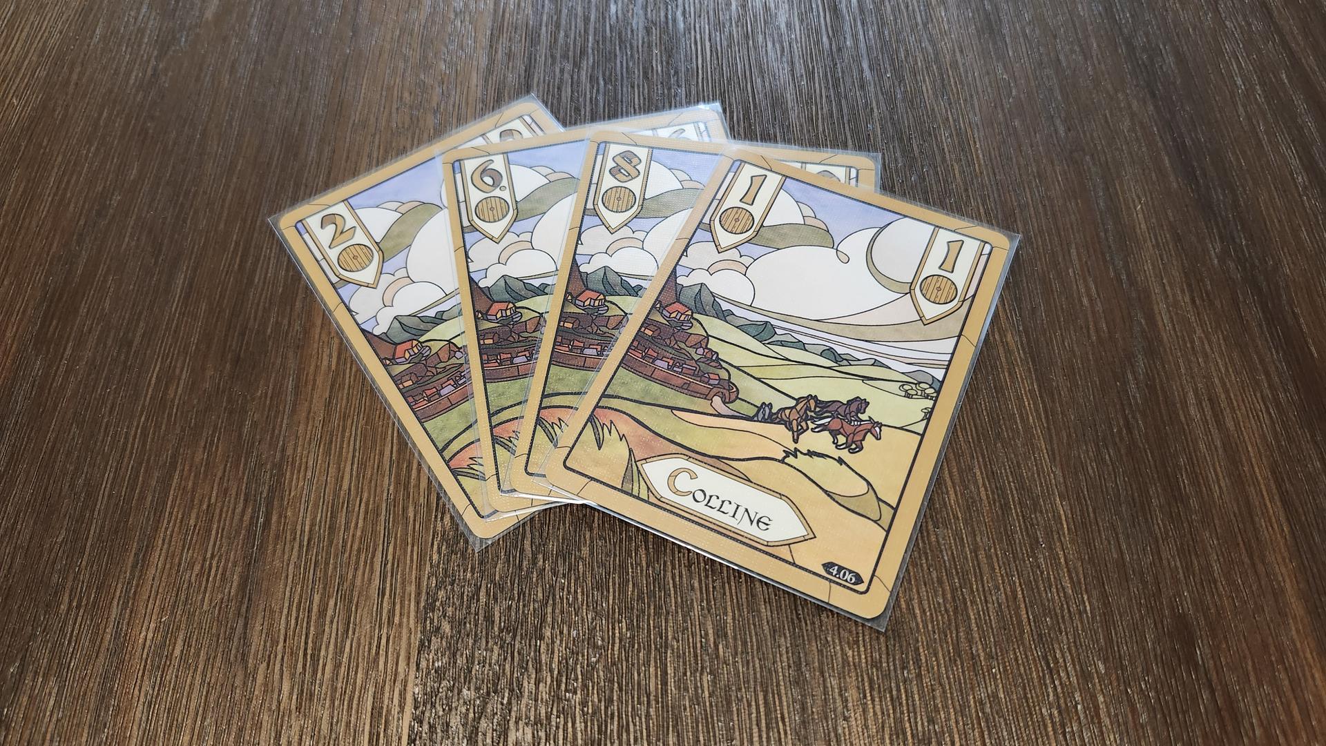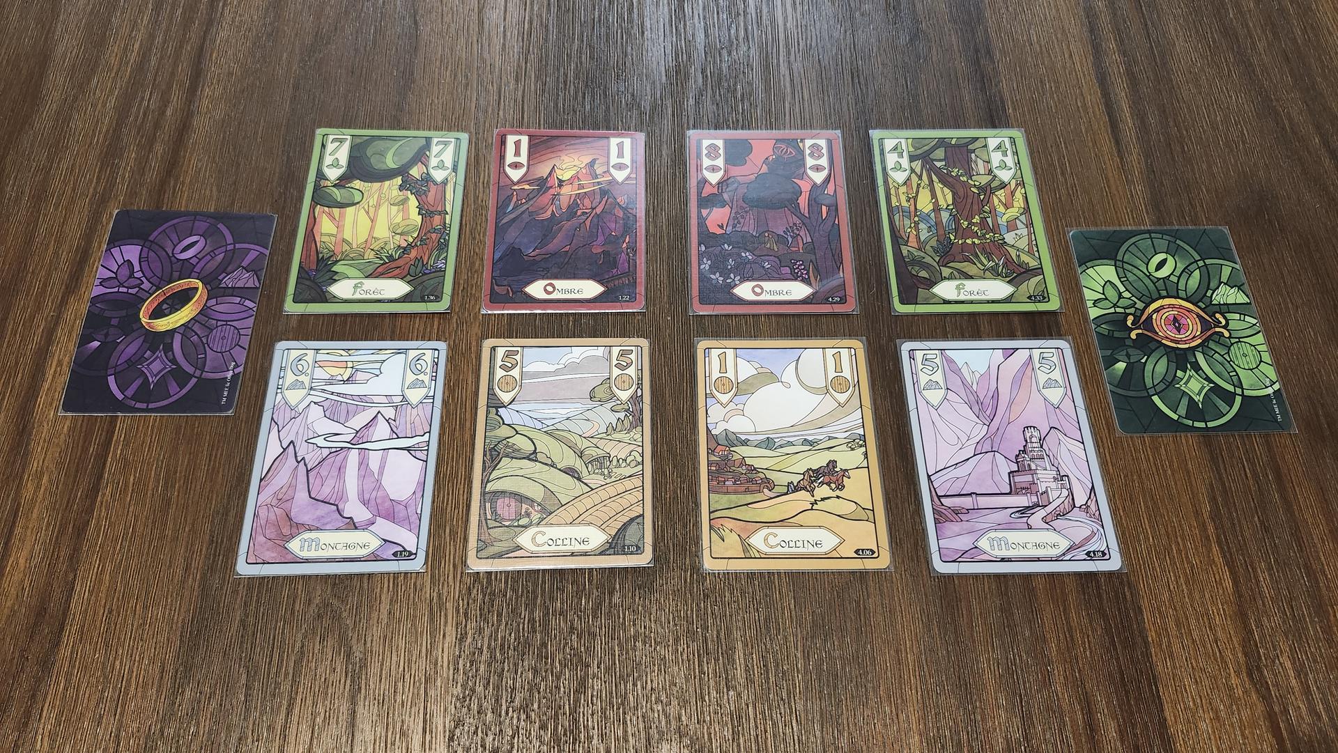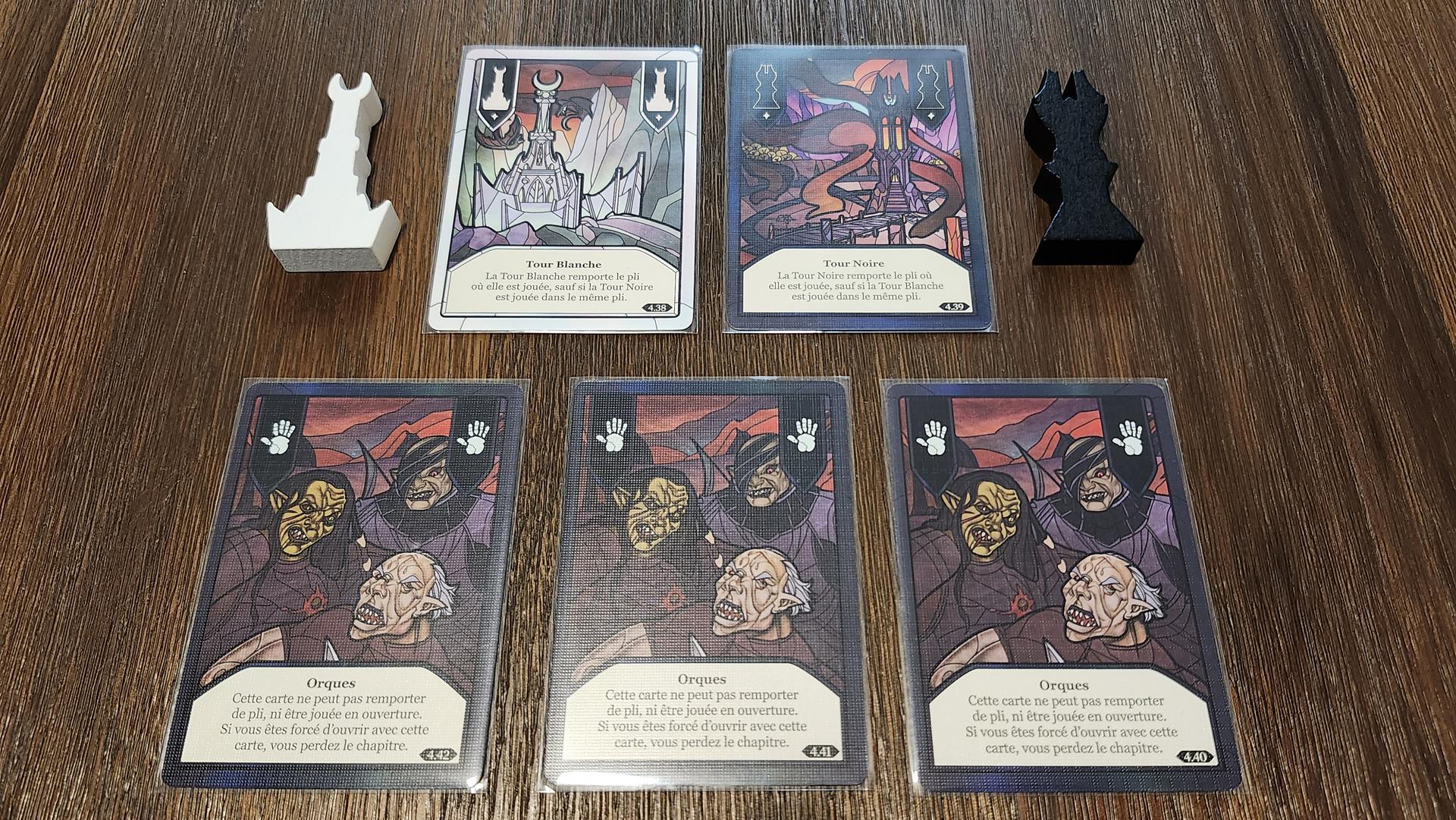 Dans Les Deux Tours, vous travaillerez avec un paquet de 37 cartes: huit cartes de quatre suites différentes (collines, forêts, montagnes et ombres), les deux tours et trois cartes orcs. Les deux tours, la Tour Blanche et la Tour Noire sont des jokers et vous assurent de remporter la main à moins qu’elles soient jouées dans le même pli, ce qui annulera leur effet. À l’inverse, les cartes orcs vous assurent de perdre la main, mais si vous ouvrez le jeu avec une carte orc, tous les joueurs perdent la partie. Dans les rares cas où une main n’est composée que des deux tours et de cartes orcs, personne ne remporte le pli et la main est mise de côté.