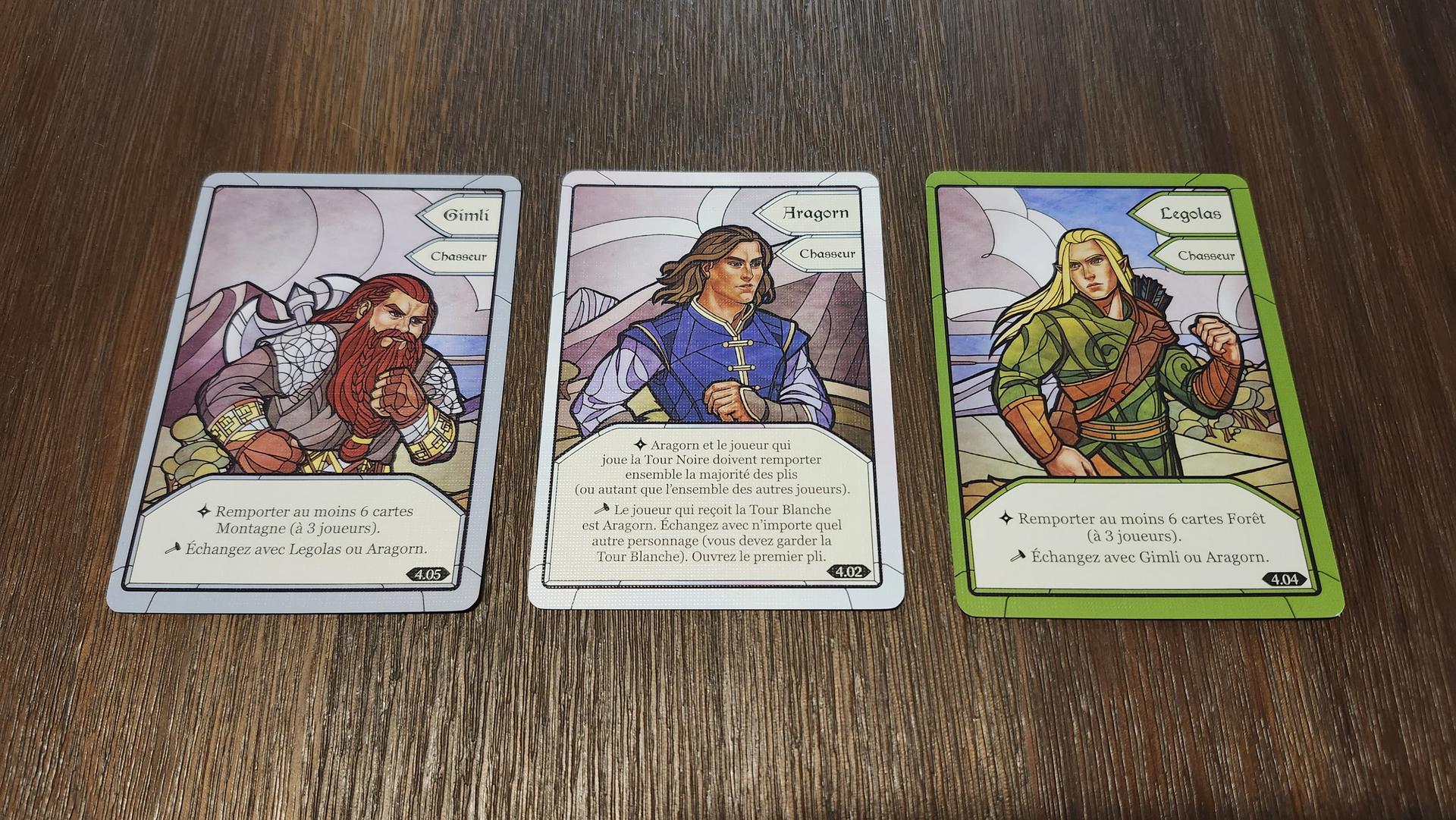 Le jeu se déroule en chapitres, tout comme le premier jeu. Dans Les Deux Tours, vous pourrez compléter les chapitres 19 à 32 qui représentent les événements de la mort de Boromir jusqu’à la rencontre avec Arachne en passant par la forêt de Fangorn avec Sylvebarbe et la rencontre avec Théoden . Dans chacun des chapitres, de nouveaux personnages feront leur apparition. Il s’agit non seulement de moments thématiques dans lesquels vous pourrez incarner vos personnages favoris, mais aussi d’une occasion d’affronter un nouveau défi. En effet, chaque personnage possède une mission personnelle différente et c’est ces missions qui font varier la jouabilité et qui apportent de nouvelles mécaniques de jeu. Dans tous les chapitres, vous aurez des personnages principaux et des personnages secondaires. Les personnages principaux doivent obligatoirement faire partie du chapitre et les autres sont aux choix des joueurs. Dans Les Deux Tours, Aragorn est le personnage vedette. Lorsqu’il est présent, le joueur qui se voit distribuer la Tour Blanche lors de la distribution des cartes incarne automatiquement Aragorn. Ensuite, les autres joueurs choisissent un personnage à tour de rôle en tentant de choisir un personnage dont la mission correspond aux cartes reçues. Les missions de chaque personnage varient énormément. Par exemple, Aragorn et le joueur qui joue la Tour Noire doivent remporter ensemble la majorité des plis, tandis que Legolas doit remporter au moins six cartes forêt à trois joueurs et quatre cartes forêt à quatre joueurs. Vos chances de réussite sont influencées par les cartes que vous aurez pigées, c’est pourquoi il est important de choisir le personnage qui correspond le mieux aux cartes reçues. Heureusement, certains personnages vous permettront d’échanger des cartes avec d’autres personnages, ce qui vous permettra d’augmenter vos chances de réussite.