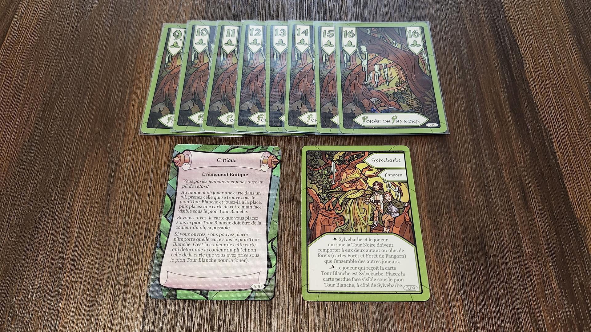 Les différents chapitres apportent aussi des mécaniques de jeu uniques. La forêt de Fangorn, le chapitre 22, est un bon exemple de ceci. Pour ce chapitre, les huit cartes collines sont enlevées du paquet et remplacées par huit cartes forêt supplémentaires, soit les cartes 9 à 16. En plus de ce changement majeur, Sylvebarbe et le joueur qui joue la Tour Noire doivent remporter à eux deux autant ou plus de cartes forêt que l’ensemble des autres joueurs. De plus, pour ce chapitre, la carte « Événement Entique » est en vigueur. Cet événement oblige Sylvebarbe (qui sera incarné par le joueur qui reçoit la Tour Blanche) à placer la carte perdue devant lui sous la Tour Blanche. Lorsque Sylvebarbe jouera une carte, il devra plutôt utiliser celle qui se trouve sous la Tour Blanche et la carte qu’il désire jouer la remplacera. Il joue donc à retardement, ce qui change drastiquement le rythme de jeu!