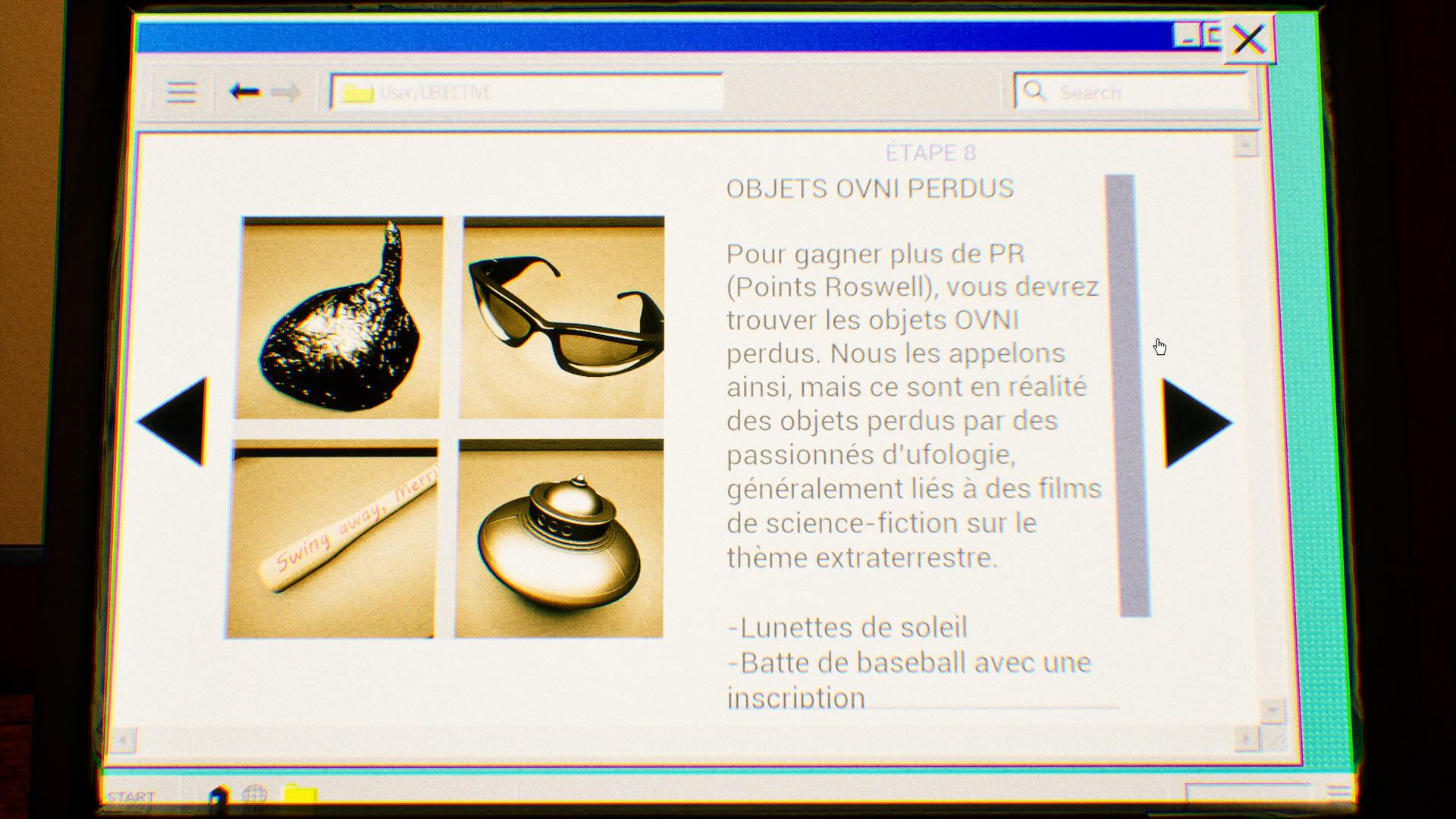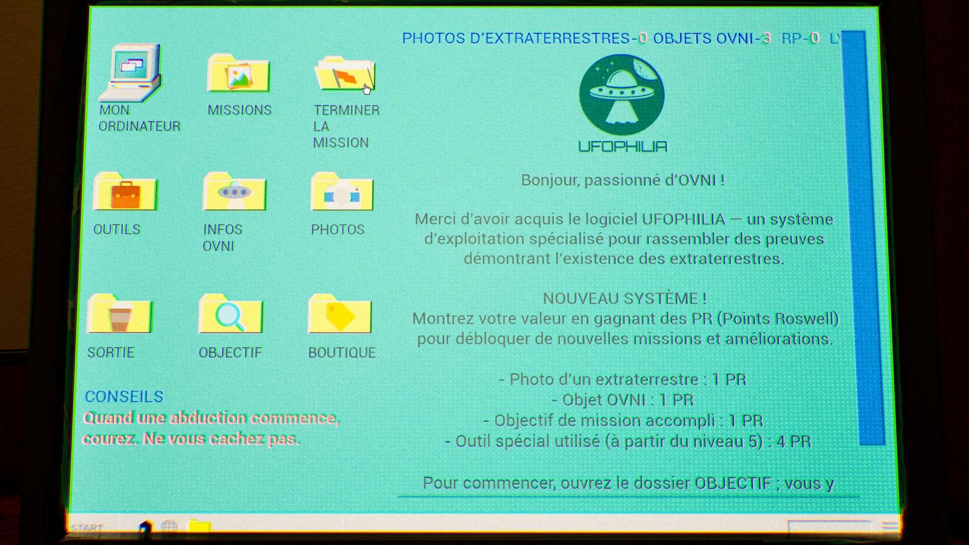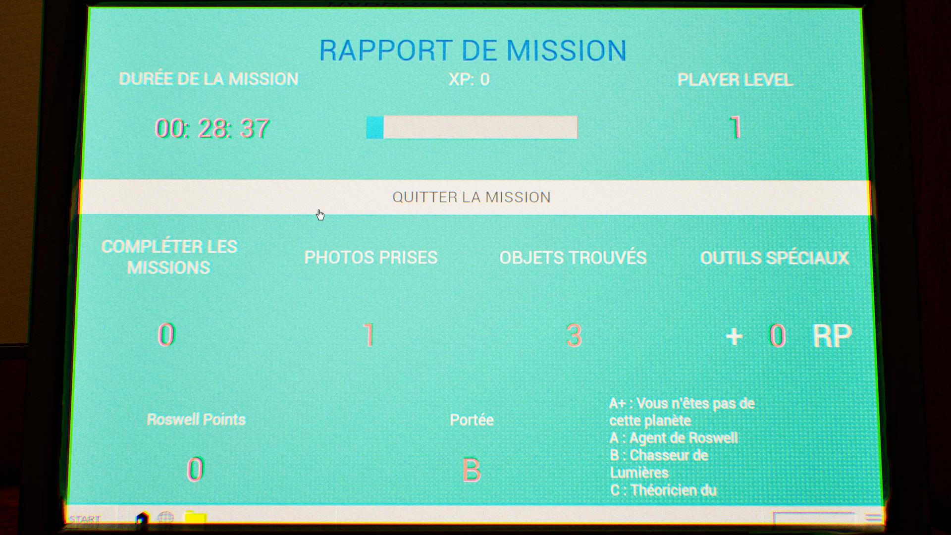 Comme je l’ai mentionné au début de cette critique, une seule mission est disponible au départ, soit l’enquête dans la maison de la famille Jones. Afin de pouvoir visiter de nouveaux lieux, vous devrez accumuler des « Points Roswell ». Ceux-ci s’obtiennent en complétant des objectifs de mission, en trouvant des objets « OVNI » et en prenant des photos d’extraterrestres. Chaque action rapporte un « PR » et, à partir du niveau cinq, il devient possible d’en gagner davantage grâce à l’utilisation d’outils spéciaux.