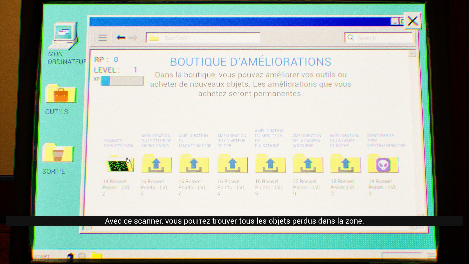 Je ne décrirai pas chaque outil, puisque toutes leurs descriptions sont accessibles directement sur votre ordinateur. D’ailleurs, cet ordinateur est l’élément central de l’expérience: vous l’utiliserez constamment pour démarrer ou quitter une mission, lancer la phase quatre, consulter les informations pertinentes sur les outils et les différents types d’extraterrestres, noter les anomalies observées et formuler vos hypothèses. Il est également possible d’accéder à certains outils à distance, comme la caméra. De plus, en accumulant suffisamment de « PR », vous pourrez améliorer votre équipement et en obtenir de nouveaux en consultant le dossier « Boutique ». J’ai trouvé les descriptions des équipements assez complètes et j’ai particulièrement aimé devoir fouiller dans les dossiers sur l’ordinateur, une approche qui se démarque des menus de jeu plus traditionnels.