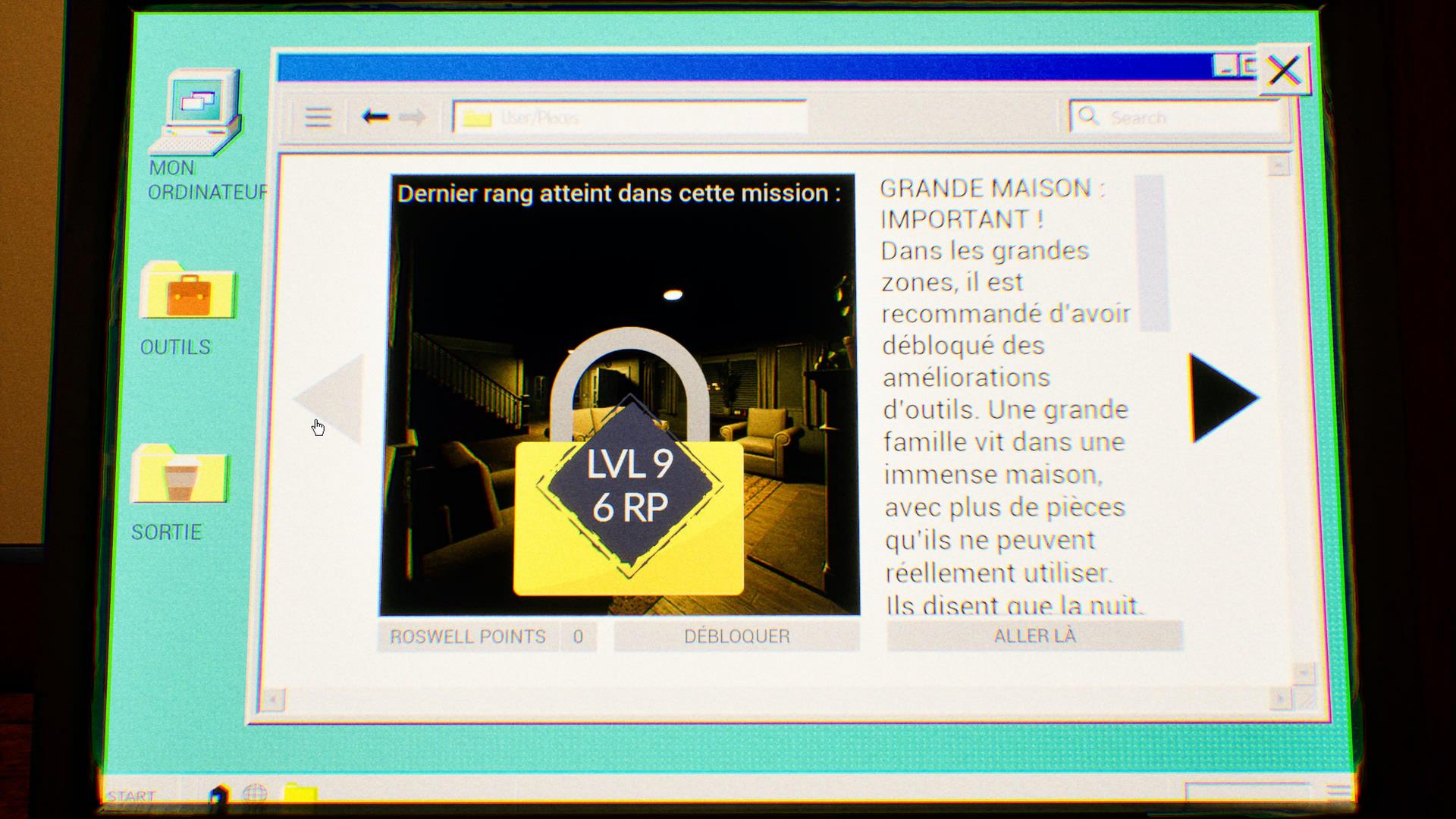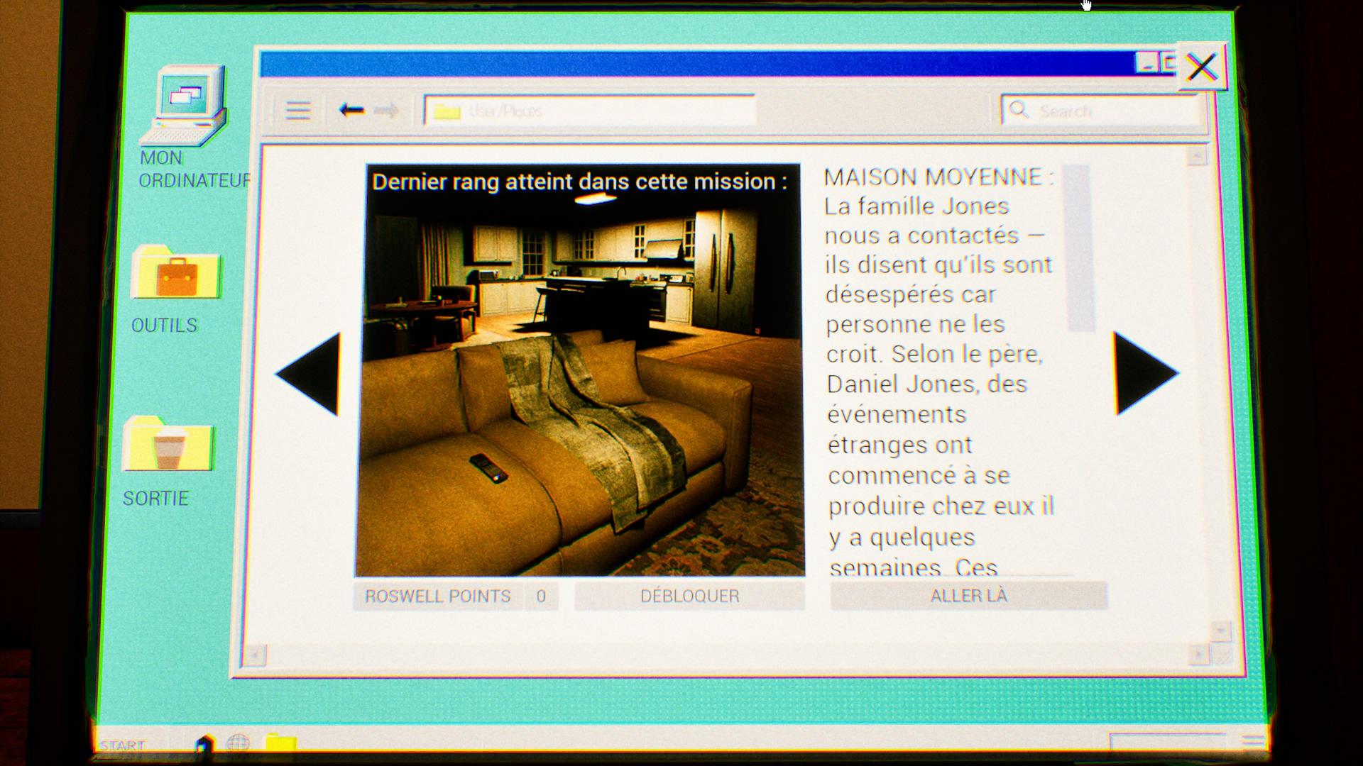 Bien installé dans votre véhicule récréatif, vous commencerez la partie à la tombée de la nuit, car, bien évidemment, les extraterrestres ne se manifestent qu’une fois le soleil couché. Dès les premières minutes, vous êtes libre d’interagir avec vos outils et de consulter votre ordinateur portable, qui regroupe plusieurs dossiers importants, dont celui des missions. Je vous conseille fortement de lire d’abord la description de chaque outil ainsi que celle des différents types d’extraterrestres, sans oublier de participer à la mission d’entraînement, qui explique les mécaniques essentielles du jeu. Lorsque vous serez prêt, vous pourrez sélectionner votre première mission. Malheureusement, un seul choix s’offre à vous au départ: la maison moyenne. Pour déverrouiller les environnements suivants, vous devrez accumuler assez de « Points Roswell », également appelés «PR», et augmenter de niveau. J’aborderai le sujet un peu plus tard.