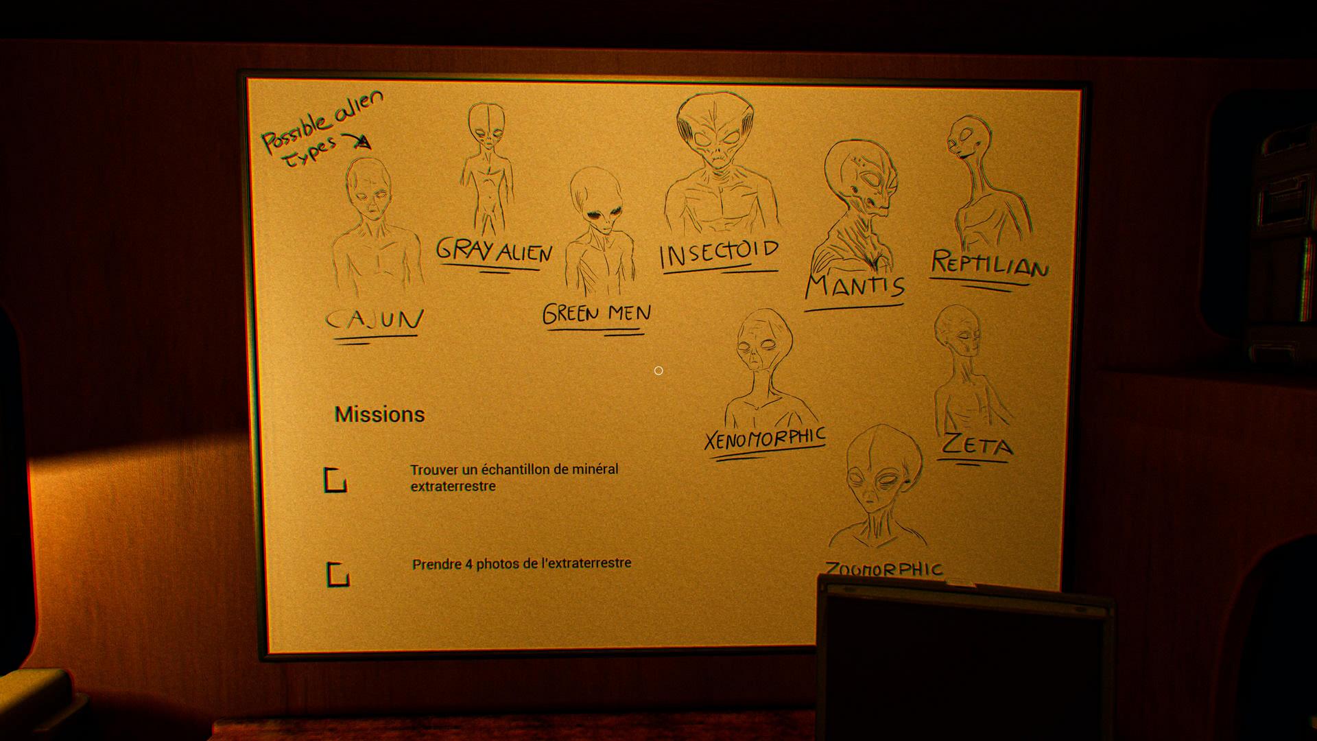 Lors de votre première mission, vous serez, encore une fois, bien installé dans votre véhicule récréatif. Sur le babillard, situé derrière l’ordinateur portable, apparaissent des objectifs de mission aléatoires à accomplir. Vous pouvez explorer l’endroit librement pour découvrir le lieu d’apparition et le type d’extraterrestre présent dans la maison. Pour vous aider, plusieurs outils sont mis à votre disposition et, plus vous utilisez d’outils, plus les anomalies et les apparitions seront fréquentes. Dans certains cas, cela peut même déclencher une tentative d’enlèvement, ce qui mettra immédiatement fin à la mission si l’extraterrestre parvient à vous attraper.