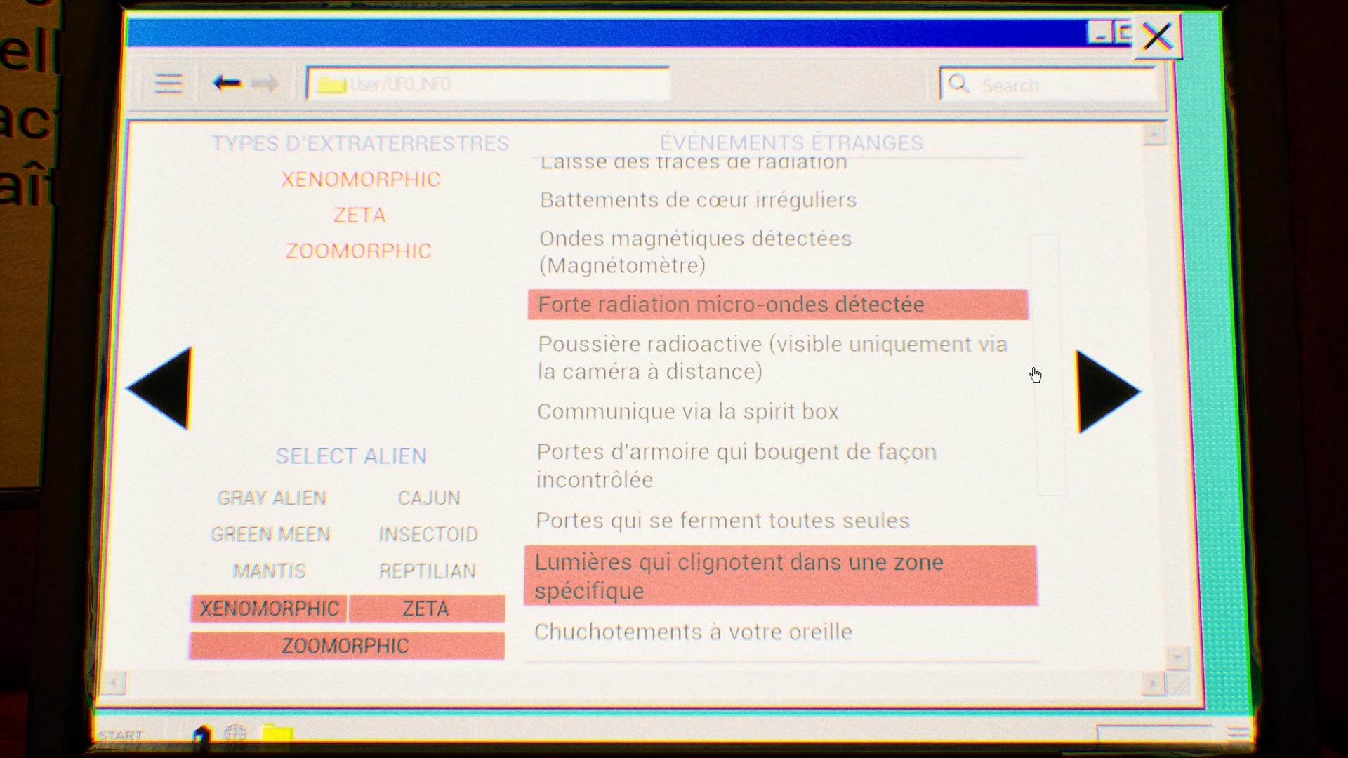 L’essence même d’UFOPHILIA repose avant tout sur son ambiance. Vous serez toujours seul, plongé dans le silence et l’obscurité, constamment confronté à de soudaines manifestations d’anomalies, d’apparitions et de bruits inquiétants. Sans cette atmosphère oppressante et angoissante, le jeu ne serait qu’un simple jeu d’enquêtes sur le thème des extraterrestres. Le studio de développement K148 a réussi à créer une expérience qui évoque celle d’un véritable film d’horreur. Dès le menu principal, il vous est d’ailleurs suggéré d’utiliser des écouteurs afin de profiter pleinement de l’expérience sonore. Ce jeu n’est pas fait pour les personnes qui ont peur du noir!