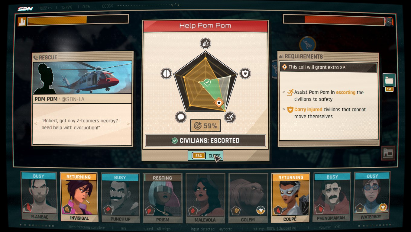 On est plus proche d’une série à dévorer que d’un jeu traditionnel et c’est précisément ce qui rend l’expérience aussi fluide, aussi addictive. Le dispatching est pertinent, mais perfectible. Les phases de dispatch constituent le seul véritable axe d’amélioration. Conceptuellement, elles sont excellentes: gestion du temps, multiplicité des urgences, indisponibilité temporaire des héros, variété des héros et de leurs utilités (skills et stats), décisions rapides sous pression. Bien qu’elles soient captivantes sur le plan technique, ces séquences ne contribuent pas significativement à l’expérience immersive globale. Les objectifs manquent parfois de mordant, de variations marquantes. Le texte et le sujet de la mission sont vite oubliés dès que les héros partent vers leur objectif. On sent le potentiel d’une couche supplémentaire de profondeur… qui n’est pas pleinement exploitée. Cela dit, elles sont un ajout très intéressant et font le cœur du concept. Les phases de dispatch sont amusantes et ne nuisent jamais à l’expérience, elle la bonifie malgré le changement d’approche. Je sens simplement que c’est le seul point un peu plus fade de l’expérience, probablement surtout parce que le reste est exceptionnel.