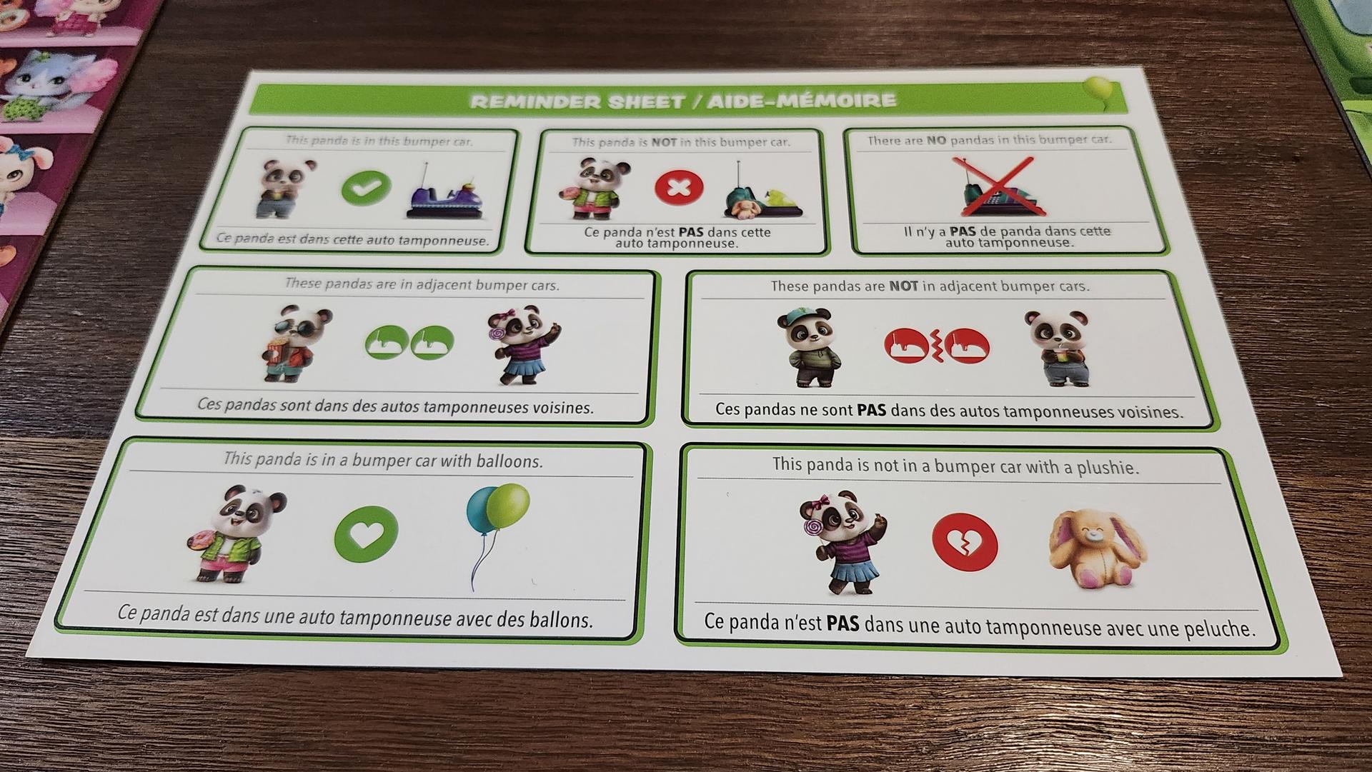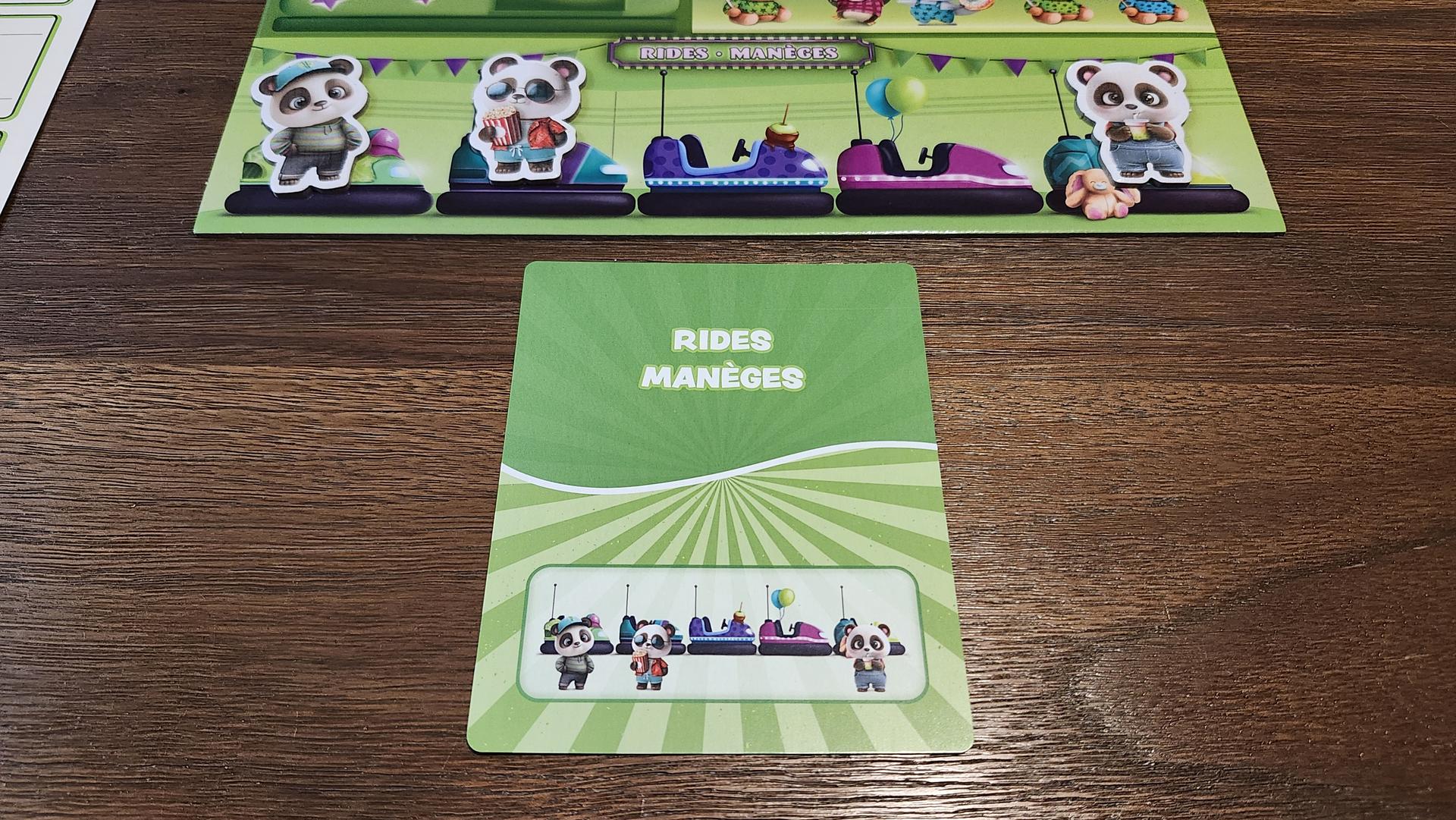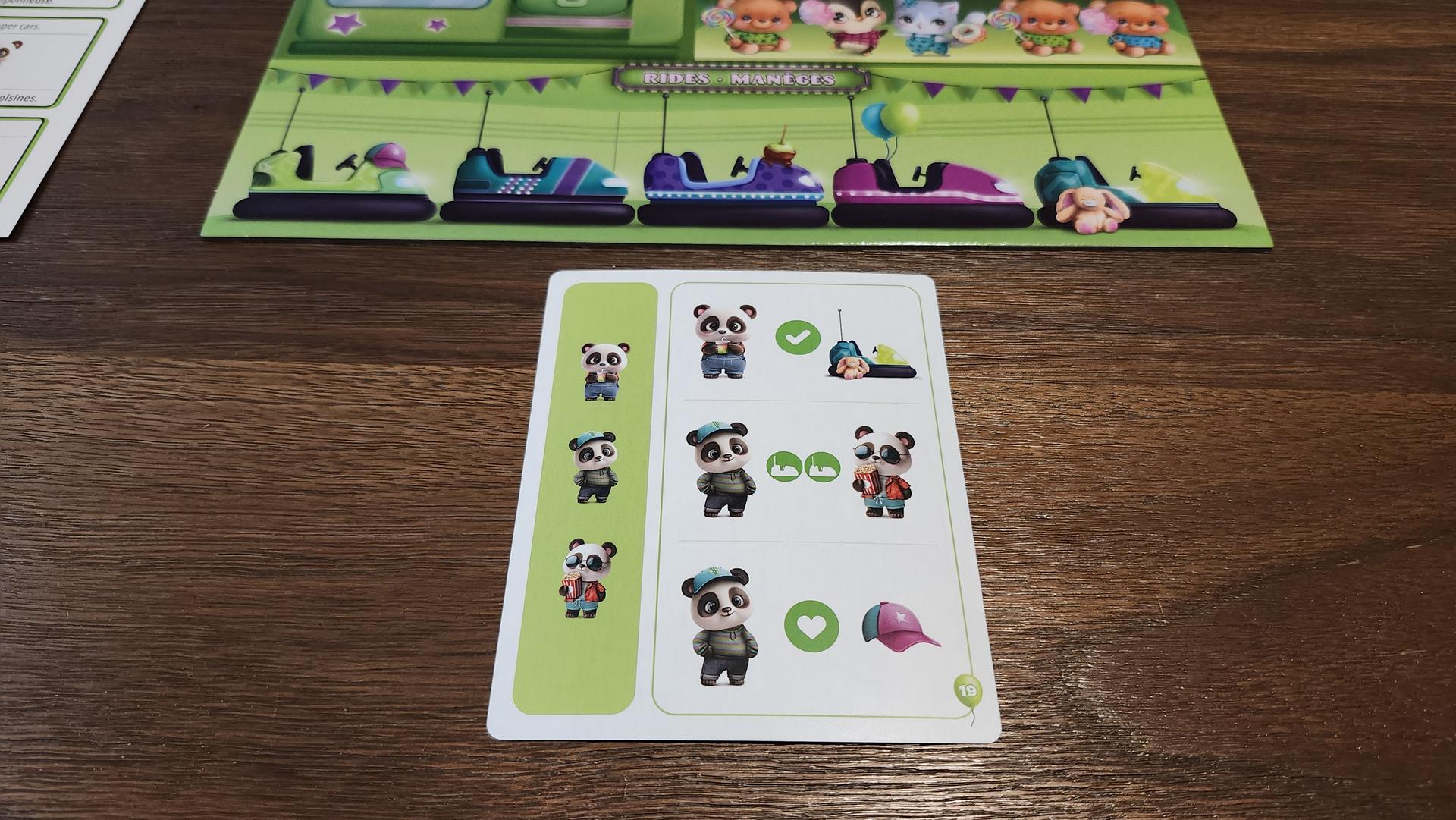 Le deuxième défi est le jeu des manèges. Ce défi en est un de déduction. Les joueurs pigent une carte qui montre des pandas et des symboles. L’aide-mémoire du jeu décrit en détail ce que chacun de ces symboles représente. Par exemple, une carte peut montrer quatre pandas ainsi que des indications du genre: le panda avec la sucette veut aller dans la voiture avec les ballons et le panda avec le sac de maïs soufflé veut aller dans la voiture à droite du panda avec la sucette. Le joueur doit placer les bons pandas dans les bonnes autos tamponneuses et, si tous les pandas sont placés au bon endroit, le défi est considéré comme un succès. Encore une fois, ma fille a bien aimé ce défi et c’est surprenant de voir leur petit cerveau travailler pour déduire la réponse.