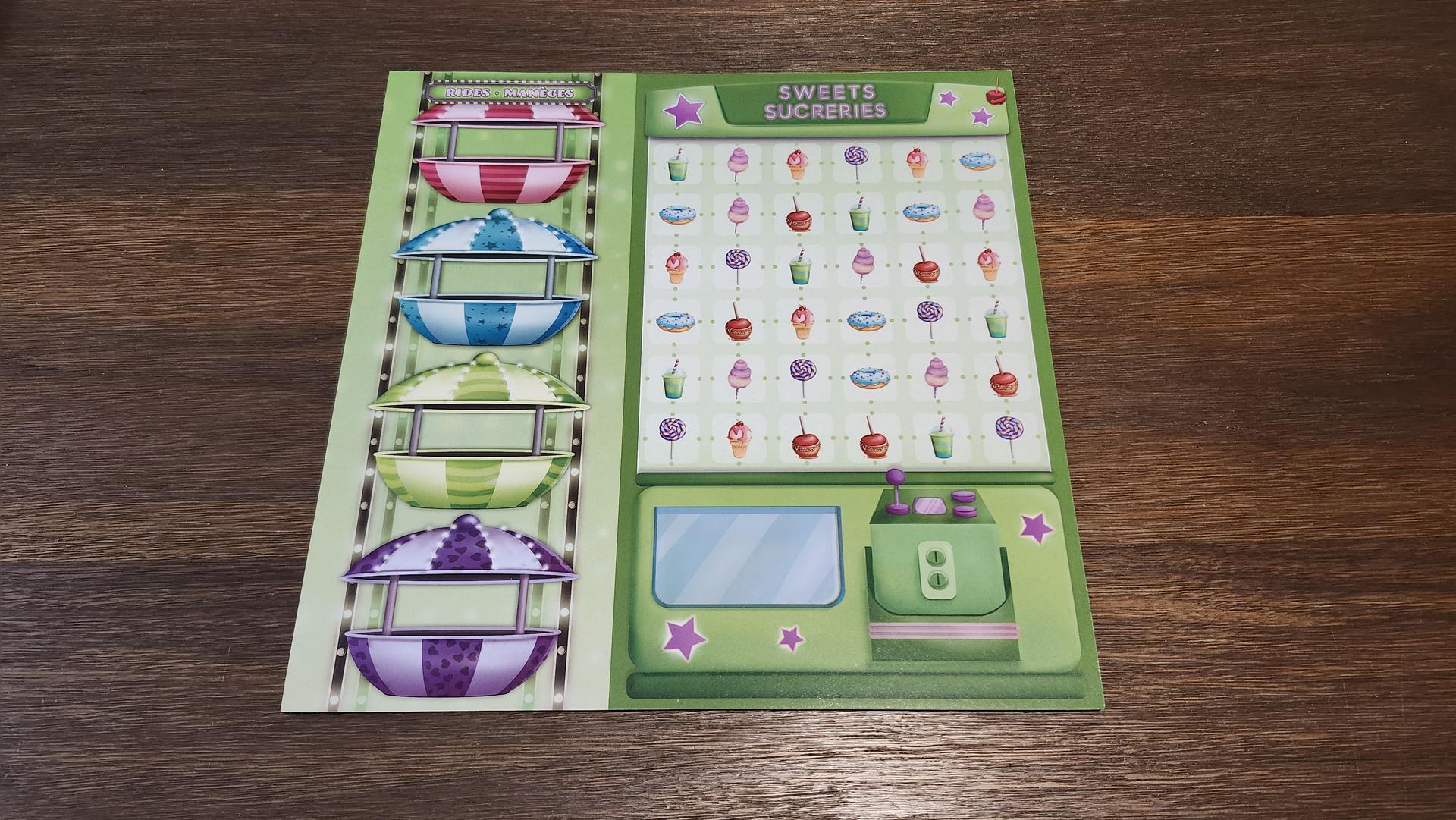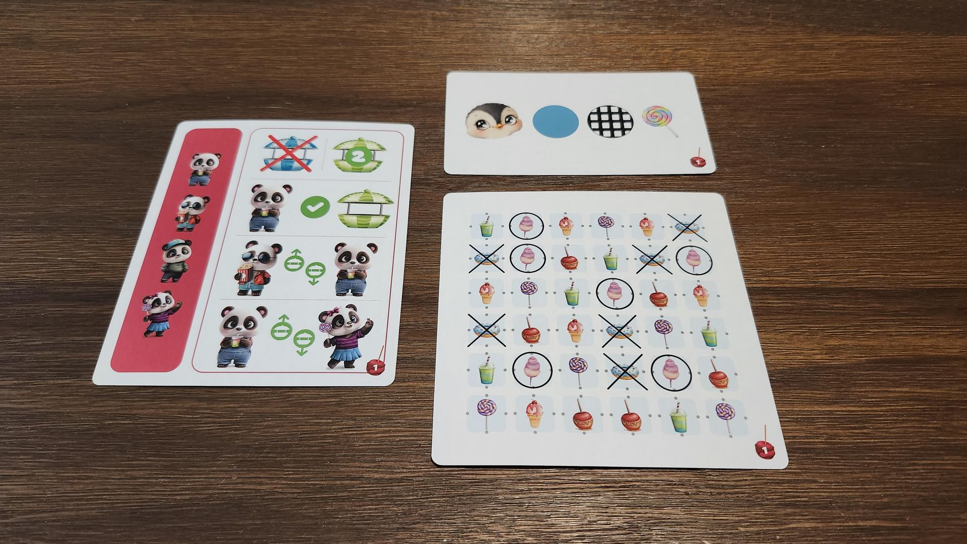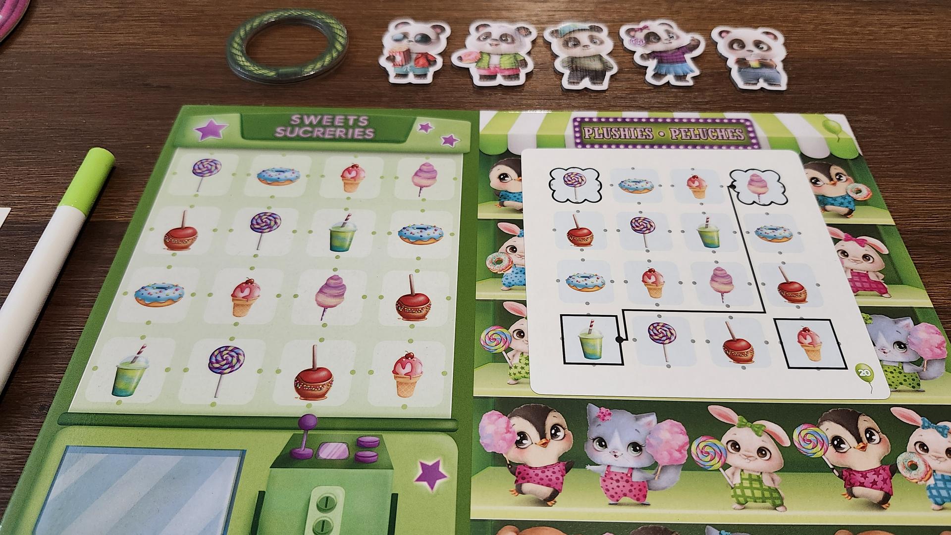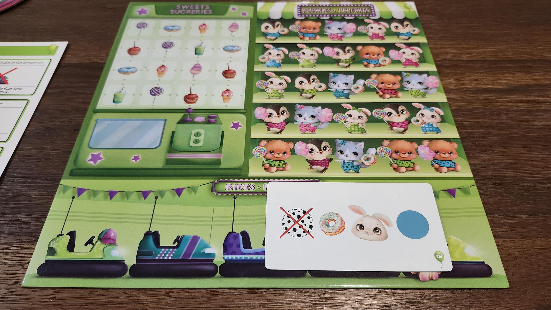 La majeure différence entre les cartes vertes et les cartes rouges est, bien sûr, la complexité. L’identification des peluches n’est pas plus difficile, en fait, il s’agit du même principe, mais les joueurs qui jouent à ce niveau doivent trouver la peluche sur le plateau de peluche (celui qui est utilisé pour les défis d’agilité), qui contient 42 peluches. Bien que ce défi soit presque aussi facile, les deux autres défis sont beaucoup plus complexes. Premièrement, les pandas doivent maintenant être placés sur une grande roue et les indices demandent de se creuser la tête plus que pour les autos tamponneuses. Mais ce qui est le plus difficile est le défi de mémoire avec les friandises. Pour ce défi, certaines cartes rouges ne sont pas trop difficiles, mais d’autres sont beaucoup plus complexes. Il suffit toutefois de faire preuve de logique et d’observation pour compléter la majorité d’entre elles. Par exemple, sur l’image ci-dessous, le défi peut sembler ardu, mais il suffit de se souvenir qu’il faut faire des « X » sur les beignets et encercler les cornets de barbe à papa. Encore une fois, ceux qui sont les plus difficiles sont ceux qui exigent de tracer des chemins. Cependant, bien que ce soit complexe pour en enfant de 5 ou de 6 ans, les enfants de 7 à 10 ans ne devraient pas avoir trop de difficulté à réussir ce genre de défi.