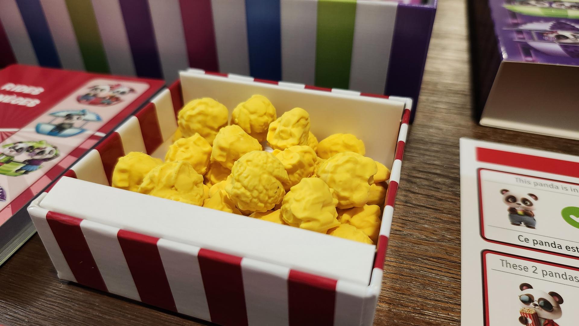 La première chose qui attirera votre attention est les flocons de maïs soufflé qui servent de monnaie dans le jeu. Ils sont fabriqués d’un genre de caoutchouc/latex et sont vraiment très jolis et plaisants à manipuler. Ils viennent aussi avec leur propre rangement avec un design de boite de pop-corn qui est non seulement très thématique, mais aussi bien utile pour le rangement et la mise en place. Dans la boite, vous retrouverez ces fameux maïs soufflés ainsi que les cartes de défi, des crayons effaçables, les plateaux de joueurs, le tableau de pointage, l’aide-mémoire et la roulette de défi. Tout est suffisamment résistant pour être placé entre les mains de vos enfants sans craindre que les pièces se détériorent. De plus, la flèche de la roulette de défi est très facile à faire pivoter, ce qui est un plus pour ma fille de cinq ans, et les feutres effaçables ne laissent pas de résidus sur les doigts! Au final, j’ai été agréablement surpris par la qualité globale du jeu et je dois admettre que je ne m’attendais pas à cela pour un jeu qui vise un jeune public!