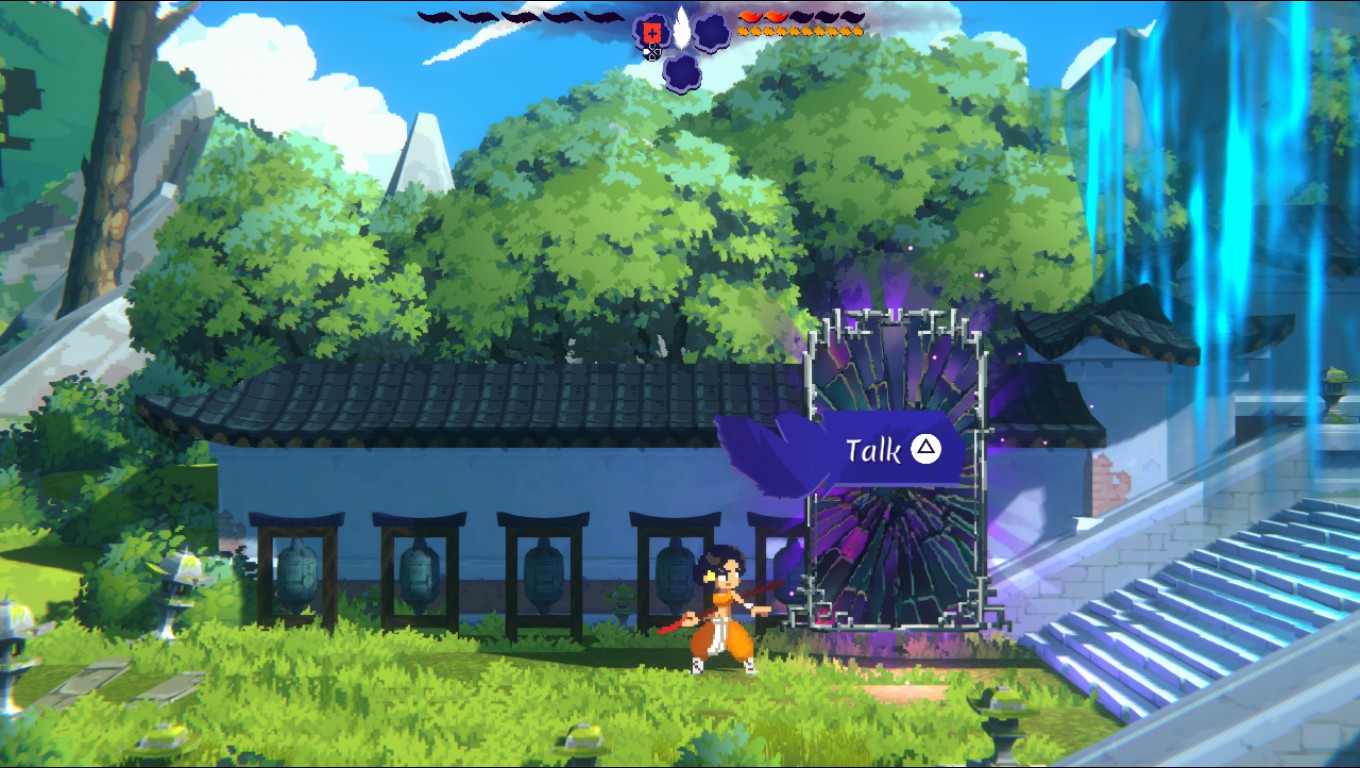 D’autres interactions viennent soutenir le rythme, comme des séquences de poursuites rapides, des interactions avec des courants d’air et des structures en bambou propulsives. La démo donne accès très rapidement à un arsenal complet de mobilité, ce qui crée un engouement certain. Akatori reprend les codes classiques du Metroidvania telles les zones qui doivent être atteintes avec des capacités spécifiques, des marchands dispersés, des points de repos régénérants, des backtracking assumé et des boss à patterns.