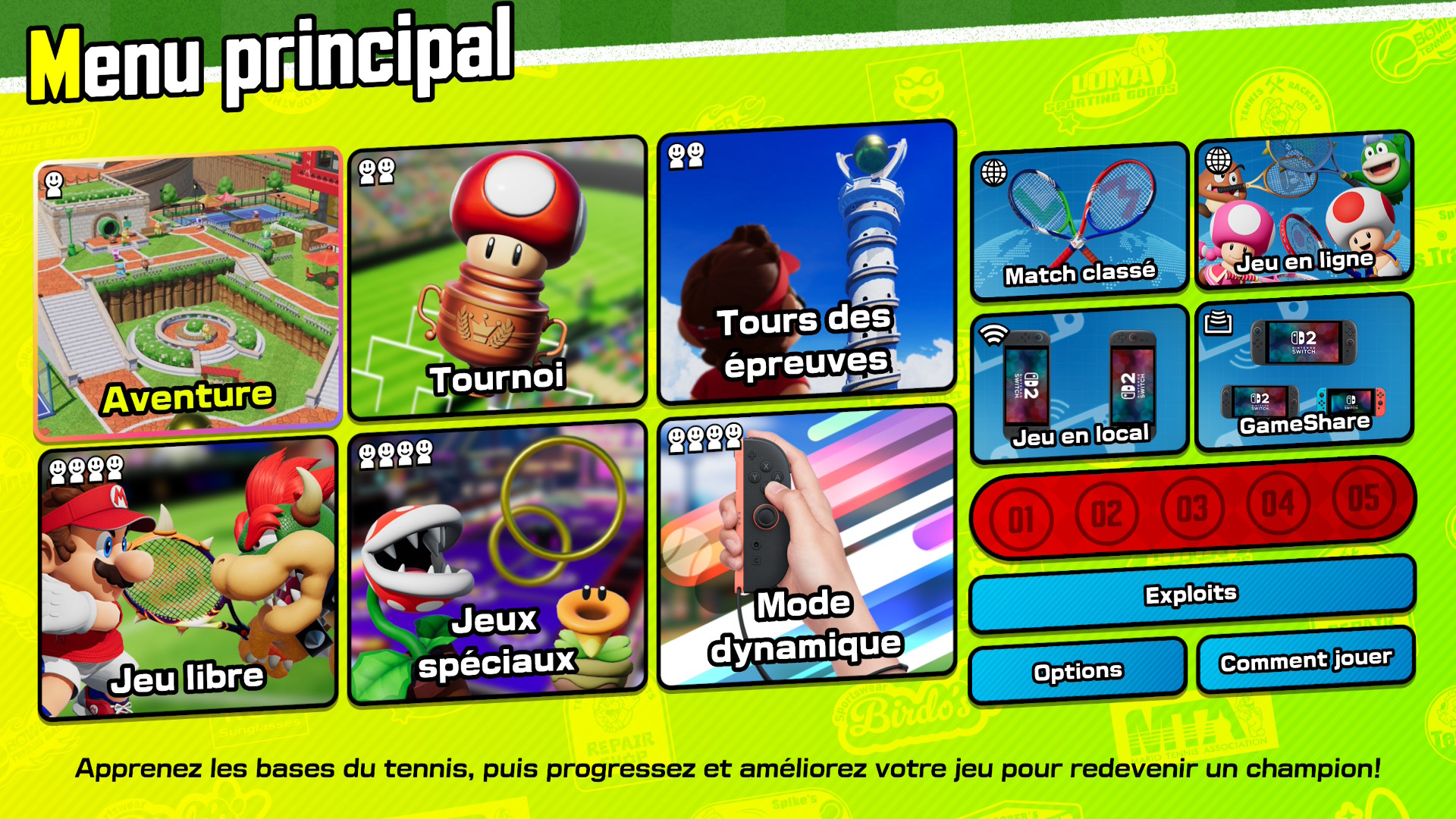 Rejoignons notre moustachu préféré ainsi que toute la ribambelle de personnages de l’univers Mario pour du tennis endiablé! Bien sûr, nous retrouverons tous les éléments qui font le charme de ce sport connu mondialement, comme les coups brossés, les coups droits, les amortis et autres. Ces éléments seront combinés à des techniques de déplacement uniques et à de nouvelles manœuvres de défense pour rendre le jeu encore plus dynamique. Prolongez les échanges, remplissez votre jauge de frénésie et libérez de puissantes frappes frénétiques qui peuvent être améliorées avec des effets spéciaux grâce aux raquettes frénétiques!