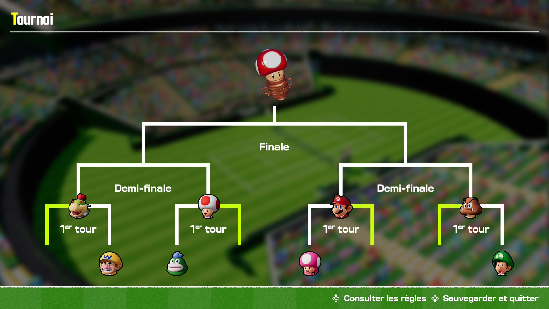 Tournoi: C’est l’heure du, du, du duel. Blague à part, dans ce mode, vous devrez successivement affronter plusieurs adversaires en simple ou en double jusqu’à ce que vous remportiez la coupe. Vous pourrez choisir votre personnage et votre raquette frénétique préférés pour espérer repartir avec la première place. Trois niveaux de difficulté sont proposés et il est impératif de terminer le niveau le plus facile pour accéder au niveau intermédiaire et ensuite au niveau difficile. C’est un très bon mode pour ceux qui désirent faire des matchs en rafale avec leur personnage de prédilection.