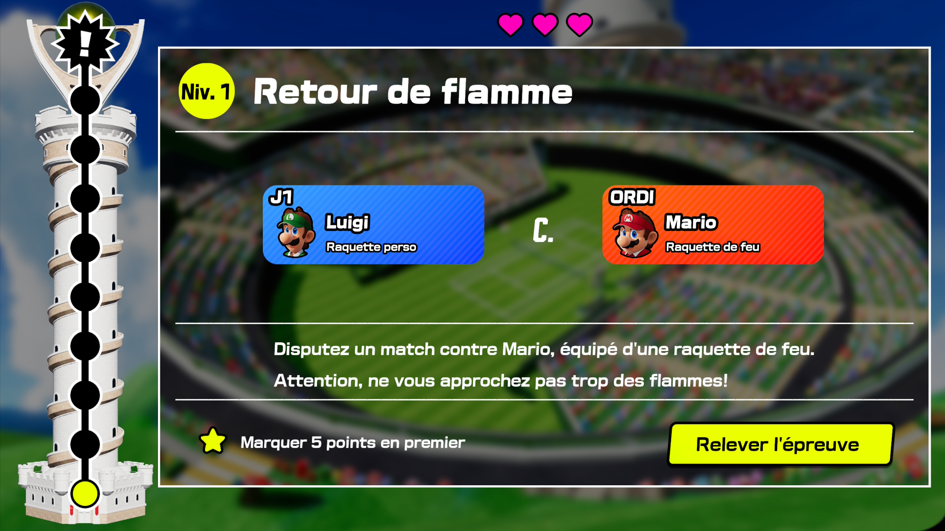 Tours des épreuves: Il faudra gravir les étages de la tour et, pour ce faire, vous devrez vaincre votre adversaire dans des conditions préétablies. Les personnages et les raquettes vous sont imposés et changent à chaque niveau. C’est un peu comme la tour de Mortal Kombat à la sauce Mario Tennis et, encore une fois, trois difficultés sont offertes. C’est un bon mode pour essayer des combinaisons auxquelles nous n’aurions pas pensé nous-mêmes.