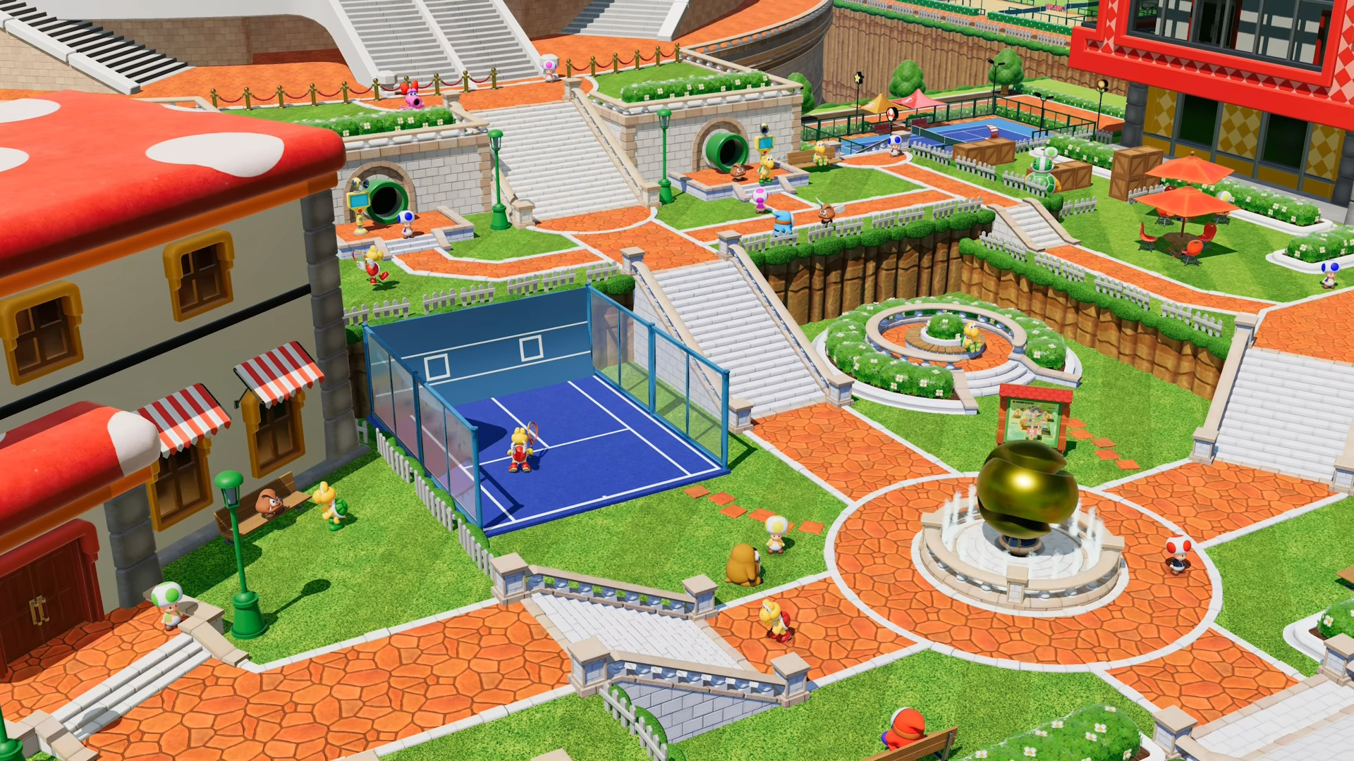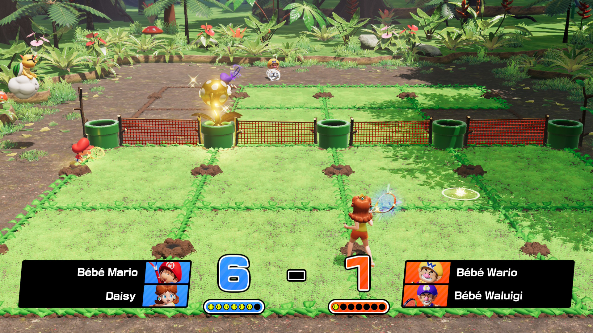 J’ai également découvert « Tennis Pinball », qui m’a bien étonné. Dans ce mode, des éléments communs aux machines à boules (ou billard électrique pour nos amis les Français), comme des bumper apparaissent sur le terrain. Ces éléments peuvent aussi bien affecter les joueurs que la balle. Alors, faites attention de ne pas frapper votre balle sur ceux-ci, car elle reviendra aussitôt vers vous. De quoi faire gagner un point à votre adversaire sans qu’il ait eu à lever la raquette. Vous pourrez aussi essayer le mode « Usine à raquette », qui fait apparaître des raquettes frénétiques de façon aléatoire et sporadique sur le court de tennis. En récupérant une raquette, il sera maintenant possible d’utiliser la frappe spéciale de celle-ci. Ça peut être déstabilisant, surtout si vous ne connaissez pas tous les effets des raquettes, mais c’est très divertissant. Pour finir, il y a le « Tennis des prodiges ». Inspiré de Mario Bros. Wonder, vous devrez récolter des graines prodiges. Une fois un joueur en possession de trois graines, une fleur apparaîtra au milieu du filet. En la frappant avec la balle, un événement aléatoire aura lieu. À ce moment, il sera possible pour tous les joueurs de récupérer des graines prodiges. Cela fait en sorte que, même si vous avez de l’avance sur votre adversaire, il pourra se reprendre et remporter le match. Entre autres, il y a un mode où des poissons apparaissent, dans lequel vous devez frapper celui qui est brillant, ou même un autre où des plantes piranhas apparaissent en chantant. À un certain moment, certaines d’entre elles cracheront des balles et vous devrez tenter d’atteindre une graine au centre des plantes. Pas toujours évident, mais toujours amusant! De plus, j’ai bien aimé le clin d’œil au dernier jeu de Mario.