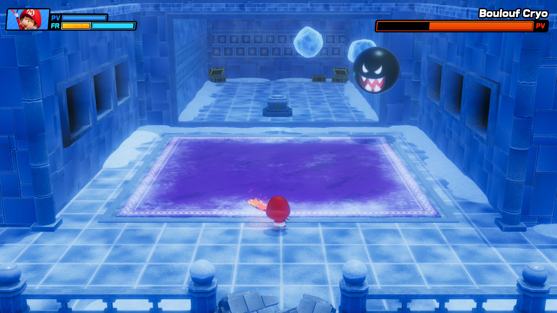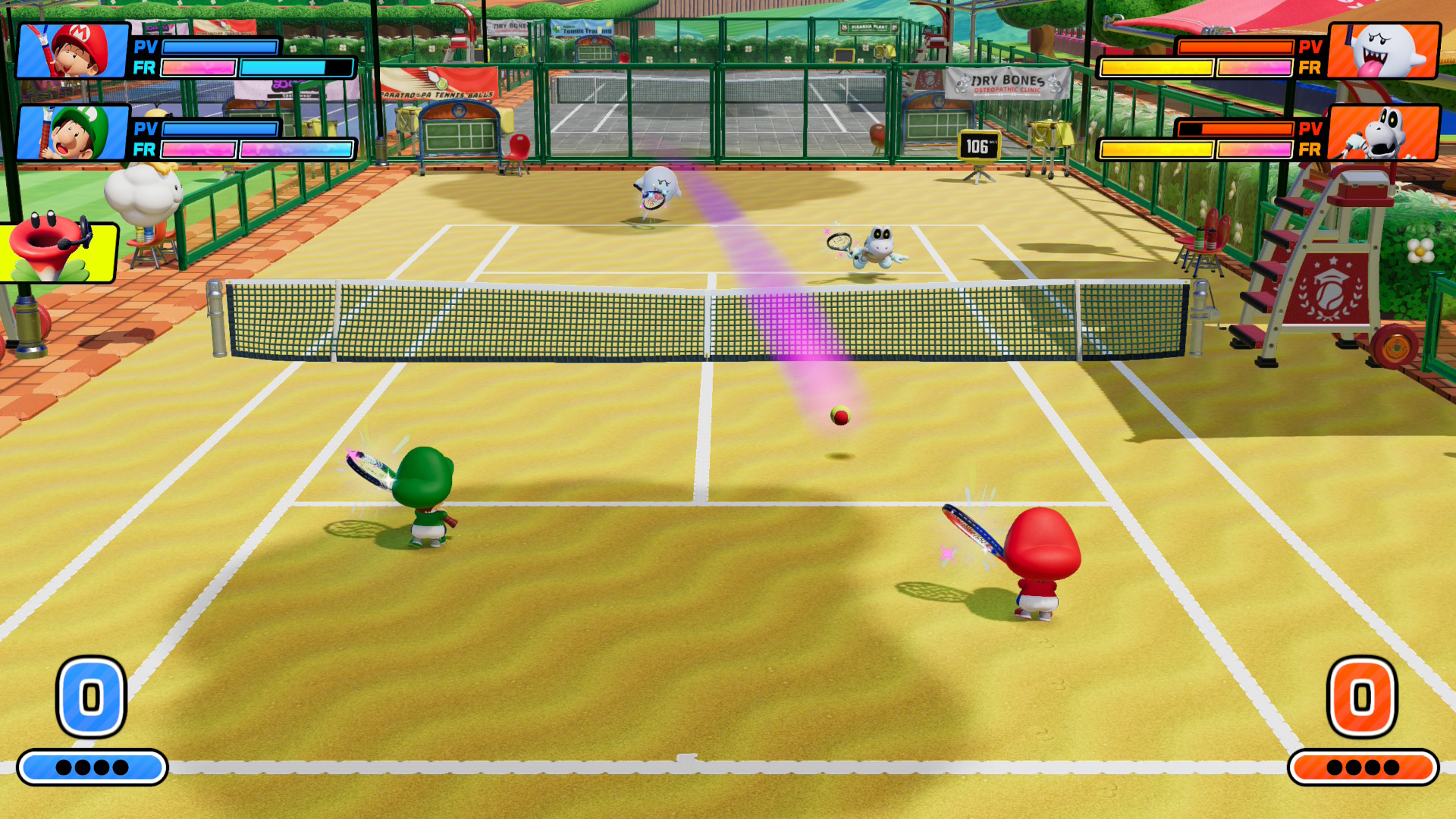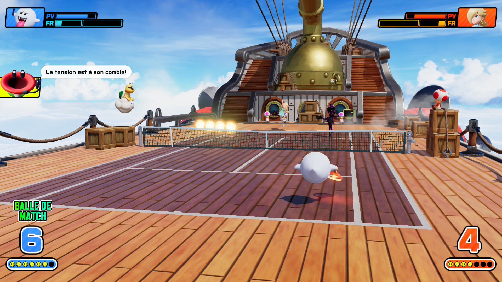 La base du tennis est là, vous pourrez jouer en simple ou en double, c’est-à-dire un ou deux joueurs de chaque côté du filet. Comme mentionné, les coups classiques du tennis sont présents et la frappe frénétique vient changer le rythme. Il y a plusieurs raquettes offrant des frappes avec des effets différents. Vous pourrez invoquer des tornades, geler une partie du terrain, faire apparaître des boules de feu et plus encore. Cela vient briser le style classique du tennis et l’on en attend pas moins d’un jeu de ce genre. Les personnages auront aussi des spécialités, telles que des bonus de puissance, de défense, de ruse, etc. J’ai personnellement un petit faible pour Boo avec son accent sur la ruse et ses coups qui donnent un grand effet à la balle. C’est difficile de prévoir la trajectoire de ses balles et j’adore cela, quand je ne me fais pas faire la même chose. Cependant, je dois avouer que j’aurais aimé encore plus de folie comme des matchs à quatre contre quatre, des terrains de tailles et de formes différentes et j’en passe.