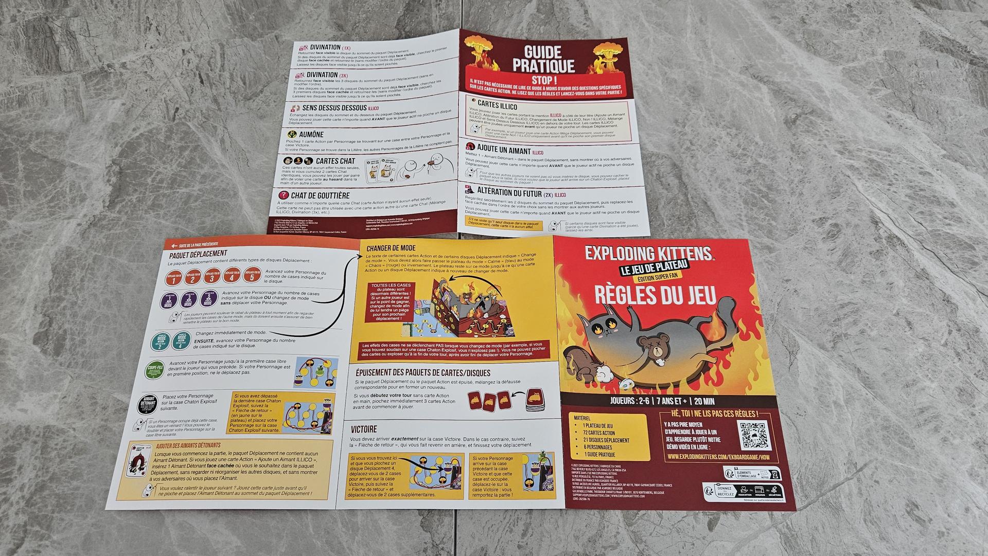 Le joueur actif devra piger une carte (ou plutôt un disque) dans le paquet « Déplacement » et se déplacer du nombre de case indiquée. Il devra ensuite piocher autant de cartes action que le chiffre indiqué sur la case sur laquelle il s’arrête. Cependant, si c’est un « Chaton Explosif », ça fait « chaboom »! Vous devez alors changer de place avec le dernier joueur sur le plateau en plus de devoir défausser un certain nombre de cartes. Donc, on avance et on pige des cartes, ou on recule et on défausse des cartes. Ça ne pourrait pas être plus simple que cela. Il est aussi possible d’ajouter des disques « Aimant » au paquet « Déplacement ». Si un joueur pioche un aimant, il devra obligatoirement se rendre sur la prochaine case « Chaton Explosif ». C’est un jeu punitif et, plus la partie s’éternise, plus le chaos est présent.
