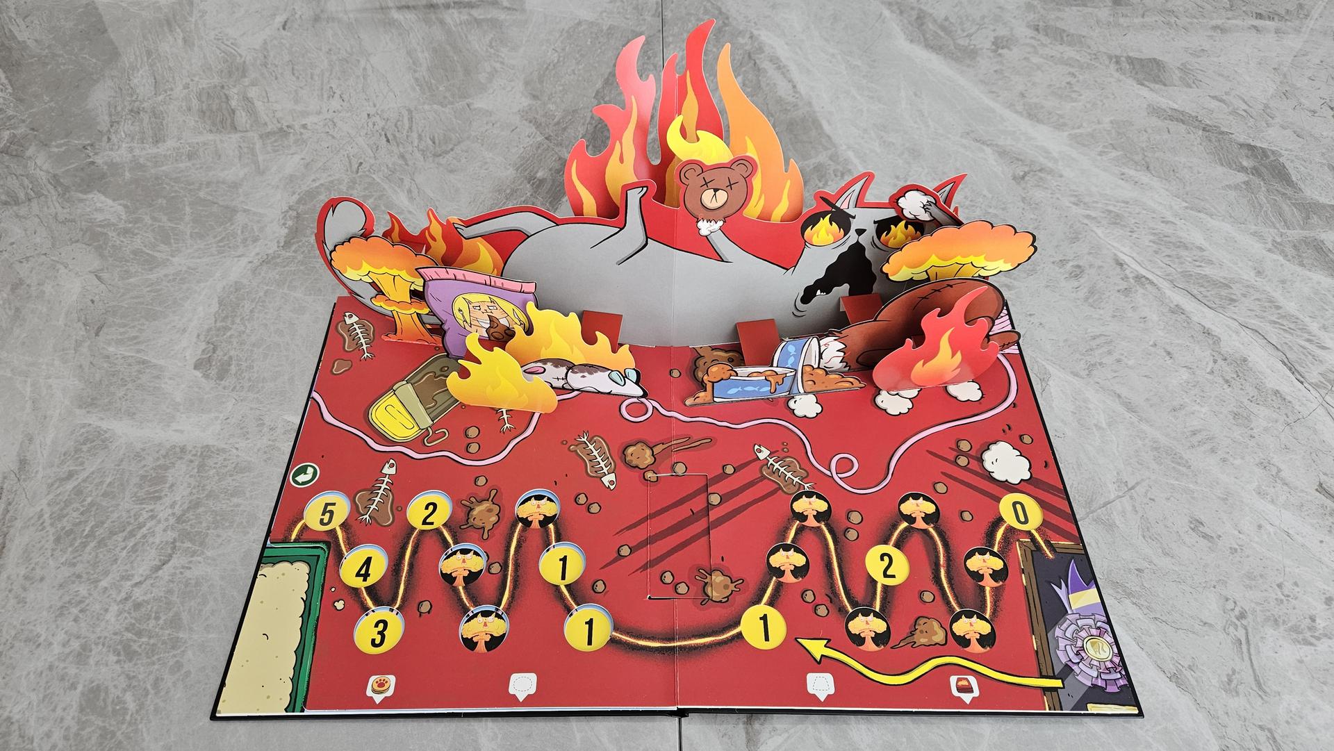 Pour terminer, le plateau de jeu (qui est l’élément principal de cette variante) se démarque des autres, puisqu’il est possible de changer le terrain en cours de partie. À la manière d’un livre pour enfants avec des éléments en trois dimensions qui peuvent être manipulés en tirant sur une languette en carton, le plateau changera en tournant simplement la page sans que vous ayez à déplacer les pions grâce aux trous dans chaque page. Le concept est simple, mais très bien appliqué. C’est vraiment le point fort de la présentation et j’ai adoré cette façon de faire. J’espère que ce genre d’élément sera repris dans le futur par d’autres compagnies!