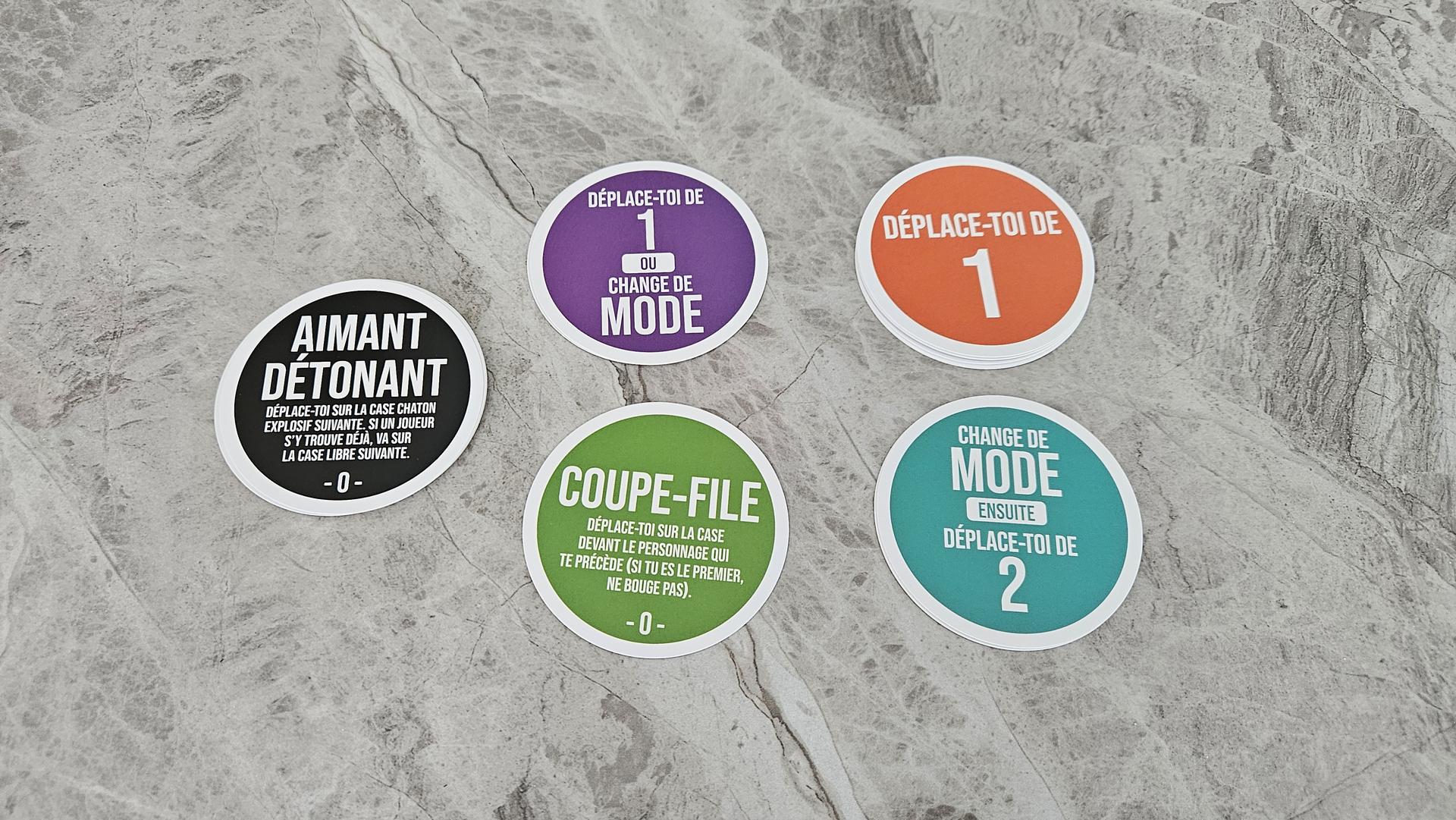 Chaque carte est présente en quatre exemplaires identiques. Certaines d’entre elles vous feront piger des cartes additionnelles, d’autres vous permettront de faire des déplacements précis ou de jeter un coup d’œil au paquet « Déplacement » pour planifier votre tour. Il y a aussi les cartes « Chats » qui, lorsque jouées en pair, permettent de voler une carte aléatoire dans les mains d’un adversaire. Il y a aussi certaines cartes et certains disques qui vous obligent à retourner le plateau de jeu du côté « Chaos ». De ce côté du plateau, il y a beaucoup plus de cases « Chaton Explosif », ce qui donne rapidement lieu à de la zizanie et, plus vous êtes nombreux, plus ce sera l’anarchie! Les déplacements sont donc plutôt simples, mais, au niveau de l’utilisation des cartes d’action, il faudra être un peu plus stratégique. La seule chose qui m’a vraiment déçu est le manque de variété au niveau des cartes. On fait rapidement le tour, surtout que les chats font tous la même chose. Je me répète, mais ce ne serait pas étonnant de voir des extensions avec des cartes additionnelles dans le futur. Pour l’instant, il faudra se contenter de celles qui sont déjà incluses. Au moins, elles sont toutes très faciles à comprendre, ce qui évite la confusion et les erreurs pendant le jeu. C’est ce genre de détail qui rend le jeu très accessible pour les novices et les plus jeunes.
