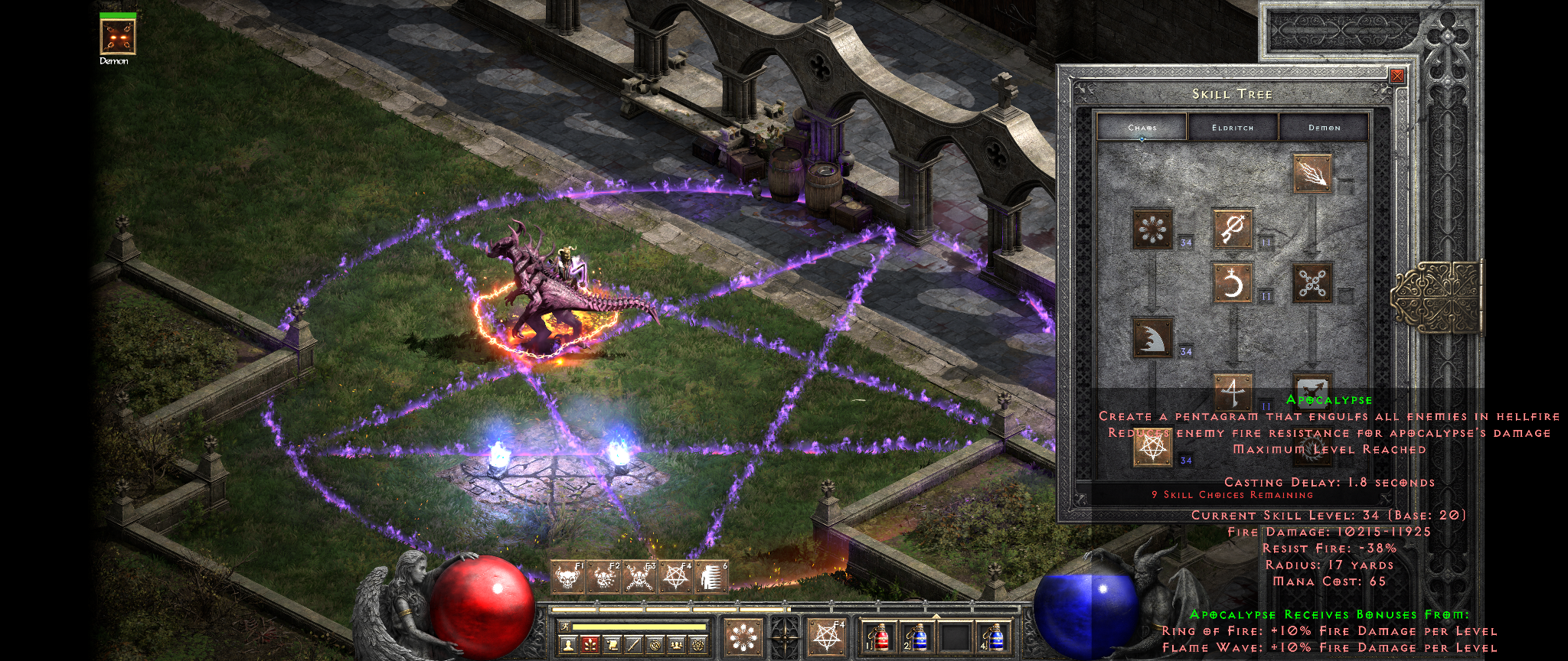 Dans le volet de la magie, on peut noter deux builds qui ressortent du lot. Il y a le feu, qui est très bon en début de jeu, mais qui a tendance à s’épuiser vers l’acte 4 de la difficulté cauchemar. Cependant, il est capable de reprendre beaucoup de puissance si un bon démon qui nous accompagne (surtout si celui-ci possède l’aura conviction du paladin), et ce, même notre équipement n’est pas top niveau. Si vous aimez faire du dégât de zone qui prend la largeur de votre écran, la compétence « Apocalypse » sera votre amie! Si vous n’êtes pas fan du feu, vous pourrez vous tourner vers les abysses. C’est un domaine qui n’a pas beaucoup d’immunité dans Diablo 2, ce qui lui donne un très grand avantage vis-à-vis bien d’autres utilisateurs de magie dans le jeu. C’est un build destiné à ceux qui aiment maîtriser le terrain et contrôler les démons en les attirant et en leur infligeant un poison magique, qui fait des dégâts instantanés et sur le long terme.