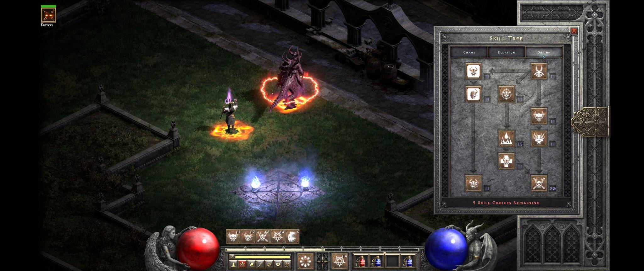 Puis, pour couronner le tout, il y a un autre arbre de talent qui, à mon avis, est un indispensable pour tous les builds associé à ce personnage. L’onglet « Demon » propose des compétences qui permettent de capturer des démons qui nous assistent durant notre progression. Mais comme bien des démons, leur pire ennemi est souvent l’homme. En effet, lorsque l’on meurt, notre démon bien aimé meurt avec nous… Jamais je ne pensais regretter de voir Hephaistos mourir! Un autre avantage de la branche « Demon » est que vous pouvez sacrifier ceux-ci pour obtenir un bonus temporaire, et chacun d’eux donne un effet particulier. Avec le nombre impressionnant de démons qu’il y a dans Diablo 2, vous pourrez vous amuser à découvrir les effets de chacun!