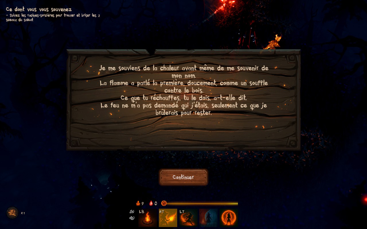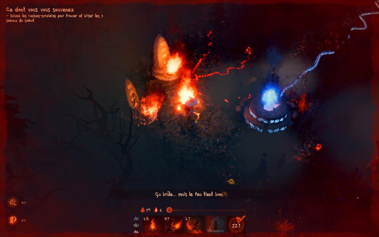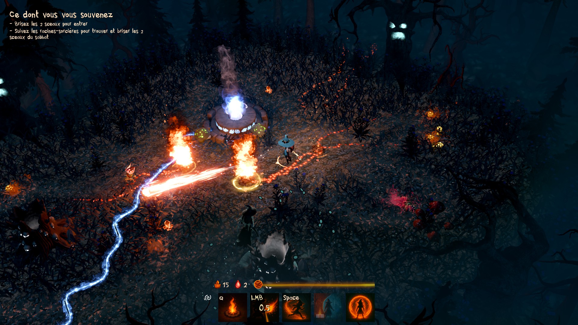 Vous commencez votre aventure en vous réveillant à côté d’un feu très faible. La forêt semble vous parler, vous ne vous souvenez plus de rien. Vous devez à tout prix trouver votre bâton pour trouver des réponses à vos questionnements et vous défendre contre l’obscurité et les ennemis qui vous guettent. Une ligne bleutée apparaîtra et sera votre ligne directrice pour trouver vos objectifs tout au long de votre aventure. Ces lignes, appelées les « racines-sorcières », seront votre seul guide dans la noirceur de la forêt. Au départ, vous aurez comme seule arme des feux de camp qui peuvent exploser que vous pourrez placer toutes les dix secondes pour vous protéger et compléter votre première mission, soit celle de retrouver votre bâton. Une fois votre bâton en main, vous pourrez maintenant lancer des boules de feu pour vous défendre. Vous aurez comme seconde mission de briser les sceaux du sabbat pour, par la suite, sortir de cet endroit.