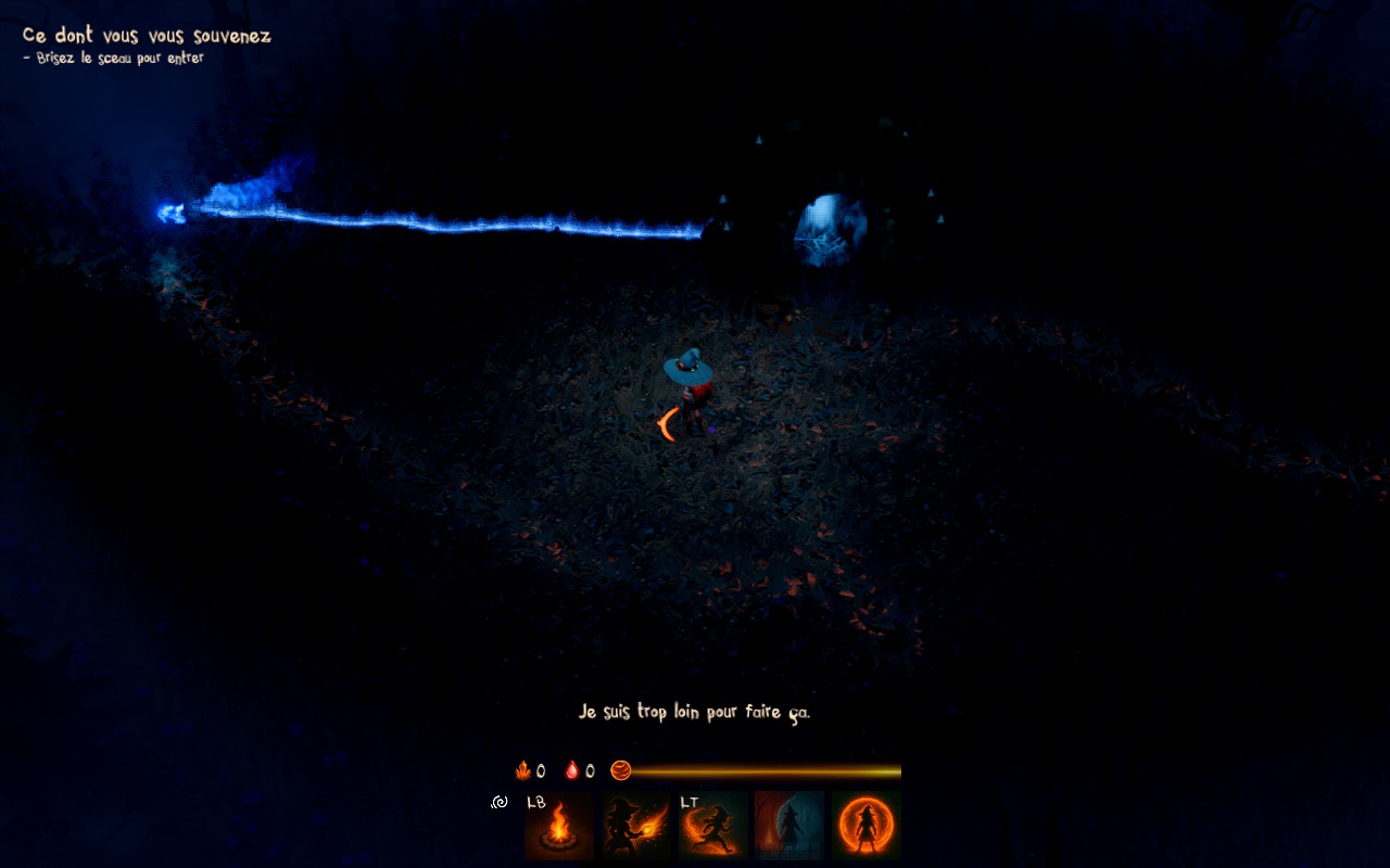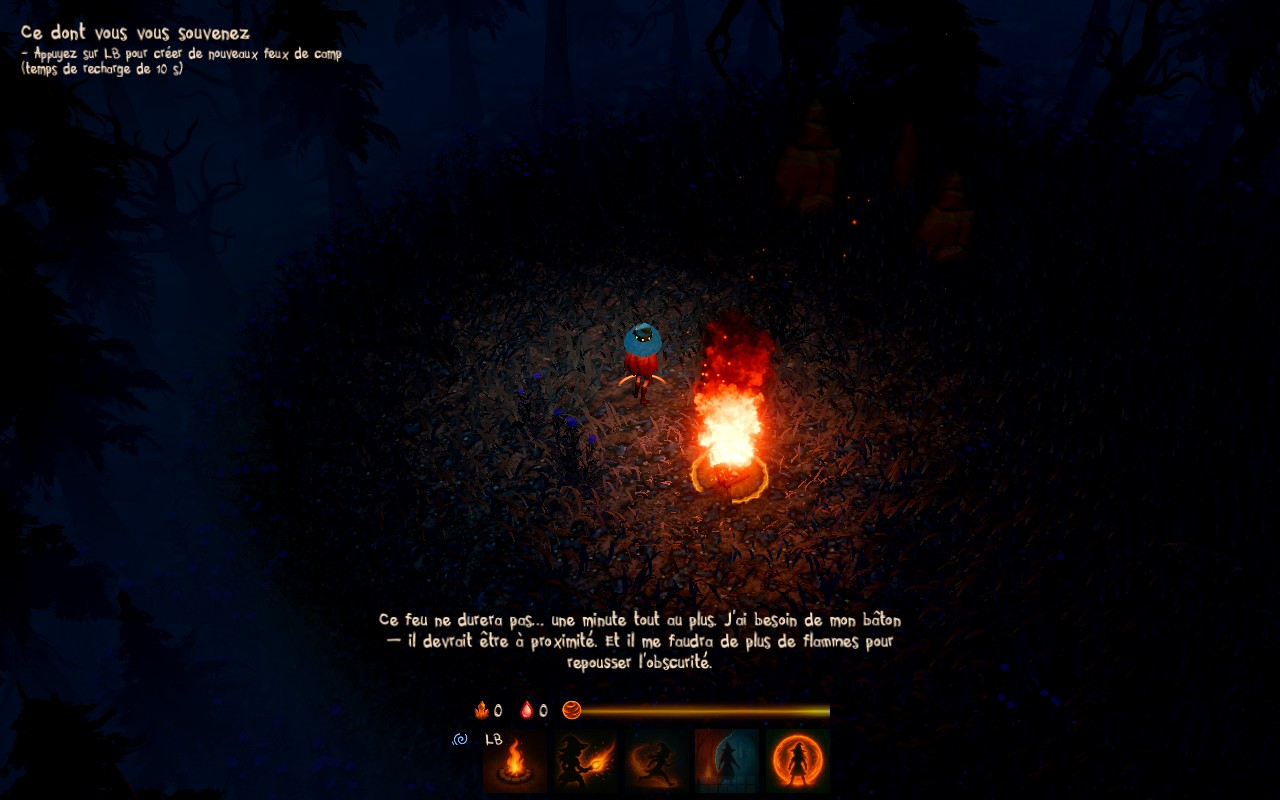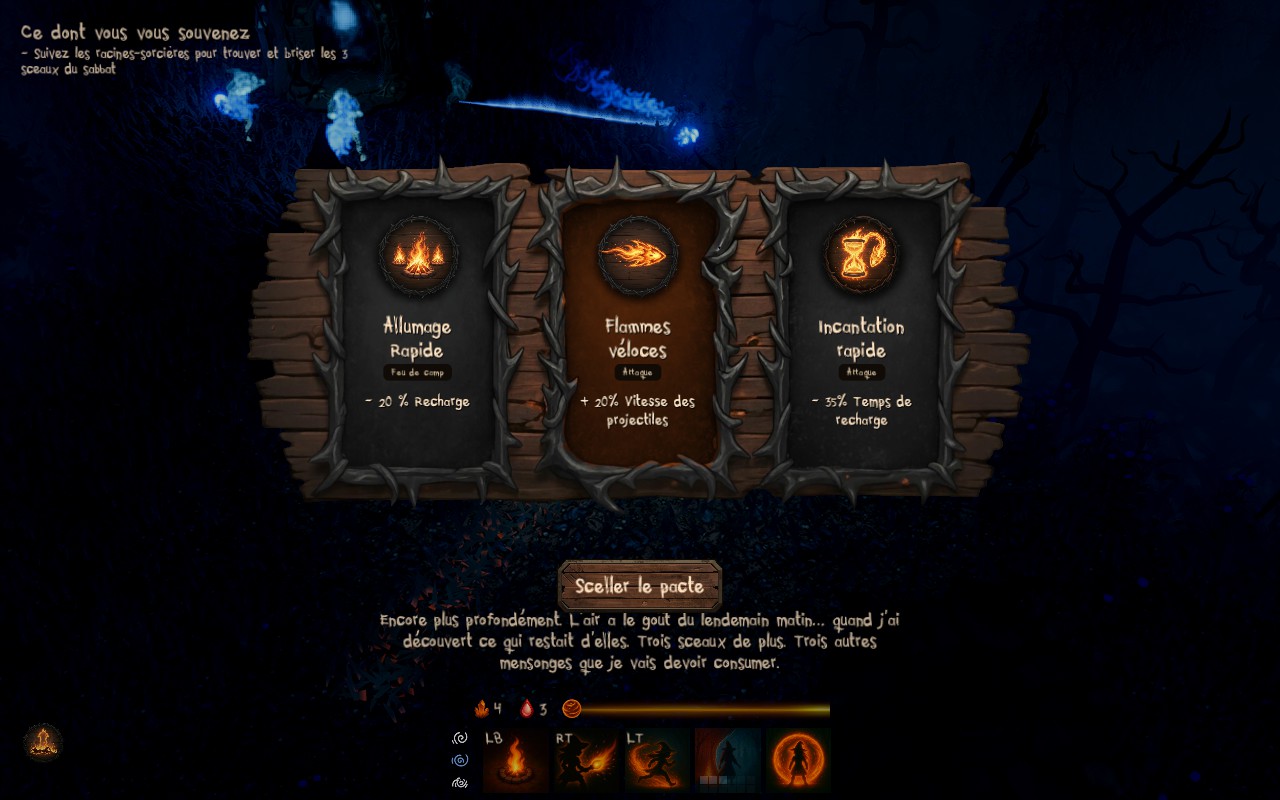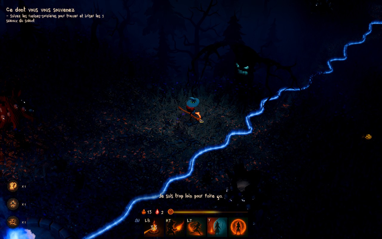 Vous commencez votre aventure en vous réveillant à côté d’un feu très faible. La forêt semble vous parler, vous ne vous souvenez plus de rien. Vous devez à tout prix trouver votre bâton pour trouver des réponses à vos questionnements et vous défendre contre l’obscurité et les ennemis qui vous guettent. Une ligne bleutée apparaîtra et sera votre ligne directrice pour trouver vos objectifs tout au long de votre aventure. Ces lignes, appelées les « racines-sorcières », seront votre seul guide dans la noirceur de la forêt. Au départ, vous aurez comme seule arme des feux de camp qui peuvent exploser que vous pourrez placer toutes les dix secondes pour vous protéger et compléter votre première mission, soit celle de retrouver votre bâton. Une fois votre bâton en main, vous pourrez maintenant lancer des boules de feu pour vous défendre. Vous aurez comme seconde mission de briser les sceaux du sabbat pour, par la suite, sortir de cet endroit.