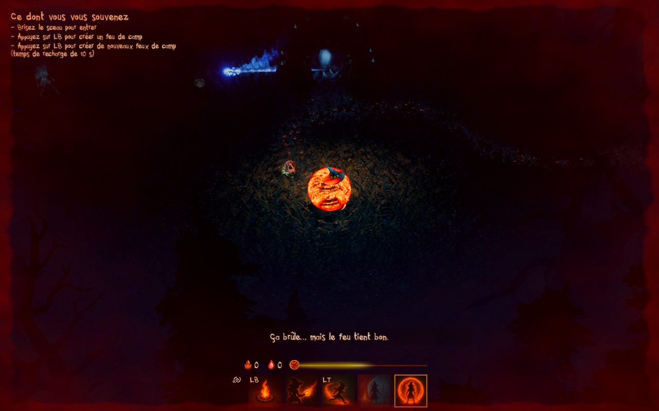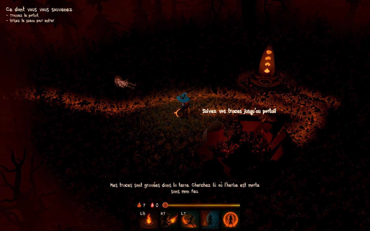 Votre personnage, une sorcière emprisonnée dans un cauchemar, est poursuivi par des ombres menaçantes et des monstres sortis tout droit de la pénombre. Faites attention de ne pas vous faire toucher! Il suffit d’encaisser deux coups et vous serez mort! Vous devez combattre les ombres, amassez des fragments de braise que vos ennemis laisseront tomber en mourant pour devenir plus forte et obtenir de nouvelles aptitudes pour continuer à avancer dans votre aventure. Toutes les aptitudes et toutes les magies que votre personnage apprendra seront de type feu. Le concept est bien, et très thématique, mais j’aurais peut-être préféré avoir la possibilité de jouer avec d’autres éléments, comme l’eau, le vent et autre pour plus de variété. Quand vous aurez terminé votre première quête, vous retournez à la grotte avec, comme seul guide, vos pas qui ont brûlé l’herbe là où vous êtes passé. Vous atterrirez dans un endroit appeler le repère de la sorcière ou vous pourrez utiliser vos fragments pour obtenir des améliorations avant de partir pour vos prochaines missions. Toutes vos aventures seront différentes. En fait, les missions seront toutes assez semblables, mais les cartes, les routes et les secrets seront placés différemment.