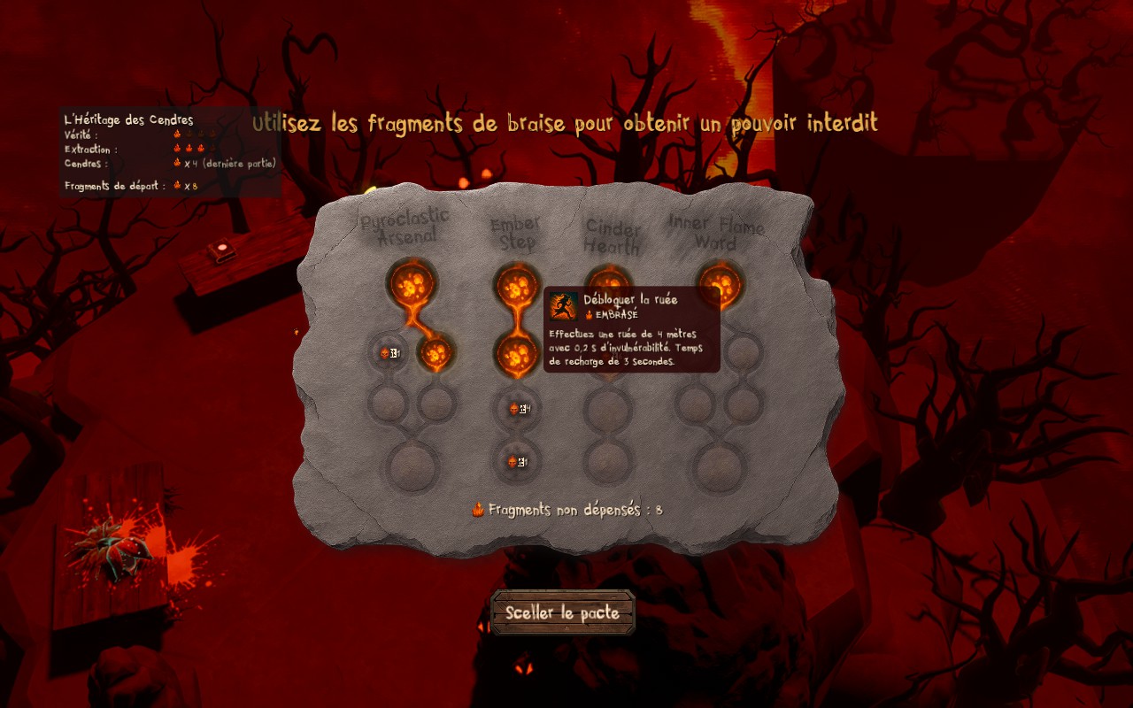 Pour que votre aventure soit un peu moins pénible, car le jeu est initialement très difficile, vous pourrez améliorer des pouvoirs ou en obtenir de nouveaux. Vous pouvez choisir quel pouvoir vous souhaitez améliorer en premier. Moi, j’avais commencé par la ruée, qui permet de créer une traînée de flammes et qui vous fait courir rapidement. Celle-ci vous donne aussi une invulnérabilité de 0.2 seconde et son temps de recharge est de 3 secondes, ce qui est assez rapide. Cette aptitude est très utile pour prendre de la distance quand il y a plusieurs ennemis à proximité et que vous ne pouvez pas les attaquer tous en même temps. Elle peut aussi être améliorée jusqu’à quatre fois (comme les autres aptitudes), vous donnant des bonus de plus en plus intéressants et, à son niveau maximum, elle vous permet de traverser les ennemis sans subir de dégâts et appliquer une marque qui les tue instantanément, ce qui est extrêmement pratique!