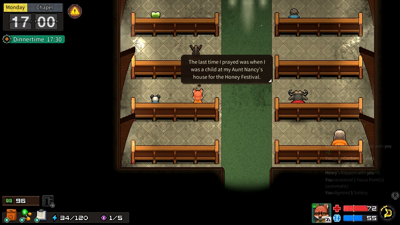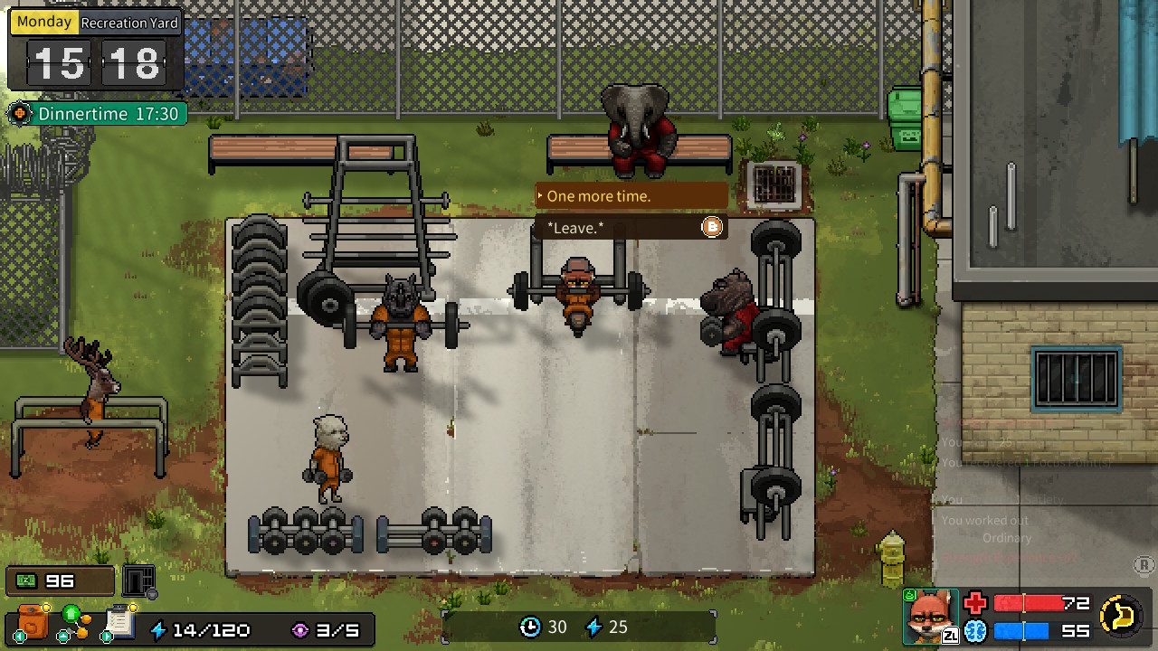 Un système de fabrication et de troc ajoute une dimension intéressante au jeu et se marie à merveille avec d’autres éléments qui mettent l’accent sur un aspect de style survival. Votre santé psychologique et physique se régénère pendant la nuit, mais avez-vous des couvertures? Avez-vous un bon oreiller? Avez-vous besoin de pilules pour bien dormir? Avez-vous bricolé une brosse à dents pour donner un coup à vos assaillants? Avez-vous accès à des substances qui vont augmenter vos capacités? À mon premier combat, j’en ai mangé toute une face à un crocodile (je dois avouer que je ne m’y attendais pas)! Je n’étais évidemment pas prêt et j’avais sous-estimé l’importance de ma santé! Heureusement, je suis éventuellement devenu plus bœuf que renard! On peut s’entraîner à lever des poids dans la cour, moyennant contribution monétaire au gang qui dirige la zone, à moins bien sûr de faire partie du gang en question… Et, en étant à l’extérieur, vous avez aussi accès à une chapelle pour vous ressourcer un peu. Toutefois, cette dernière s’ajoute à la liste des choses que j’ai négligées!