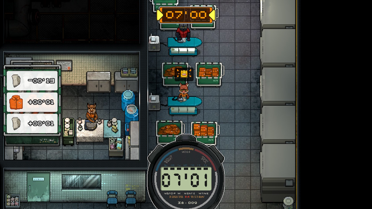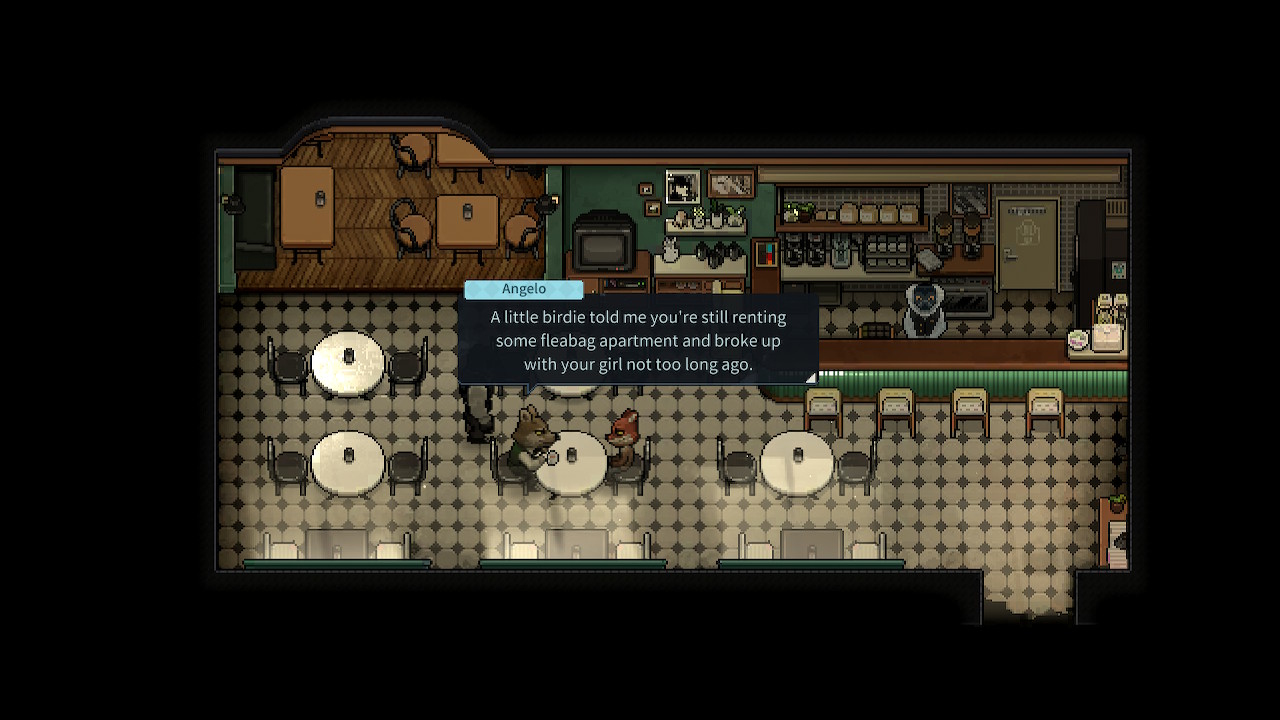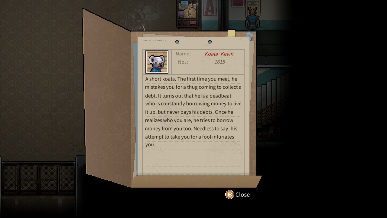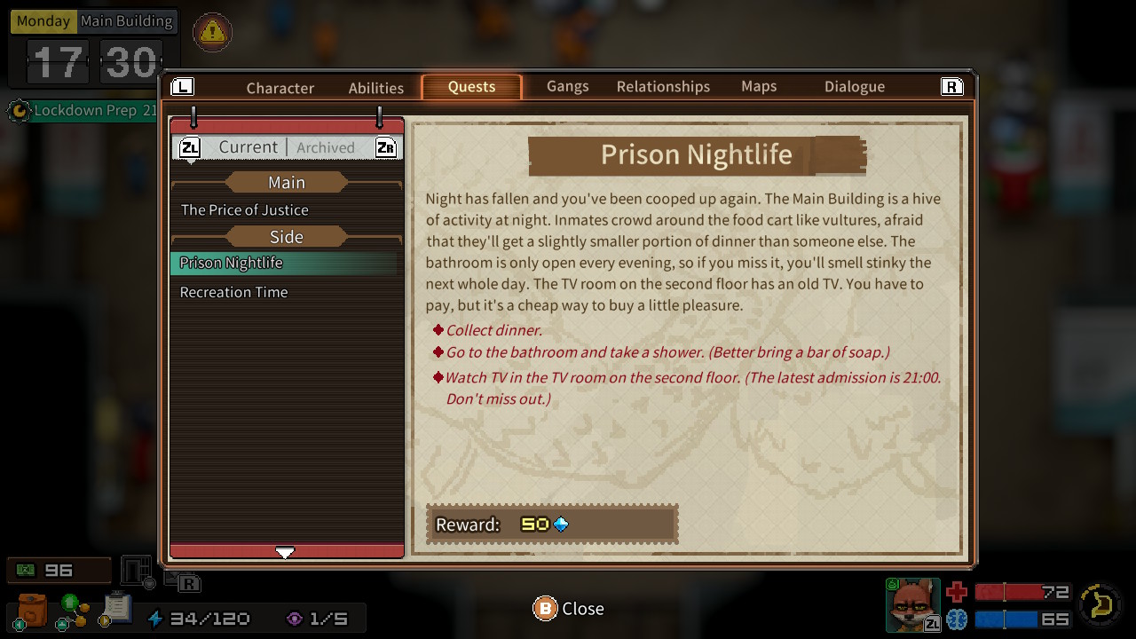 En ce qui concerne les mécaniques de jeu, on nous propose BEAUCOUP de style. Le système de réussite pour certaines actions basées sur des jets de dés dont les chances sont affectées par vos statistiques, votre état de santé, vos compétences et vos objets. Ensuite, il y a les mini jeux d’emploi de prison pour que vous puissiez gagner du blé tout en prenant en compte le temps! Car oui, le temps est un aspect assez important, vous avez des heures de repas, de sortie, de temps libre, de cellule. Bref, il ne suffit pas de plier du linge pendant 21 jours en jeu, vous allez devoir vous remuer et gérer cette précieuse ressource ou vous pourriez bien passer une partie de votre vie en taule! Car c’est là qu’on vous veut, et vos adversaires de l’extérieur veulent que vous y restiez. Parlant de ces adversaires, il y a un système de relation dans Back to the Dawn qui m’a vraiment plus! Et c’est particulier de naviguer à travers, premièrement, la gestion du temps, mais aussi, les gangs rivaux en plus de vos adversaires qui ont des contacts bien placés!