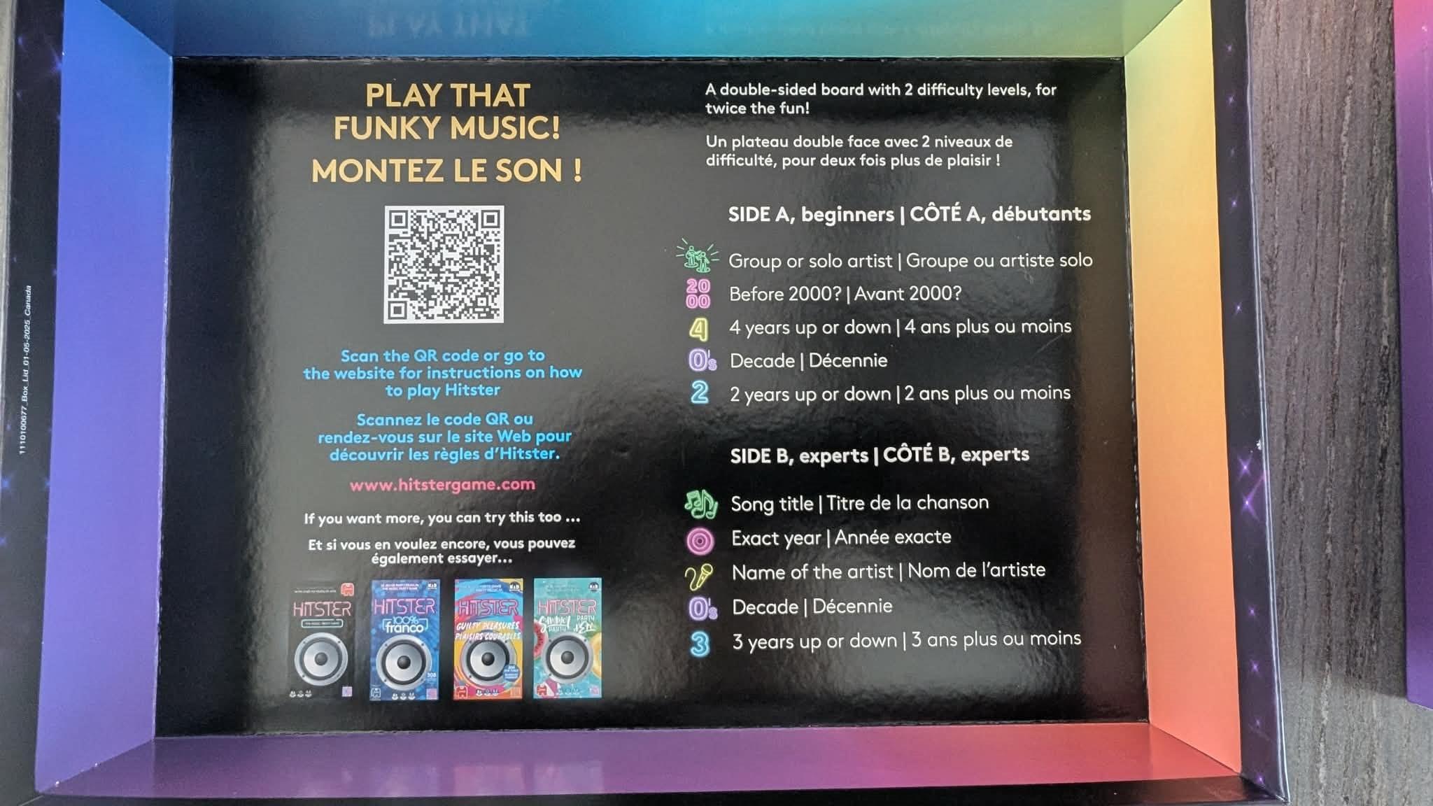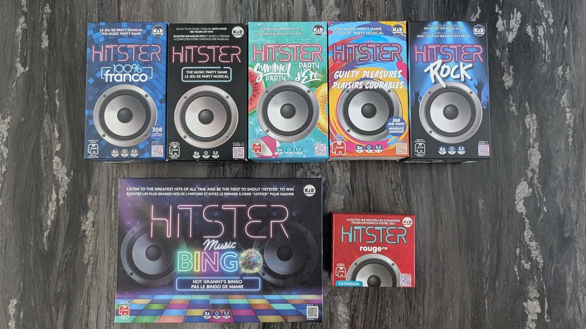 Le premier Hitster de la série a rapidement conquis le cœur du public. Il a eu l’effet d’une véritable bombe chez les différents commerçants qui l’offraient: ruptures de stock à répétition et précommandes à profusion, la demande est rapidement devenue immense. Tout le monde voulait sa copie. C’est pour surfer sur cette vague de popularité que plusieurs autres versions du jeu ont vu le jour au cours des dernières années. Étant un jeu musical, les possibilités de déclinaisons sont extrêmement vastes, voire presque infinies, lorsqu’il est question de développer de nouvelles éditions. En date d’aujourd’hui, en mars 2026, voici les versions proposées en magasin (au Québec, bien entendu).