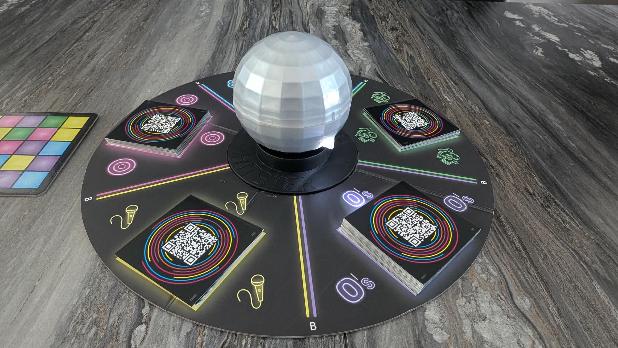 Comme mentionné, le plateau propose deux côtés distincts. Chacun offre un niveau de difficulté différent, allant d’un mode plus accessible à un mode beaucoup plus corsé. Le principe est simple: on fait tourner la boule disco, qui s’arrête en pointant l’une des sections du plateau. On prend alors connaissance de la question associée à la couleur désignée, on numérise la carte située sur le dessus du paquet correspondant, puis on appuie sur la boule disco. Celle-ci s’illumine et fait office de « sablier », laissant aux joueurs le temps d’écrire leur réponse sur leur plateau personnel. Une fois le temps écoulé, tous les joueurs révèlent leurs réponses. Ceux qui ont la bonne réponse peuvent cocher une case de la couleur correspondante sur leur plateau. Comme vous l’aurez deviné, l’objectif est de compléter une ligne, à la manière d’un bingo traditionnel.