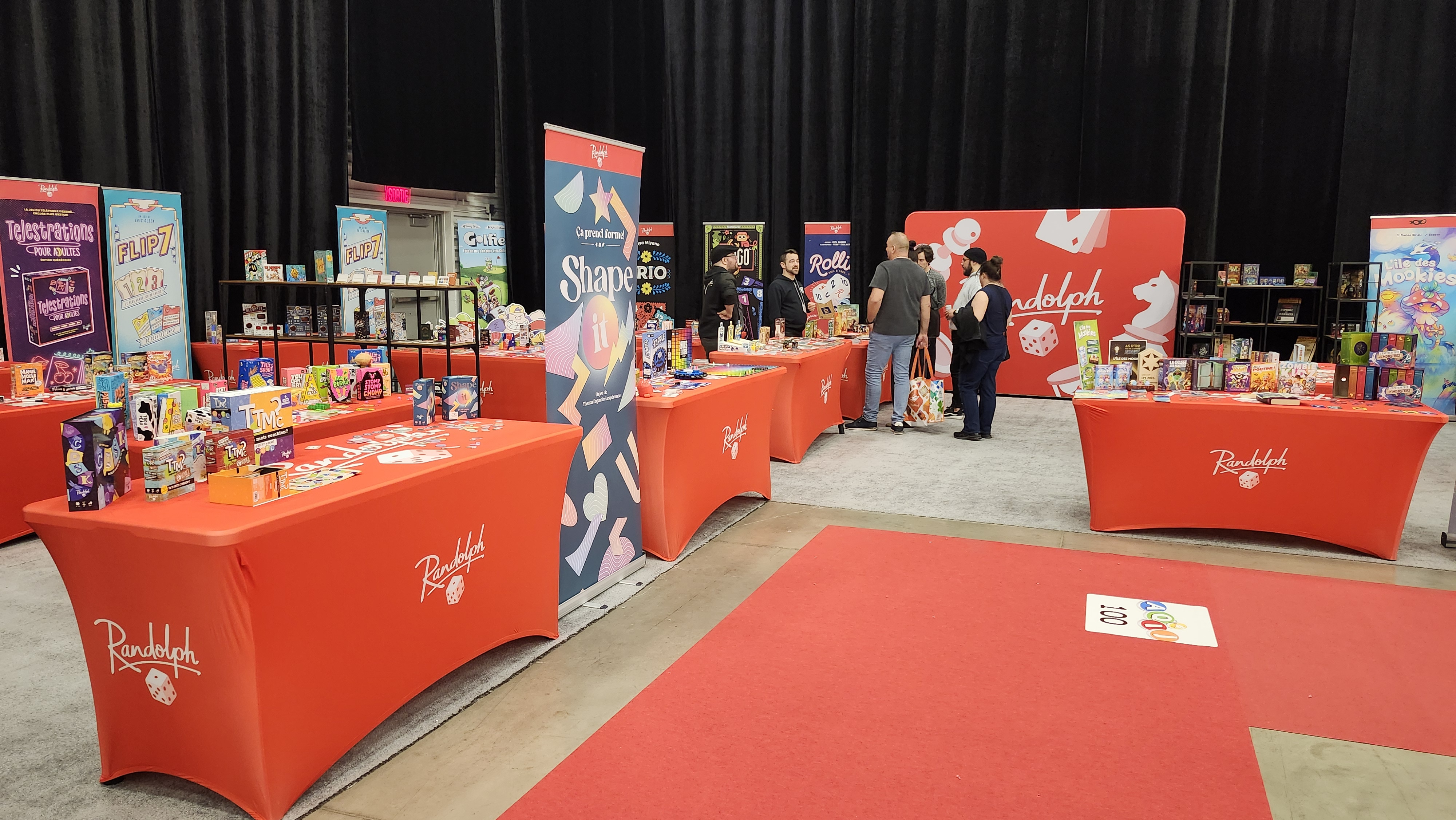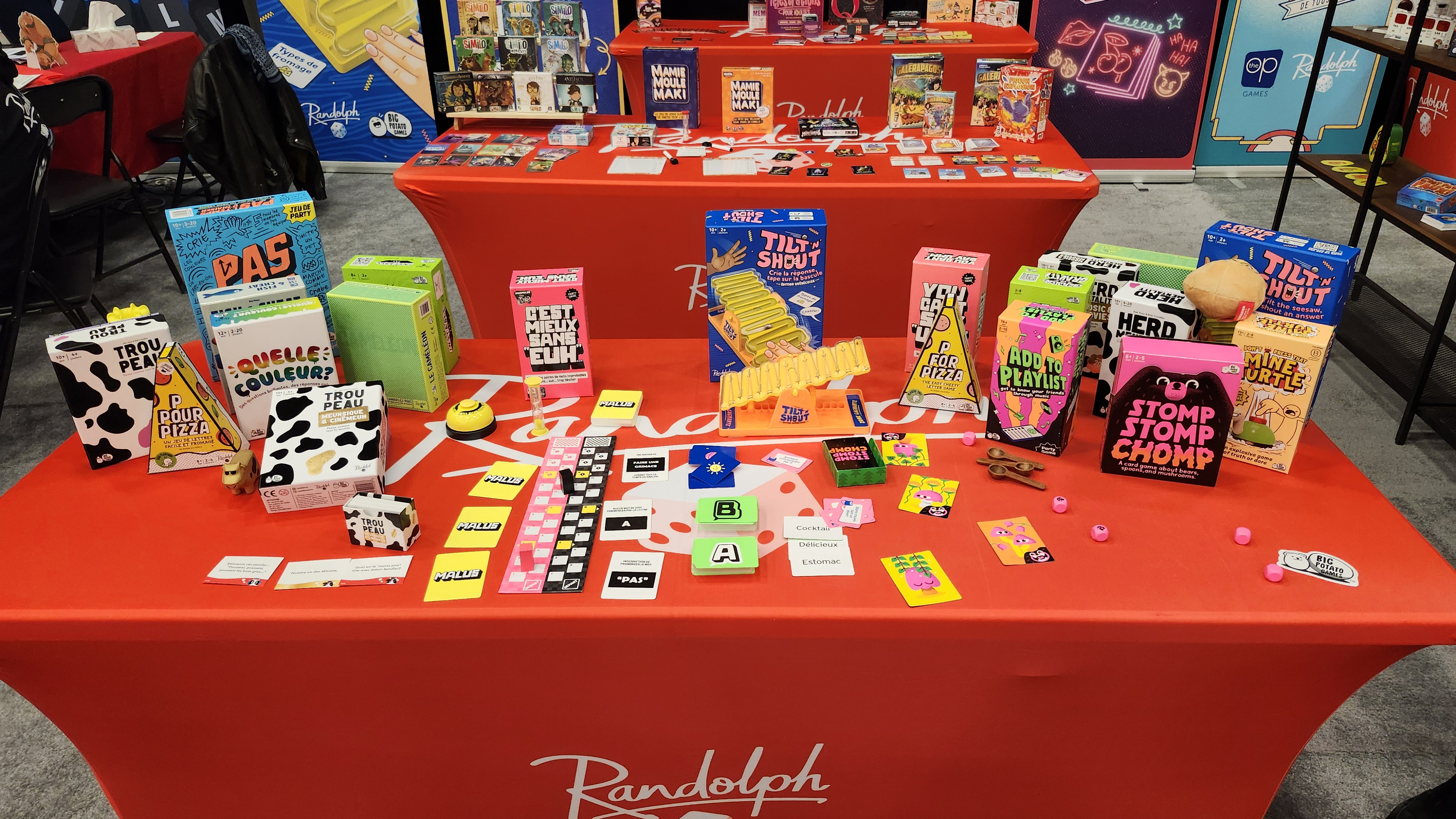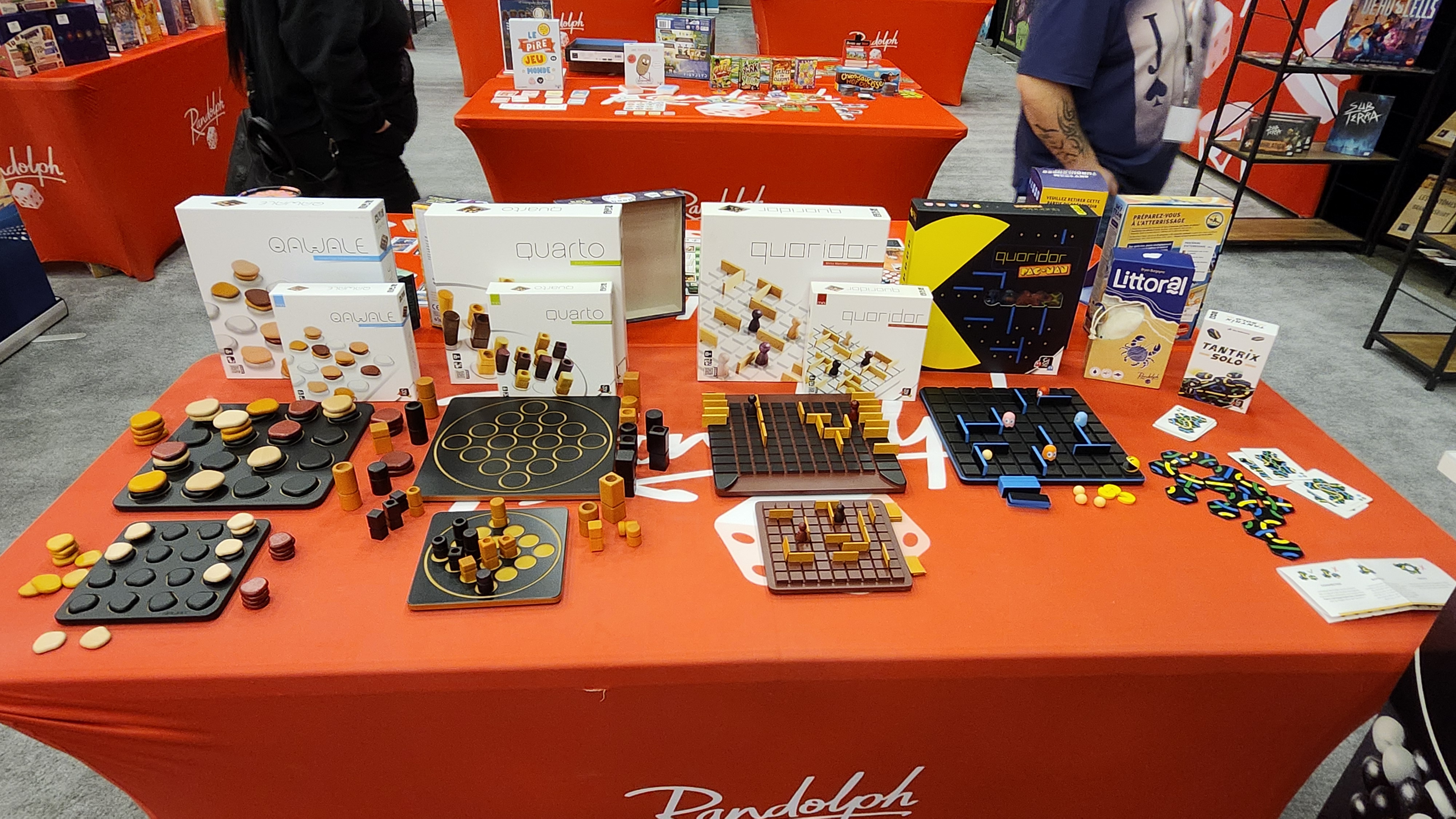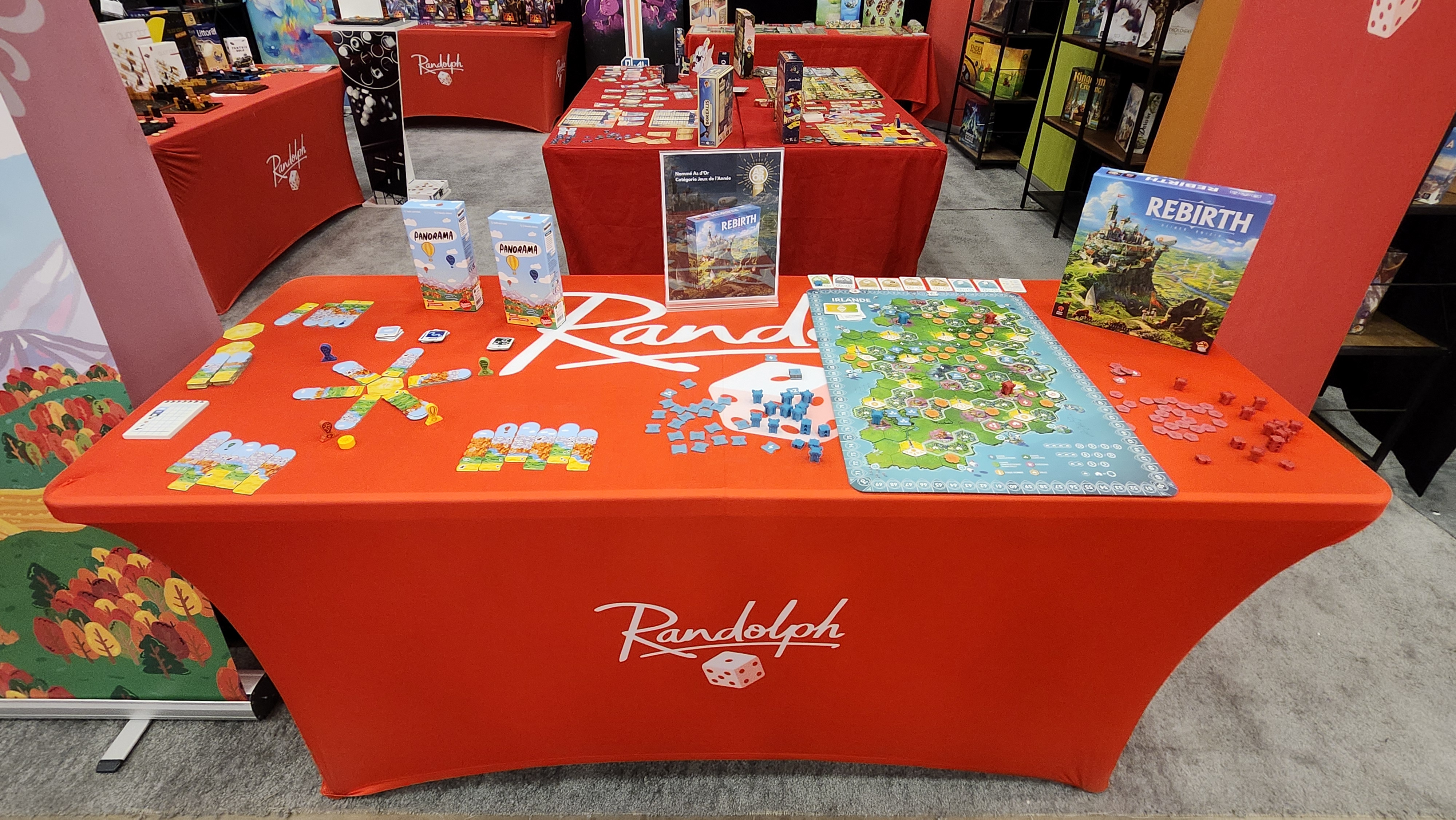 Randolph avait aussi une tonne de jeux délirants en démonstration. Dès notre arrivée à leur kiosque, nous avons été accueillis par Gilles, qui nous a montré toutes les nouveautés intéressantes et les succès de la dernière année. Nous avons pu voir de près Hues and Cues dont la version française sera bientôt disponible, et des jeux comme Dice Throne, Coin Up! (qui sera en vente dès juillet 2026), Quoridor et Rebirth. Nous devons avouer que plusieurs de ces titres nous ont fait saliver!