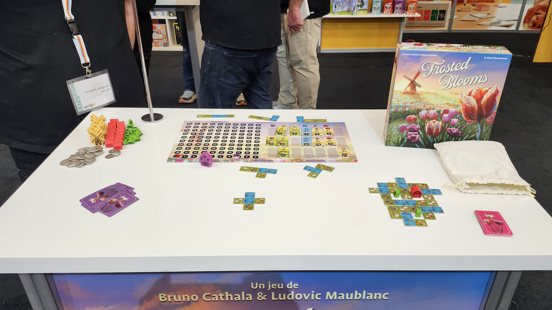 Asmodee Canada étant le distributeur qui nous a invités à cet événement, nous en avons profité pour visiter leur espace en premier en allant récupérer nos passes. Il faut avouer que nous avons été épatés! Premièrement, nous avons eu droit à une présentation de Frosted Blooms, le nouveau jeu de Bruno Cathala et Ludovic Maublanc. Il s’agit d’un jeu de placement de tuiles hautement stratégique avec une thématique unique! Le jeu est franchement intéressant et nous sommes impatients de pouvoir ajouter ce bijou à notre ludothèque!