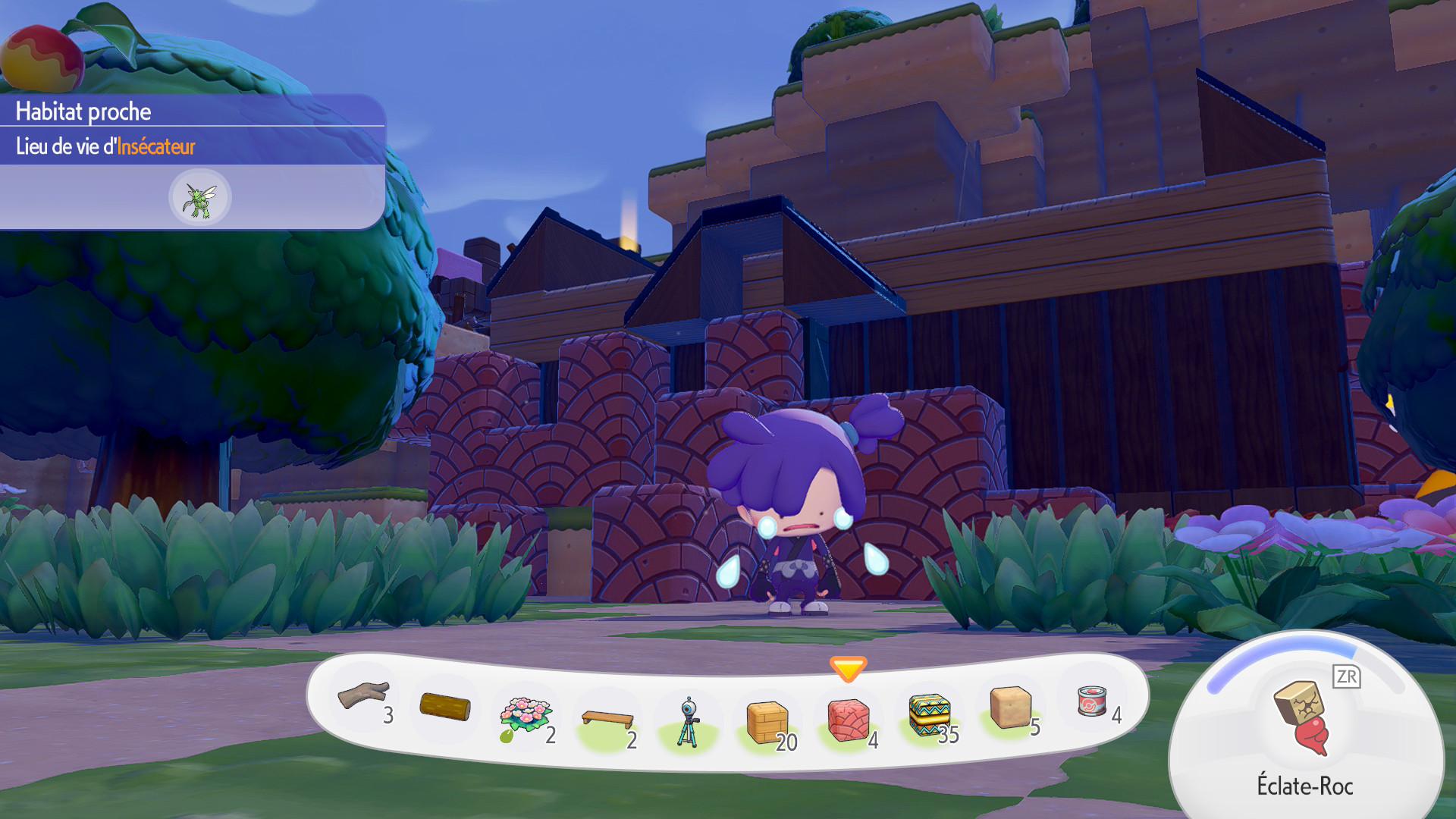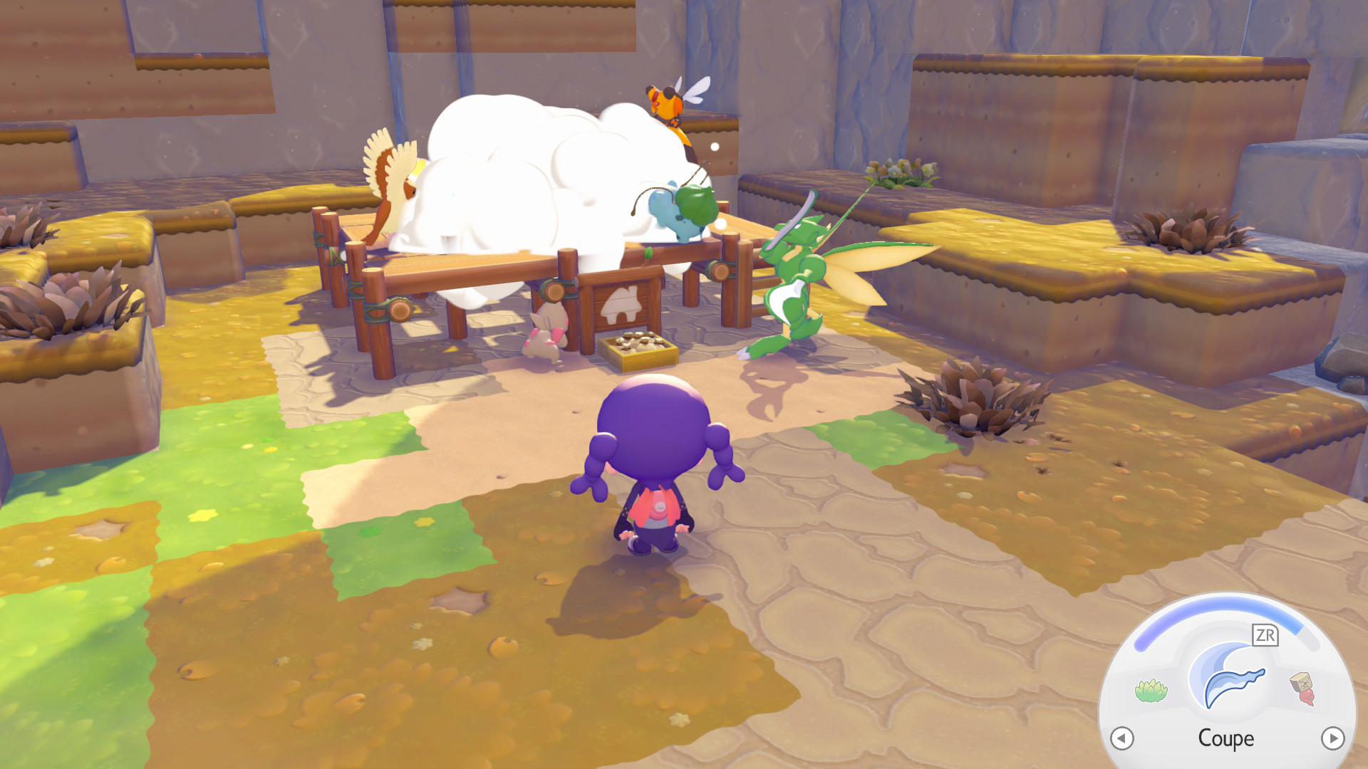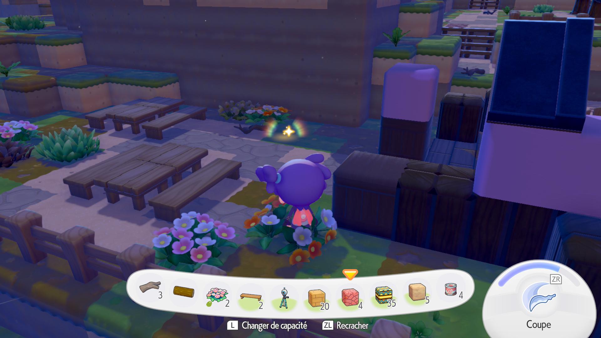 Commençons par parler de la construction d’habitat et du modelage de l’environnement. Vous pouvez construire des habitats adaptés pour que certains Pokémon puissent y apparaître. Pour attirer de nouveaux compagnons, vous devrez répondre à leurs besoins en créant des habitats qui les attirent. Ces habitats sont composés de plusieurs objets, herbes ou fleurs. Un exemple de ceux-ci serait quatre parcelles d’herbes qui se touchent, pour faire apparaître Bulbizarre ou Salamèche. Il y a aussi des conditions plus complexes, comme devoir placer une table avec un tabouret, une assiette et un fruit pour attirer Gloupti, le Pokémon qui offre du rangement. Les conditions exactes sont souvent difficiles à trouver, mais vous trouverez ici et là des indices qui vous permettront d’aboutir à une conclusion. Les indices apparaîtront sous la forme d’un arc-en-ciel qui brille. Interagir avec cet arc-en-ciel vous donnera un indice qui se retrouvera immédiatement dans votre Habitadex. Cet outil est un genre de Pokédex, mais pour les habitats. Il vous donnera des indices sur la disposition des objets à placer pour créer un habitat et il vous informera sur les Pokémon qui pourraient y apparaître. Il faut garder en tête que la météo et l’heure de la journée peuvent influencer les Pokémon susceptibles d’apparaître. C’est un facteur important à considérer lorsque vous cherchez à en attirer un en particulier.
