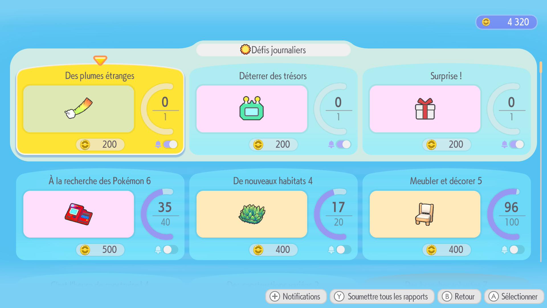 Vous aurez aussi des quêtes pour progresser dans votre aventure ou trouver des Pokémon spécifiques. Le jeu est rempli de choses à faire et j’adore ça! On ne s’ennuie jamais et l’on a toujours quelque chose à faire pour nous tenir occupés. On ne voit vraiment pas le temps passer! Vous aurez aussi des défis journaliers et pleins de choses que vous pourrez acheter avec les pièces « Poké Vie » que vous accumulerez en terminant les défis. Vous pouvez aussi compléter des missions secondaires et donner des cadeaux à vos amis les Pokémon. Les cadeaux renforceront votre niveau d’amitié, comme dans les autres jeux du genre. Les interactions qu’ils ont entre eux ou avec vous sont souvent beaucoup trop adorables, vous voudrez tous qu’ils soient vos meilleurs amis. Il y a aussi plein de lettres, et de Pokéball cachées un peu partout qui vous donnent des cadeaux ou qui vous renseignent sur les événements passés.