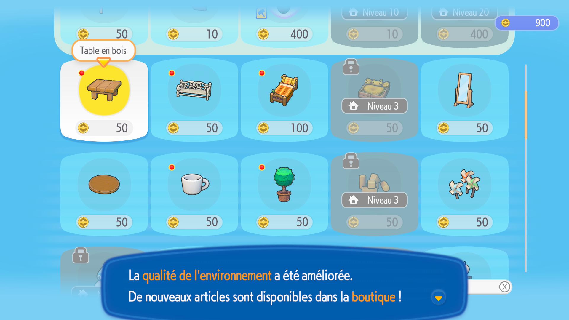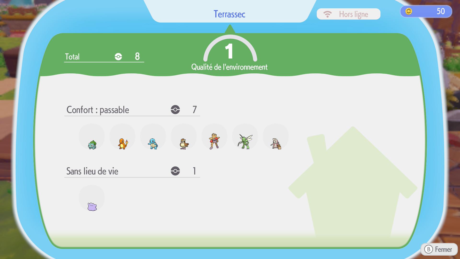Cependant, les habitats les attirent, mais ils ne suffiront pas à garder vos habitants heureux. Vous pouvez interagir avec eux et choisir l’option « Parle-moi de ton confort » pour savoir quel élément pourrait améliorer leur milieu de vie. Ils peuvent avoir besoin de choses très précises, comme de la nourriture, des jouets, plus de lumière, ou même une maison. Ces petits changements dans leur environnement augmenteront leur qualité de vie. Plus vos amis sont heureux et confortables, plus la qualité de l’environnement augmentera. L’environnement pourra atteindre un niveau maximal de 10, ce qui veut dire que vous avez construit le milieu de vie idéal pour tous vos compagnons. C’est beaucoup de travail, mais c’est aussi très satisfaisant de voir tous nos Pokémon au sommet de leur bonheur! De plus, plus la qualité de l’environnement augmentera, plus vous aurez de nouveaux articles à acheter! C’est une motivation suffisante pour souhaiter que tous nos monstres de poche soient heureux!