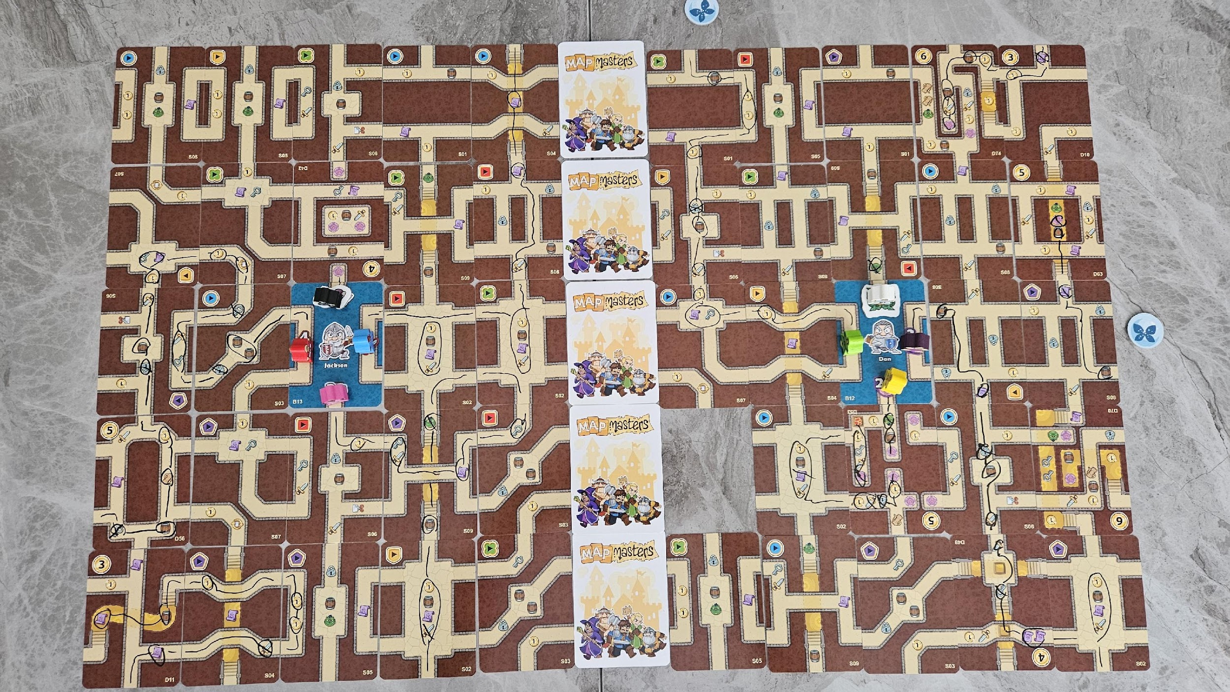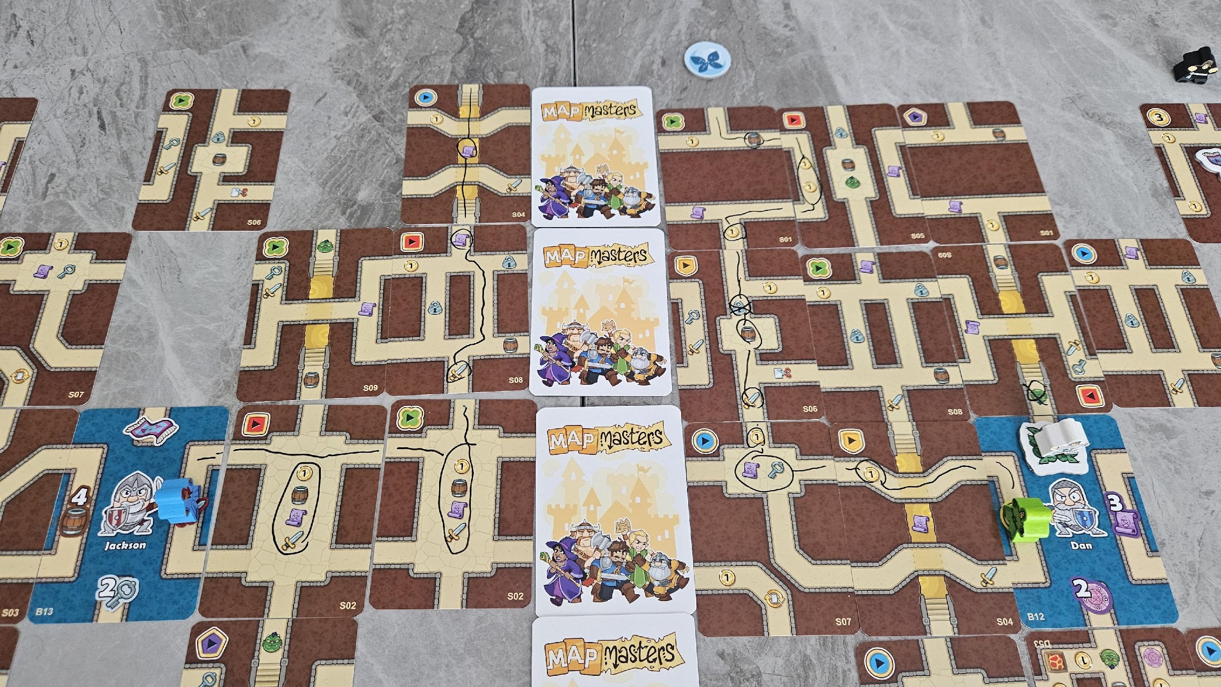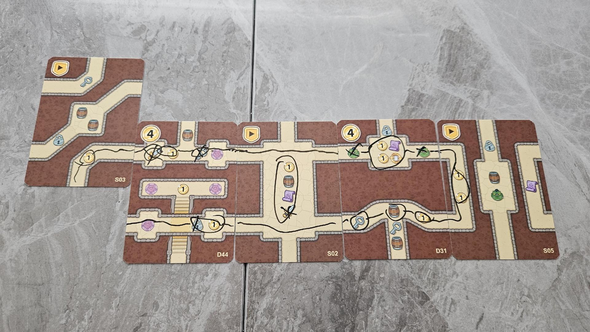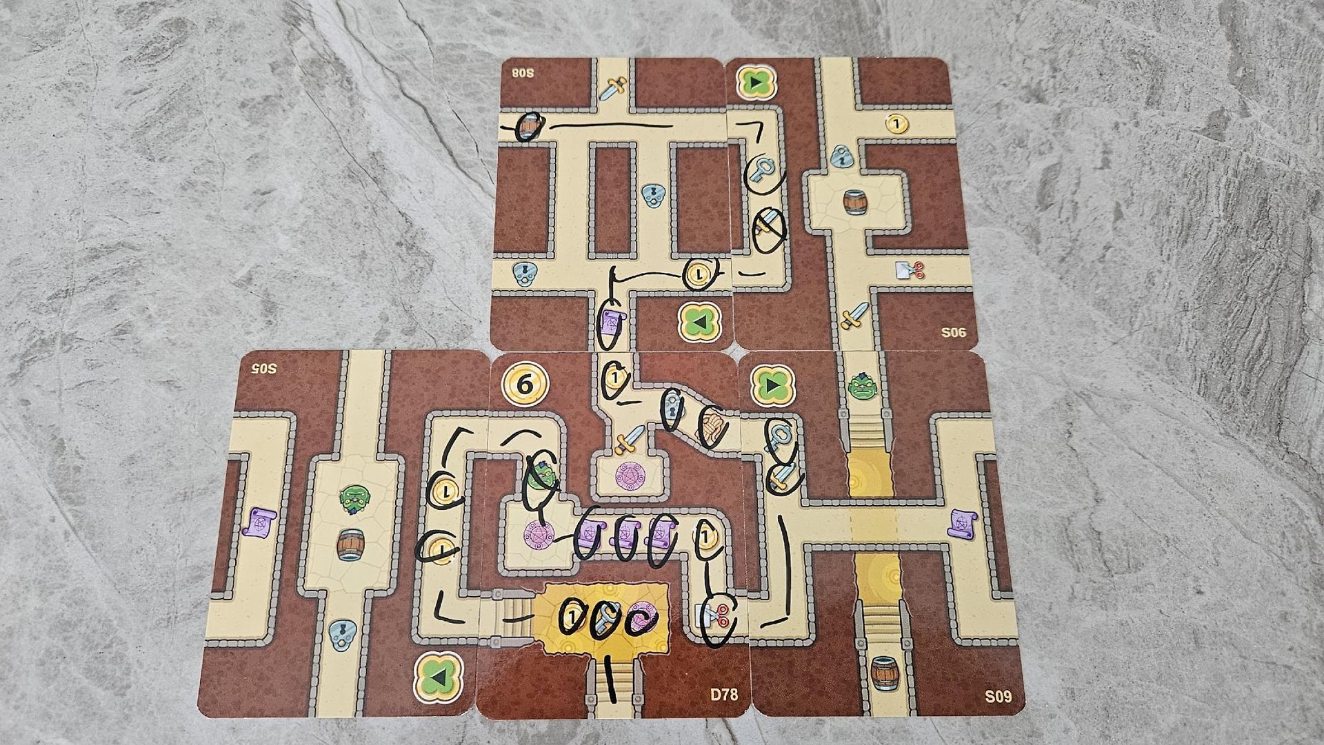 Par contre, en début de partie, chaque joueur pige trois cartes (quatre cartes en solo). Donc, plus vous aurez de joueurs, plus vous aurez de cartes avec lesquelles travailler. À tour de rôle, les joueurs ajouteront une carte au donjon. Les cartes des joueurs viendront combler les espaces vides sur l’espace de jeux et ainsi permettre aux différents groupes de récupérer des icônes sur la carte et de rejoindre le boss pour le vaincre. Il faudra récupérer un certain nombre d’épées, de parchemins, de barils, et plus encore et, pour y arriver, c’est ici qu’arrivent les crayons marqueurs. Après avoir joué une carte, et, si c’est possible de le faire, le joueur actif devra tracer un trajet entre un groupe et un objectif en ramassant tous les objets dans son chemin. Il est important de noter qu’à quelques exceptions, aucun groupe ne peut emprunter le même chemin plus d’une fois. Pas de retour en arrière, donc, et pas de groupe qui se suit. Si un groupe ne peut pas continuer et doit stopper sa progression à cause d’un cul-de-sac, la partie est perdue.