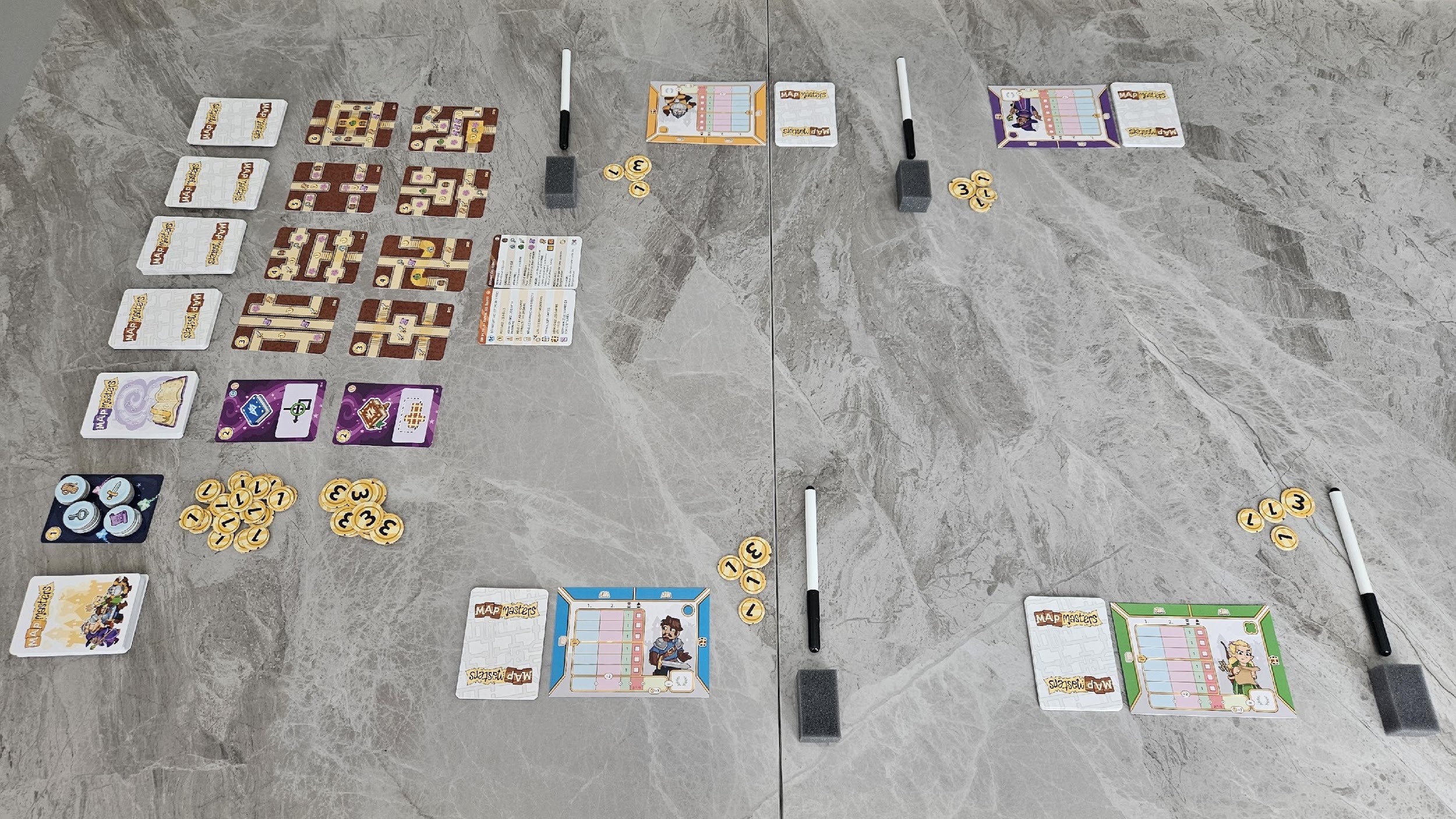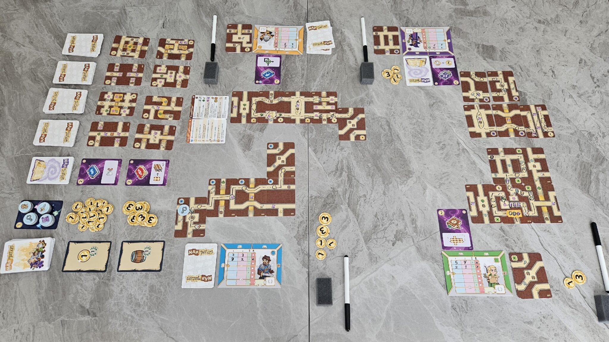Visuellement, Map Masters réussit à se distinguer grâce à sa boite qui indique clairement qu’il offre deux modes de jeu distincts. Le design est intelligent et pique immédiatement la curiosité. En ouvrant la boite, vous trouverez des jetons, des crayons et des cartes. Les cartes sont classées en différentes sections en fonction de leur utilisation, qu’elles soient destinées au mode coopératif ou au mode compétitif. Puisque Map Masters est un jeu dans lequel vous devrez tracer des routes sur des cartes, chaque joueur aura avec son feutre effacable et une petite éponge qui servira de gomme à effacer. Je dois dire que j’ai été agréablement surpris par la facilité et retirer le feutre des cartes qui ont un effet lustré avec l’éponge, ce qui est très bien, puisque c’est l’attrait principal du jeu.