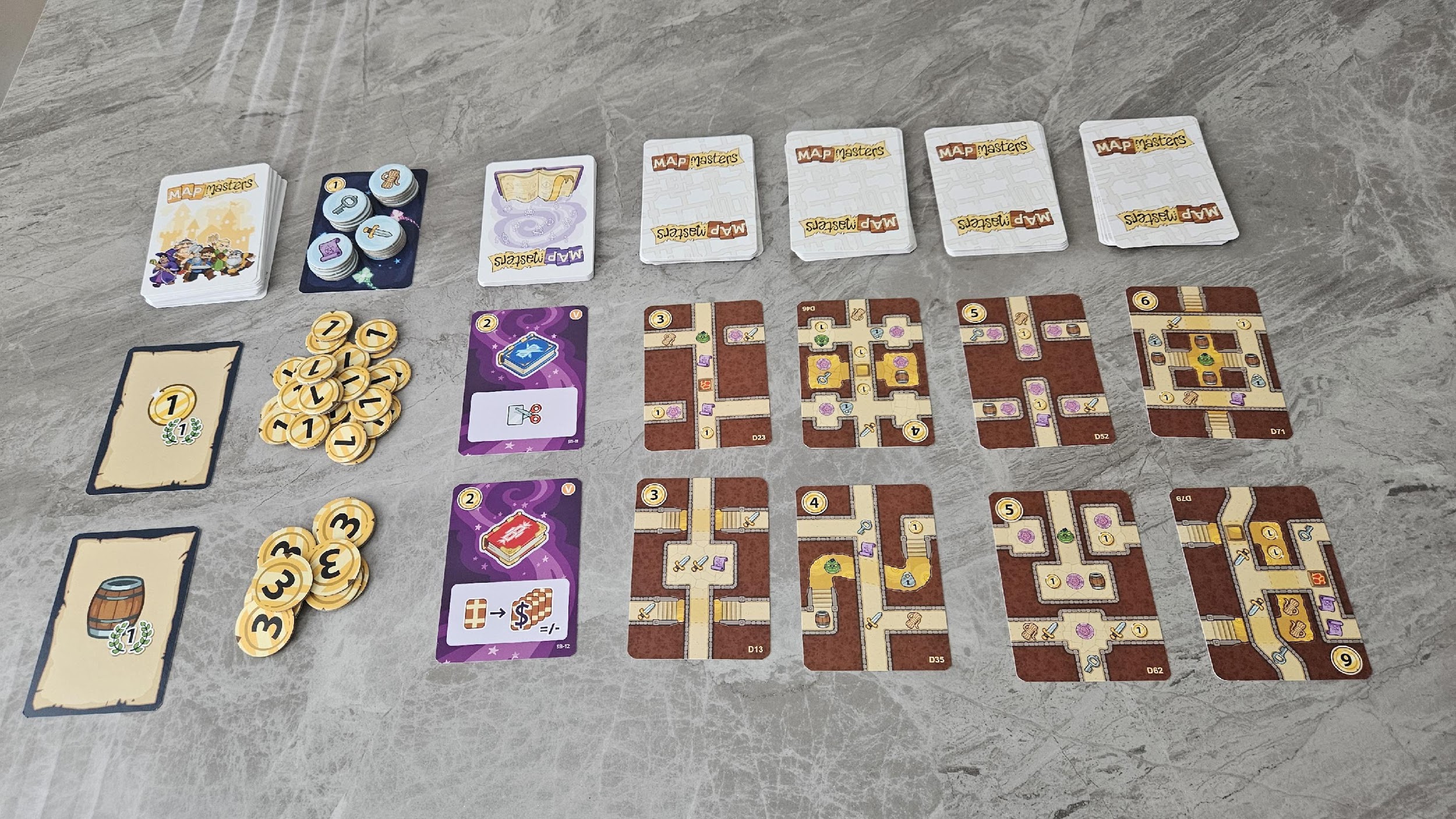 Une aventure dans un donjon est rarement une balade de santé. Cela demande de la planification, les bonnes ressources et les bons camarades. C’est exactement ce dont vous aurez besoin dans Map Masters, le tout nouveau jeu de Captain Games. Map Masters est créé par Ian Sebastian Bach (le designer de 2349: Space Prospectors, Baseball Highlights: The Dice Game et Centuries) et Cédrick Caumont (le designer de Mexican Hold’em Poker, Sides et cofondateur de Repos Production). Ce qui m’a attiré est assurément son esthétisme, mais aussi la possibilité de jouer autant en coopération que de façon compétitive. Nous y explorerons donc des donjons en traçant des routes sur les cartes qui les composent, et cela à travers deux différents modes de jeu. Dans cette critique, nous vous exprimerons notre ressenti sur ce titre qui nous promet richesse et trésors!