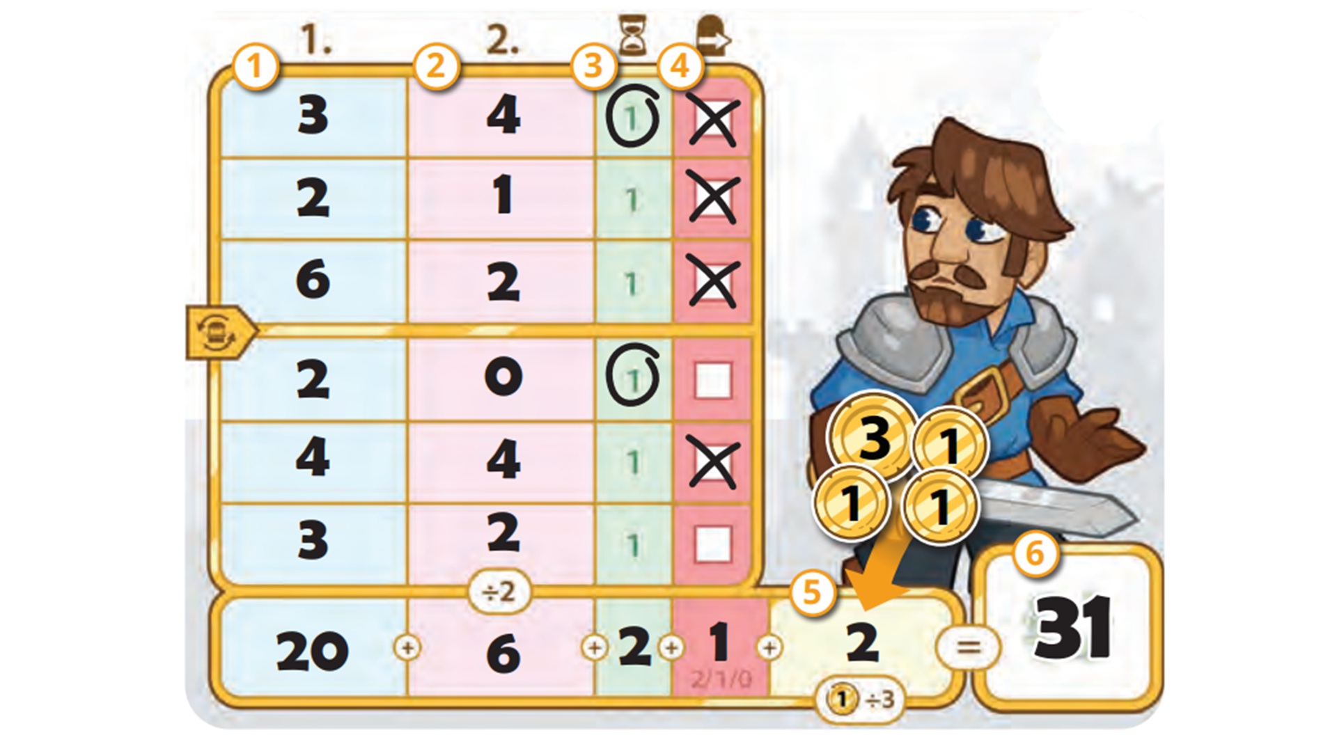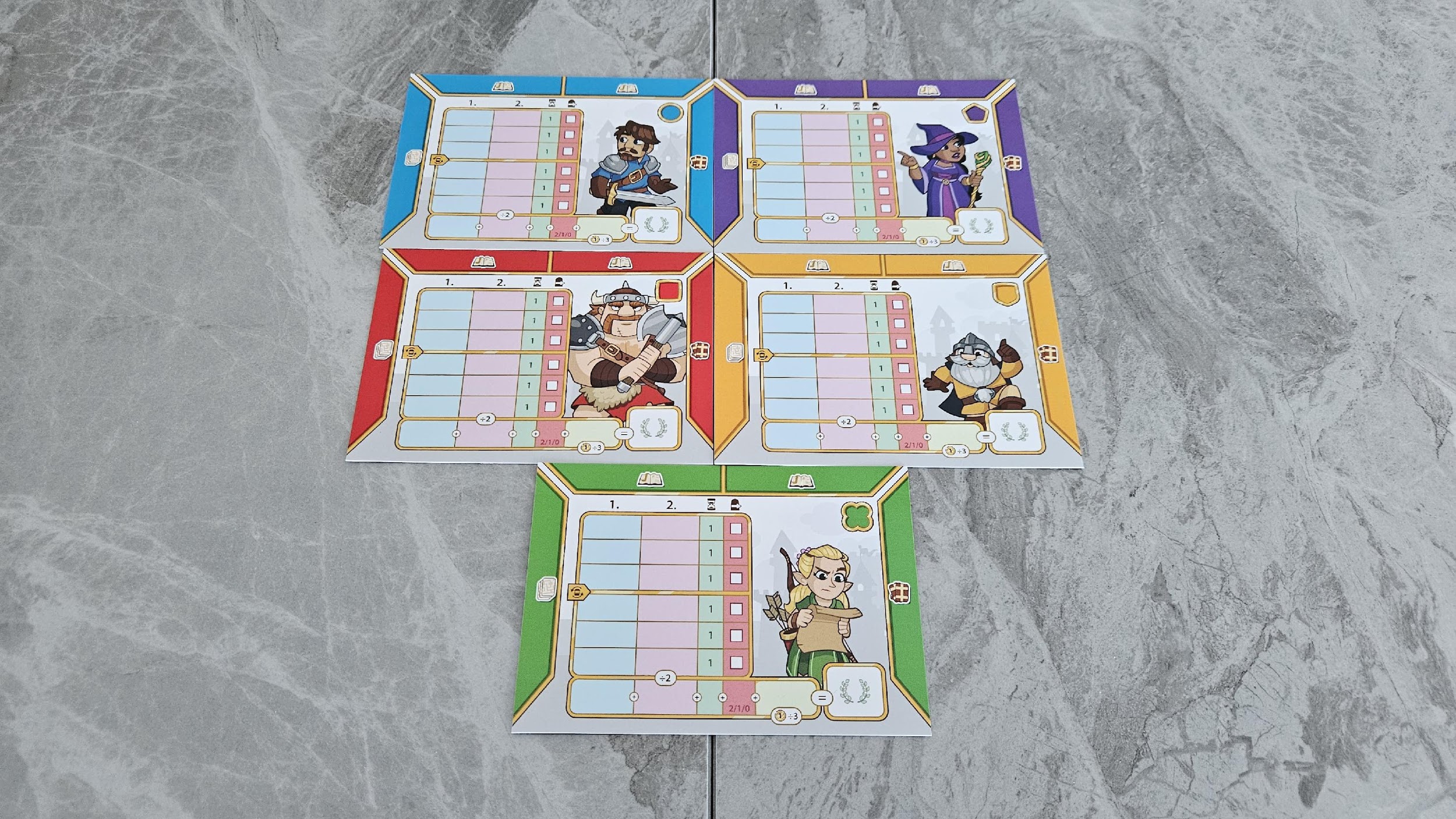 Lorsque les joueurs auront créé leur donjon, ils devront tracer une route et compter les pièces d’or qu’ils ont ramassées, vérifier s’ils ont accompli des objectifs et s’ils ont reçu des points bonus pour les objectifs principaux et les objectifs secondaires (qui sont dévoilés seulement une fois le trajet tracé). Il y aura aussi un calcul qui sera fait lorsque certaines cartes indiqueront qu’il faut se dépêcher. Ainsi, le premier à terminer son trajet dans le donjon remportera un point de plus. De plus, les joueurs ayant quitté le donjon l’indiqueront sur leur carte de pointage. En fin de partie, des points seront attribués aux joueurs qui sont sortis du donjon le plus souvent, soit en entrant par une bordure de carte et en ressortant par une autre extrémité. Bien que les points des objectifs secondaires soient divisés en deux à la fin de la partie, j’ai moins aimé cet aspect du scoring. N’étant dévoilés qu’une fois le trajet tracé, les objectifs secondaires obligent les joueurs à maximiser leur trajet et à ramasser le plus d’objets possible, mais cela ajoute aussi un aspect aléatoire à un jeu autrement très stratégique.