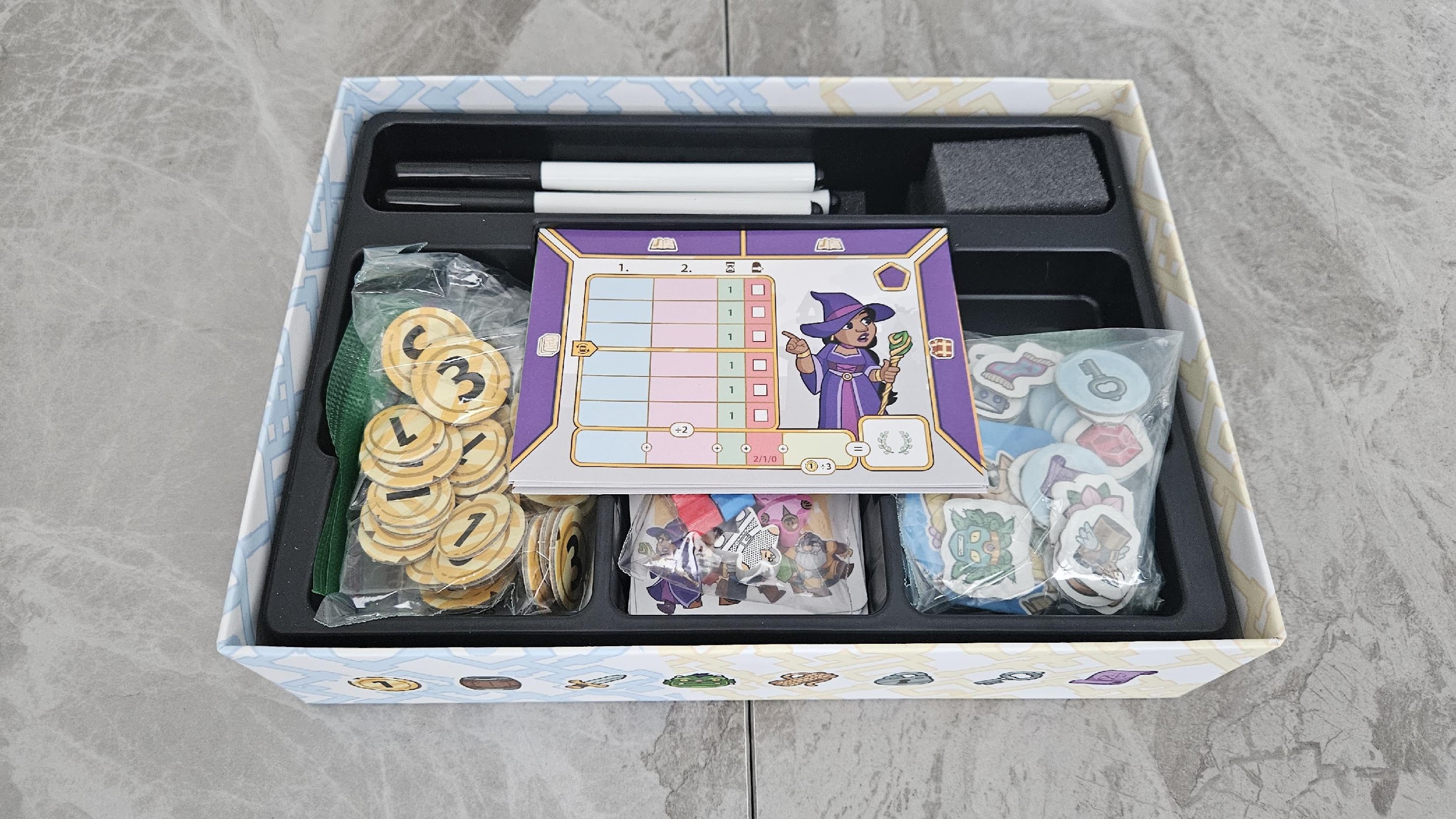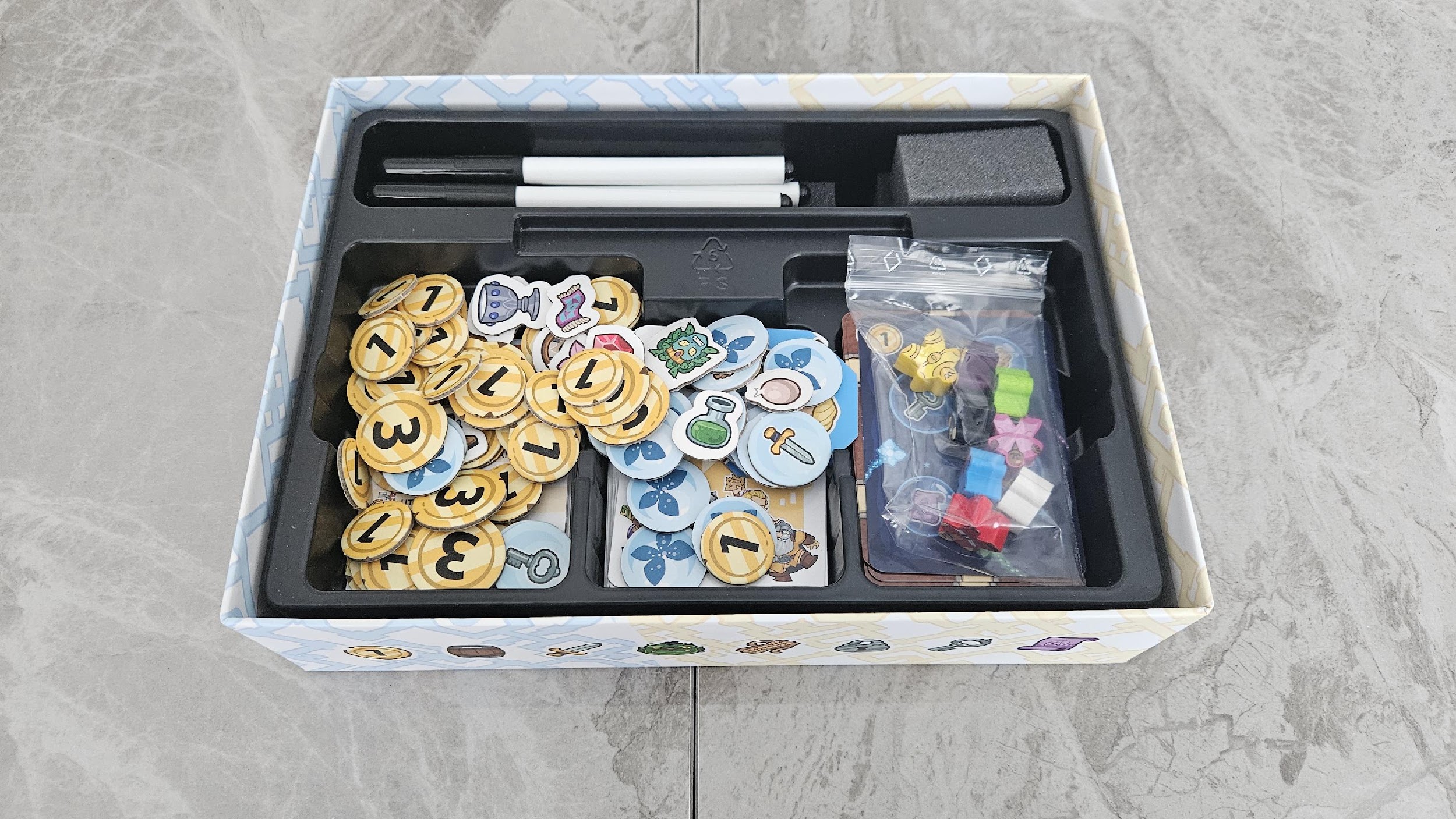 Tous ces éléments sont rangés dans un insert efficace, mais pas optimal. J’aurais aimé que les cartes soient mises sur le côté avec des séparateurs pour chaque catégorie au lieu d’être mises à plat dans des compartiments. Il y a trois compartiments pour au moins six catégories, selon la manière de les séparer. De plus, il n’y a pas de compartiment pensé explicitement pour les jetons et un seul sac est fourni pour ranger ces derniers.