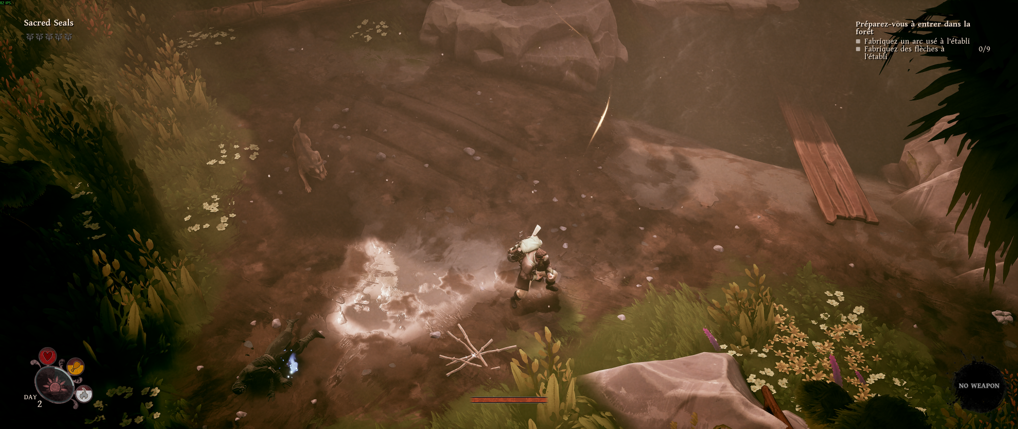 Au début, les affrontements sont particulièrement difficiles. Faire face à plusieurs ennemis représente un véritable danger, notamment en raison du manque d’agilité du personnage. Cette difficulté contribue à instaurer une tension constante. Cependant, cette intensité diminue très rapidement. Une fois que nous avons accès à l’arc et que les comportements ennemis sont assimilés, les combats deviennent plus prévisibles. Toutefois, les ennemis ne sont pas particulièrement variés et ce manque de variété se fait de plus en plus ressentir en progressant dans l’aventure.