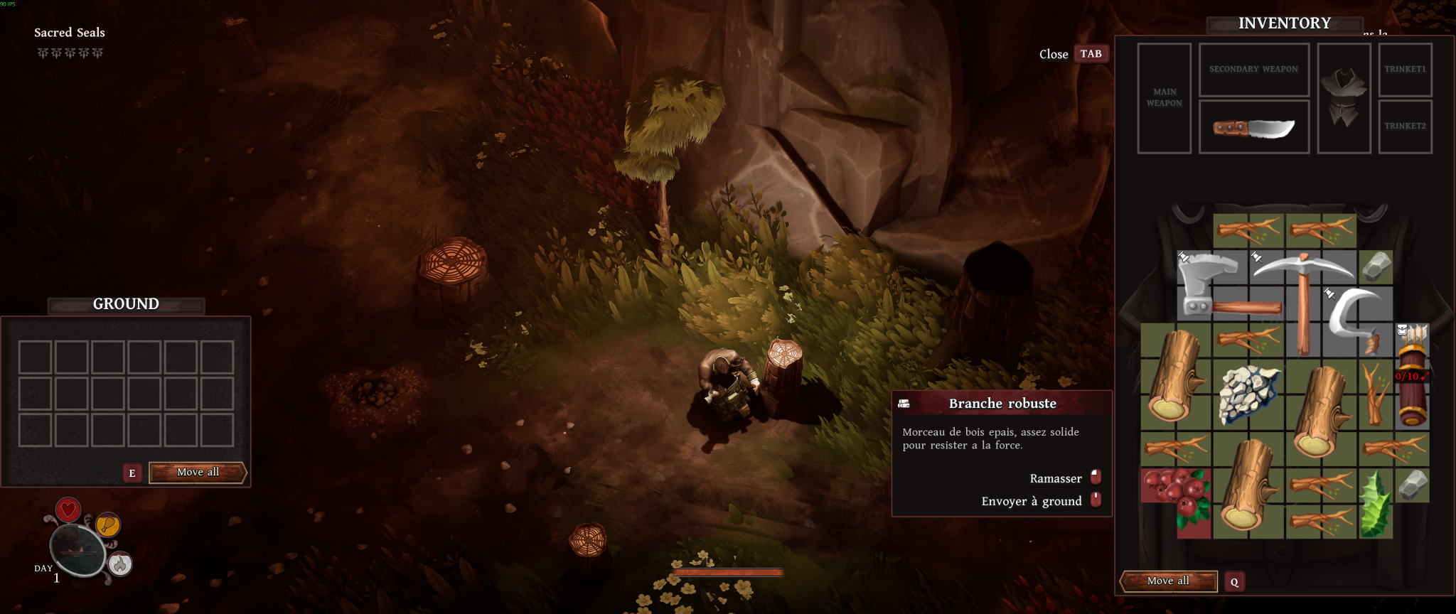 Le sac à dos introduit une mécanique intéressante et originale où chaque objet possède une forme spécifique, transformant la gestion d’espace en un genre de Tetris. Cette idée fonctionne bien, mais nous oblige à faire de courtes expéditions, puisque l’on est toujours encombré. Cet aspect devient moins problématique lorsque l’on augmente la taille de l’inventaire en ajoutant des poches supplémentaires à notre sac à dos. Le système de stockage au campement compense partiellement cette limitation, mais crée une incohérence dans la gestion globale. La nuit change, elle aussi, radicalement la dynamique du jeu. Pendant la nuit, lors de l’exploration, les ténèbres nous poursuivent et il faut trouver une zone sécurisée sans quoi la mort est assurée. Avec le temps, une routine s’installe. On optimise chaque action, chaque déplacement, chaque ressource, et l’on se méfie du noir!