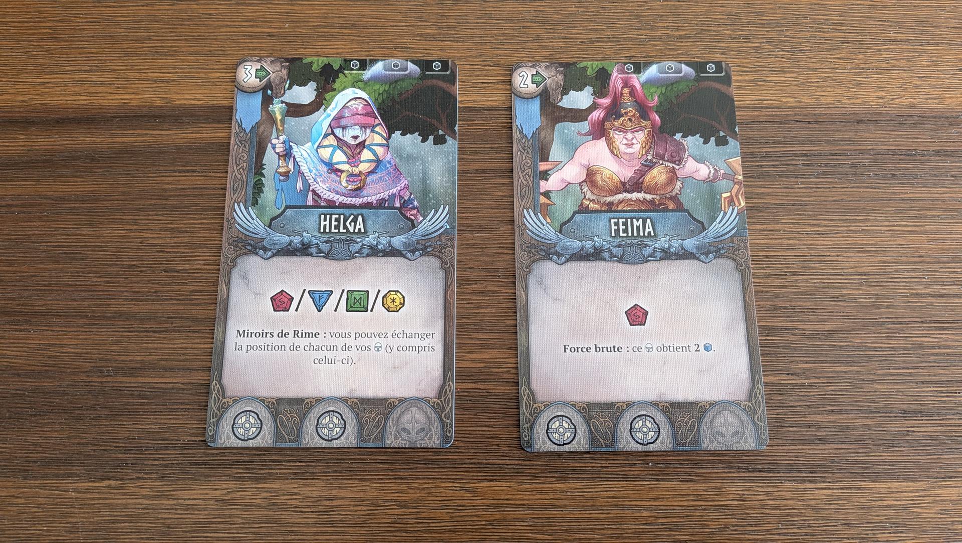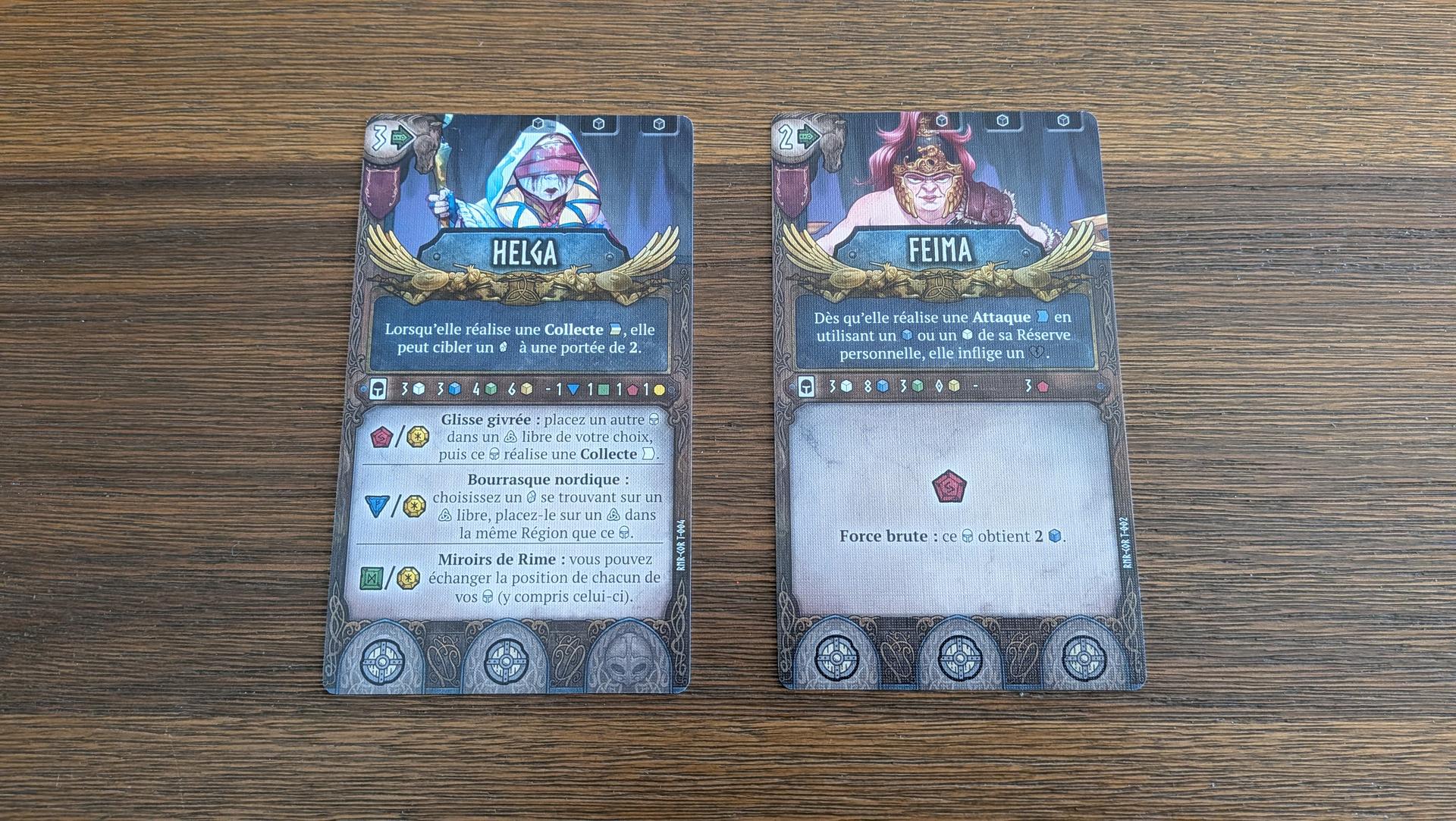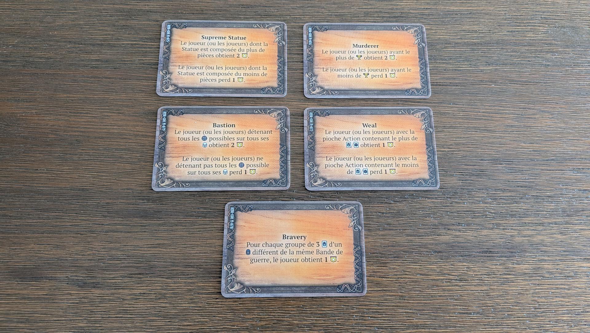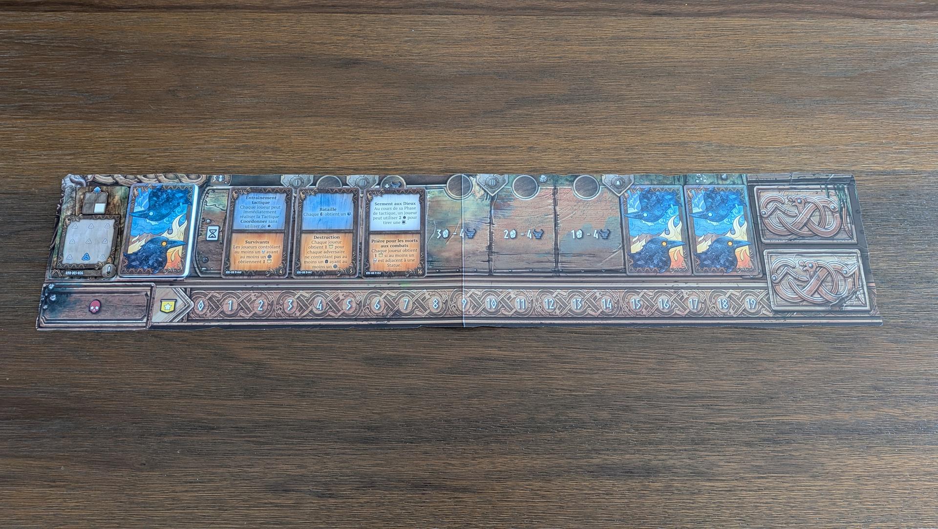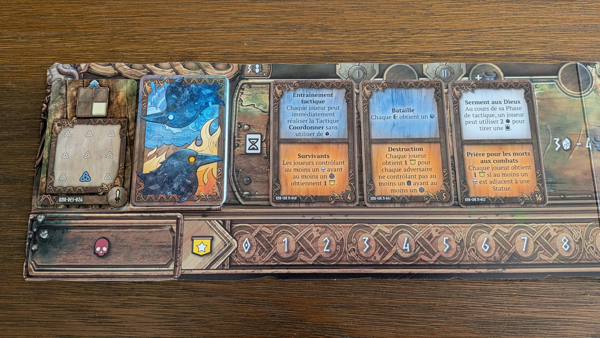 Pour gagner la partie, les joueurs devront marquer des points de victoire. Il y a plusieurs façons de marquer des points, soit en plaçant la flamme sur votre statue, en infligeant des dégâts aux joueurs adverses, en éliminant des figurines ennemies, en récoltant des cristaux ou en accomplissant des missions et des objectifs secondaires. Dans Runar, chaque point de victoire peut faire la différence entre la victoire et la défaite. De plus, la Némésis peut emporter la partie s’il réussit à marquer plus de points que les joueurs. Vous aurez donc une pression constante qui vous obligera à ne pas ignorer la Némésis tout en gardant un œil sur vos adversaires. Vous obtiendrez un point pour chaque cristal ramassé, un point pour avoir complété votre statue, un point pour chaque trio de cartes ennemies accumulées lors des attaques, un point pour vaincre un pion ennemi, des points selon la figurine Némésis vaincue et selon les objectifs accomplis. Bref, vous aurez plusieurs pistes de solution pour remporter la partie et chacune d’elles s’équivaut. Ce qui est important est d’adapter sa stratégie selon ce qui se passe sur le plateau et selon les objectifs dévoilés sur le plateau de destinée pendant la partie.