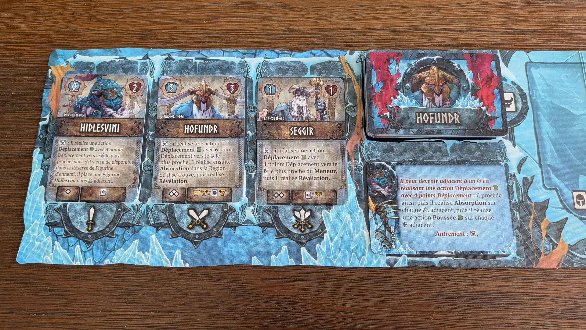 Si le scénario choisi utilise la Némésis, ce sera enfin son tour de jouer. Premièrement, ce que j’ai bien aimé de Runar, c’est que cette phase est plus simple que dans Black Rose Wars: Rebirth ou The Breach. Lorsque viendra leur tour de jouer, vous vérifierez quel ennemi est présent sur le champ de bataille. Si la carte sur le dessus du paquet « ennemi » représente un ennemi sur le champ de bataille, vous la pigerez et suivrez les instructions. Si ce n’est pas le cas, vous tirerez des cartes jusqu’à ce que vous tombiez sur celle d’un ennemi présent ou sur une carte qui indique l’effet « renaissance ». Dans tous les cas, vous résoudrez les effets sur la carte, puis vous passerez à l’étape « régénération des ennemis ».
