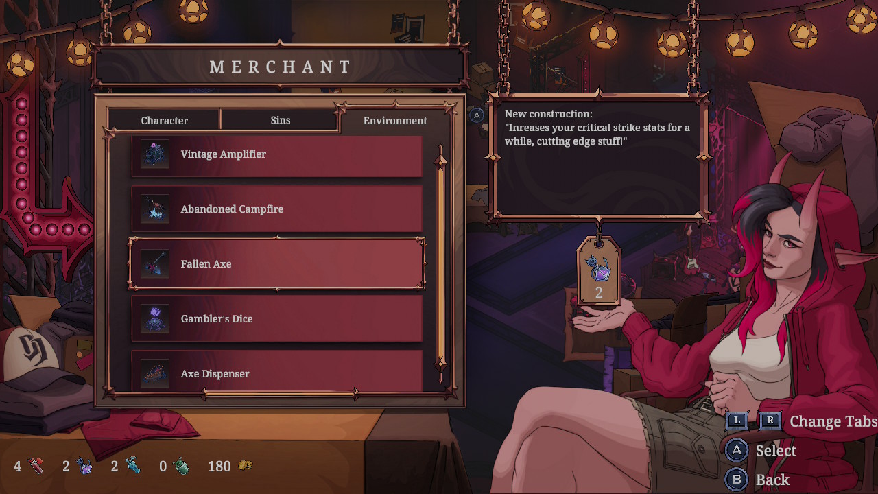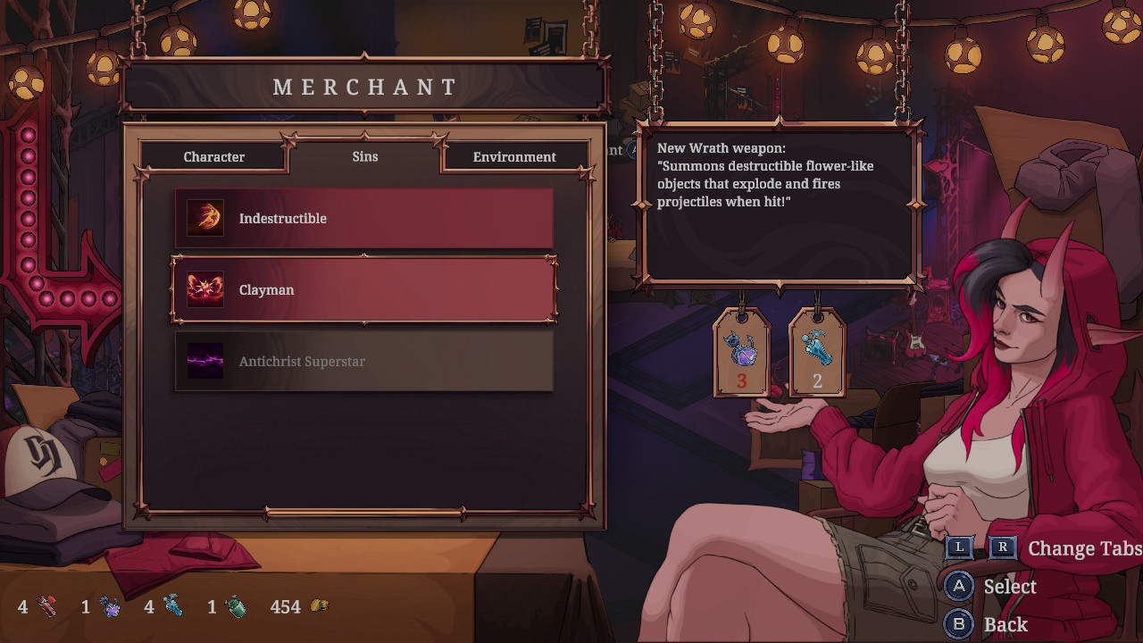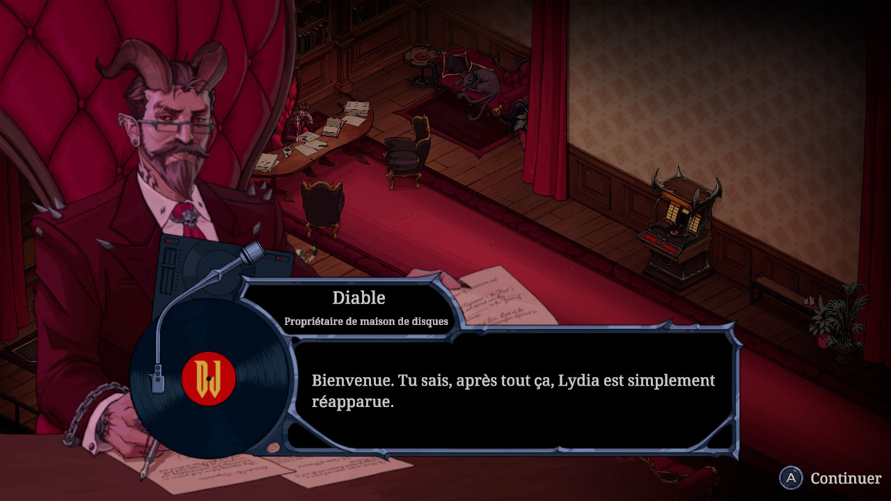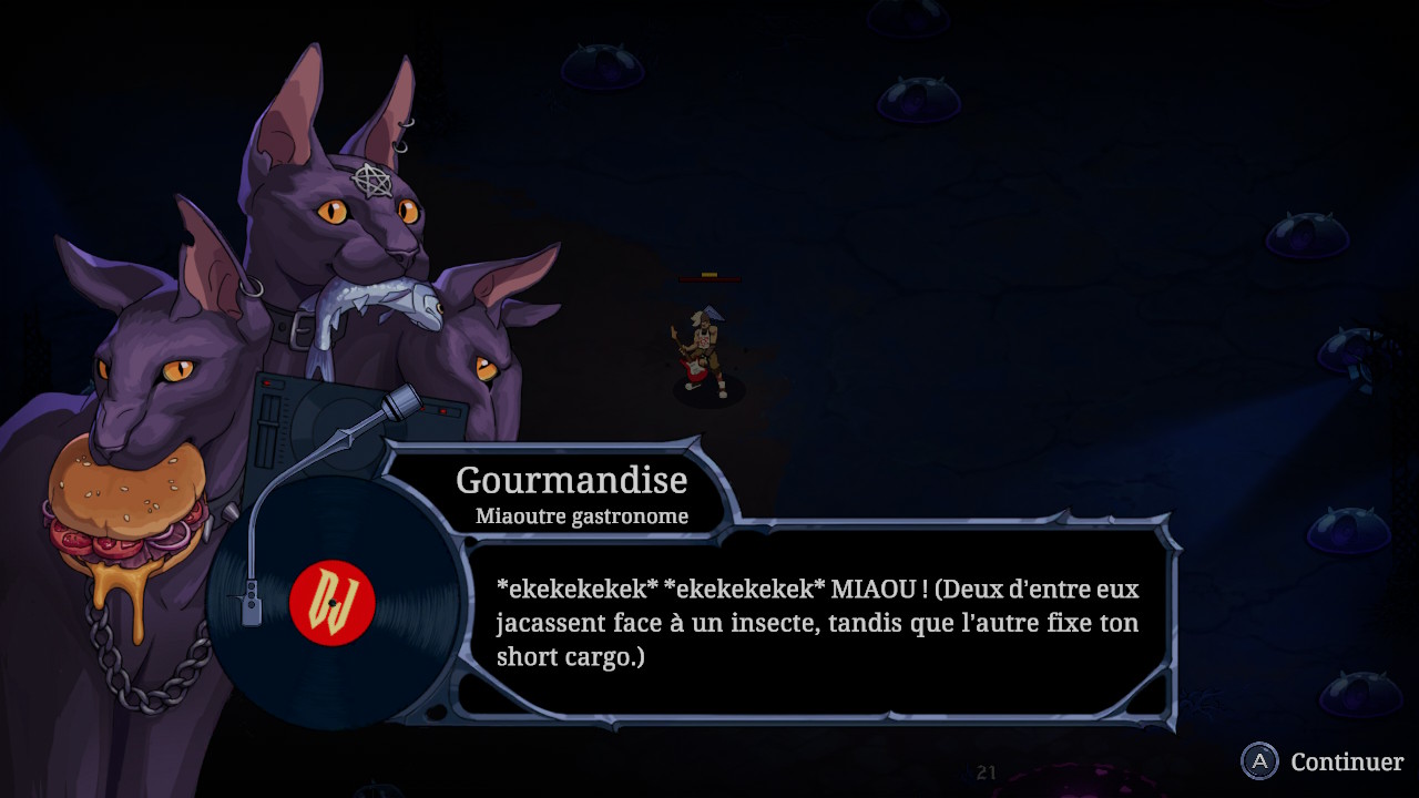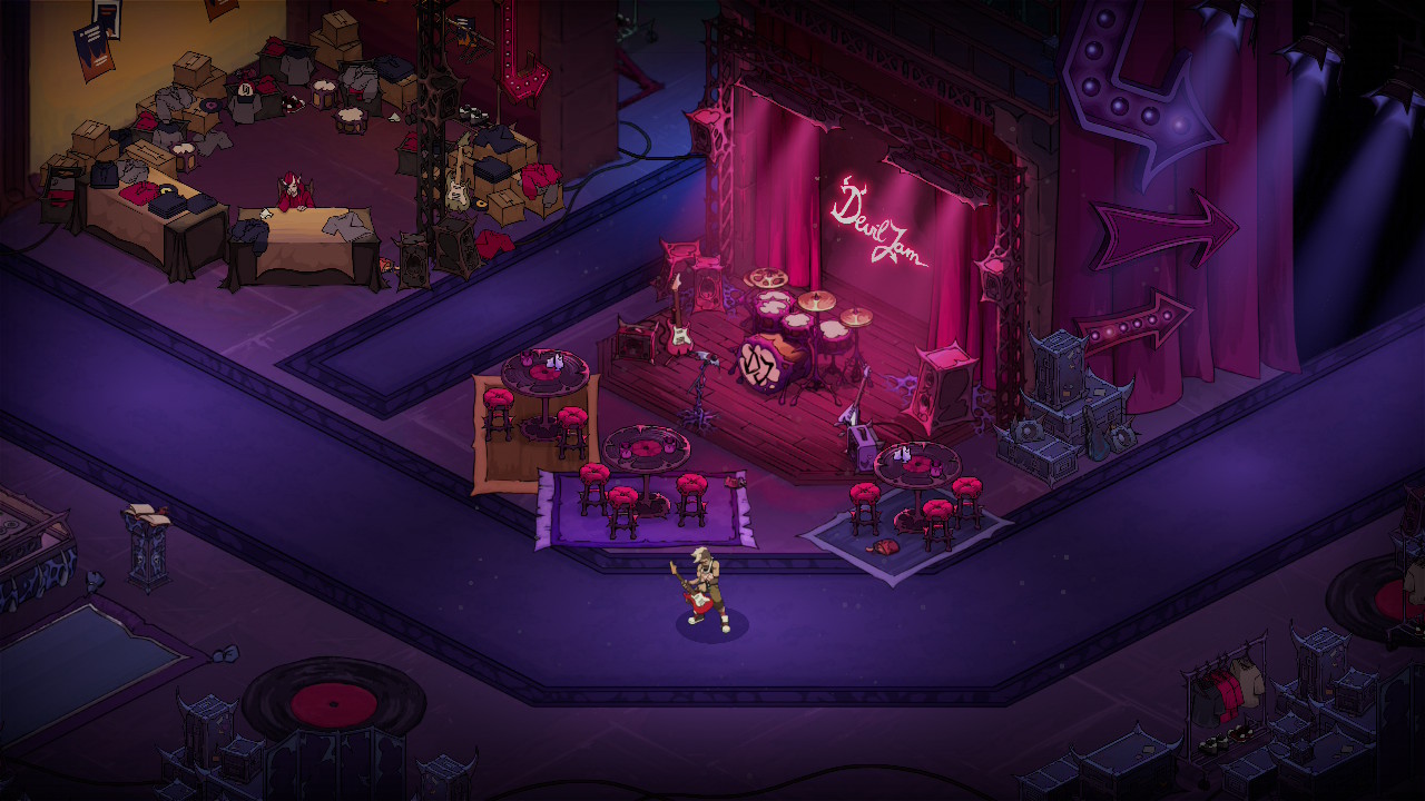 L’histoire se veut très simple. Progresser dans les missions déverrouillera de nouvelles scènes qui font progresser l’histoire, mais elles sont toutes relativement courtes. Vous pourrez aussi profiter de quelques petites interactions amusantes avec les péchés lorsqu’ils deviennent disponibles via les missions. Ce qui est intéressant, c’est que les interactions varient avec selon le membre du band choisi, ce qui apporte une petite touche rafraîchissante. En gros, on est appelé par le diable pour remplir un contrat (donc on sait pertinemment qu’on s’est probablement fait avoir quelque part), on chasse la mort et ses sbires, on fait vibrer notre guitare, et voilà. Ce n’est assurément pas le genre à vous tenir sur le bout de votre chaise en attendant de connaître la suite. Le jeu ne se prend jamais au sérieux, ce qui est agréable, mais j’aurais aimé plus de dialogues, ce qui aurait mis le thème davantage de l’avant.